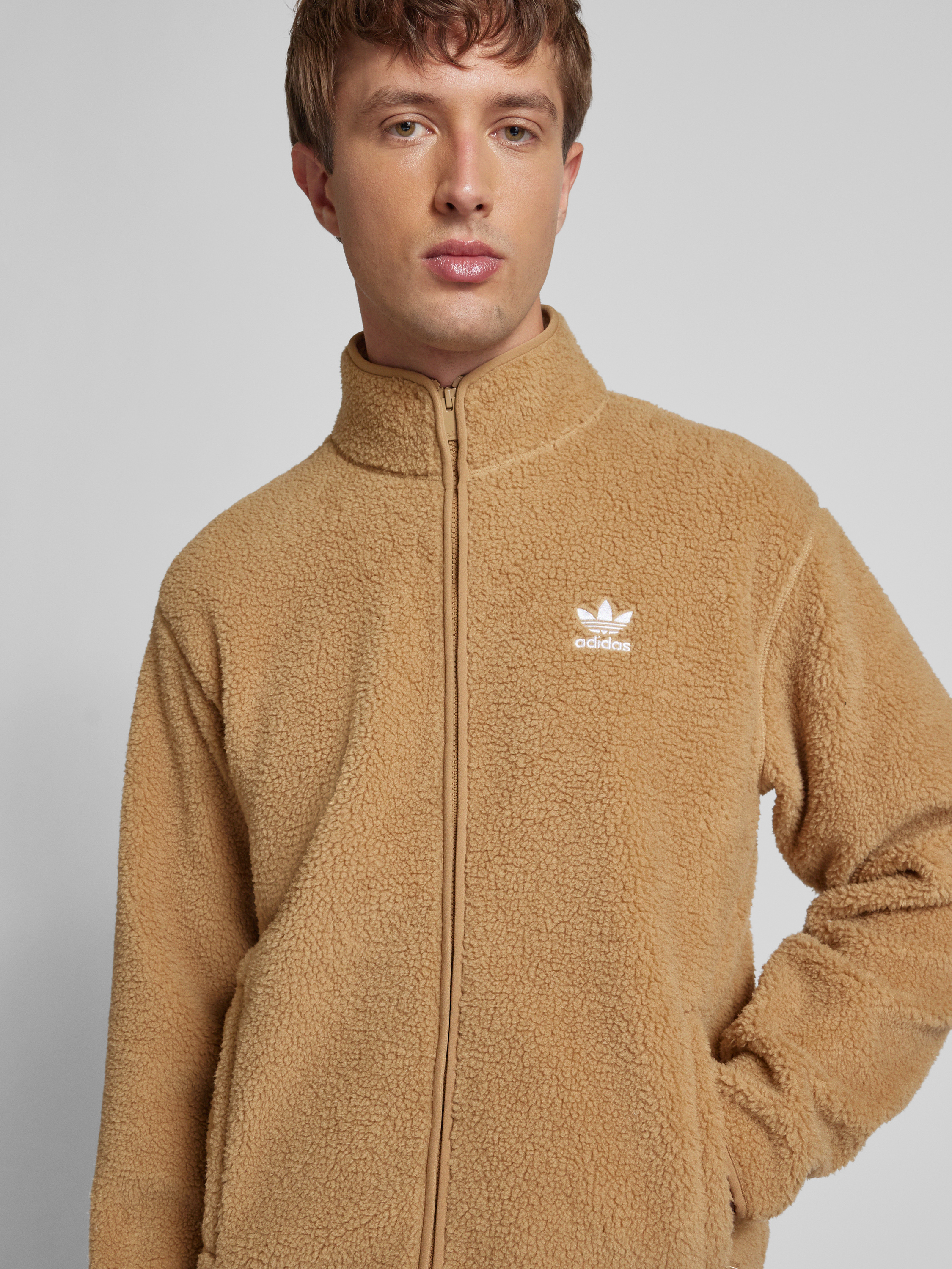 Die Herren Sweatjacke von adidas Originals im Regular Fit aus dem Modell 'Essentials' fühlt sich durch das weiche Teddyfell besonders angenehm an. Der gerade Schnitt sorgt für Bewegungsfreiheit, während der Stehkragen für einen sportlichen Akzent sorgt. Das dezente Logo-Stitching unterstreicht den lässigen Charakter im Alltag.