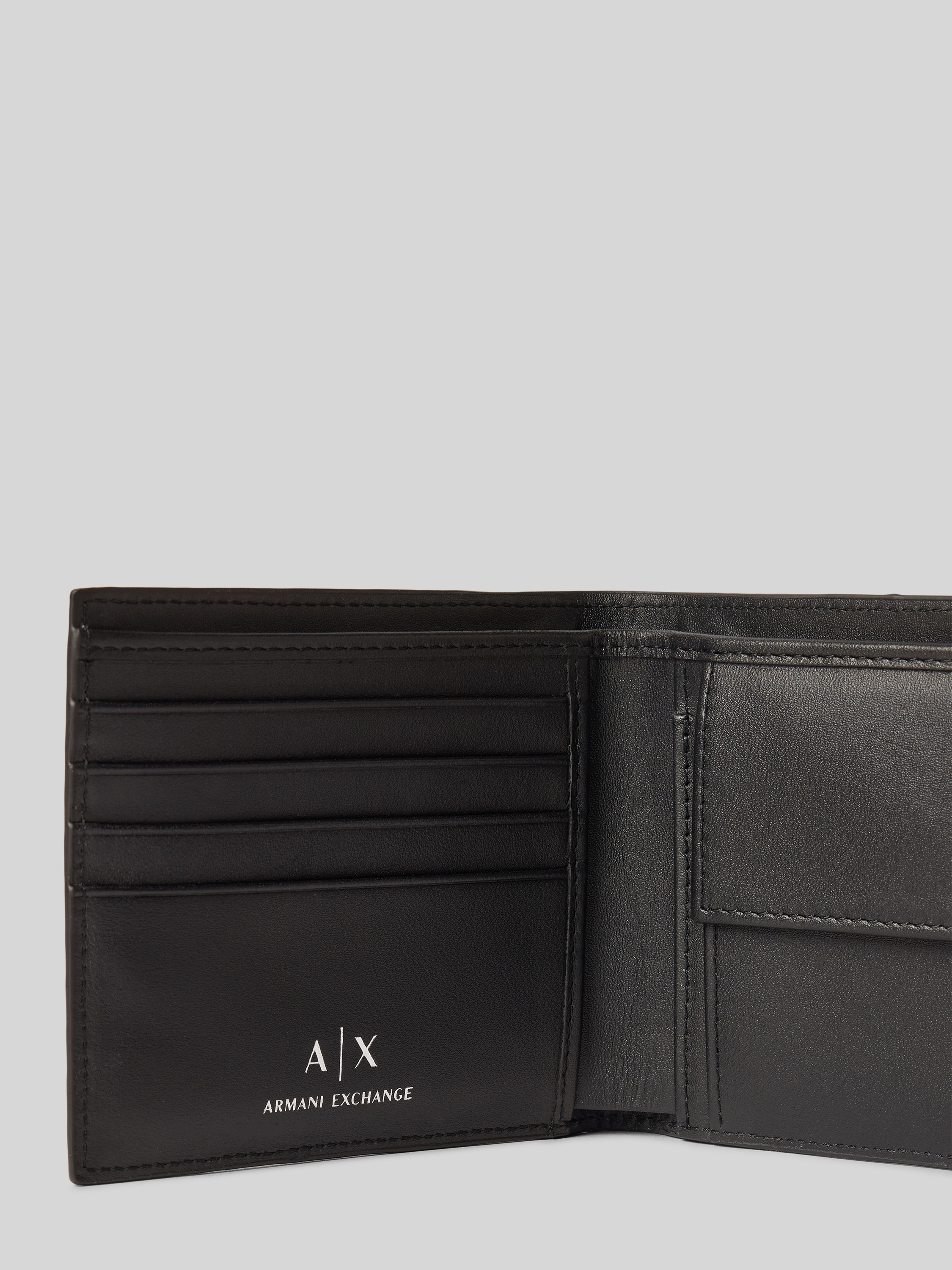 Das Herren-Portemonnaie von ARMANI EXCHANGE, Modell 'BIFOLD COIN', kombiniert Funktionalität mit einem eleganten Design. Es bietet ein offenes Hauptfach und zahlreiche Steck- sowie Kartenfächer. Ein Münzfach mit Überschlag sorgt für Ordnung, während die Label-Details einen stilvollen Akzent setzen.
