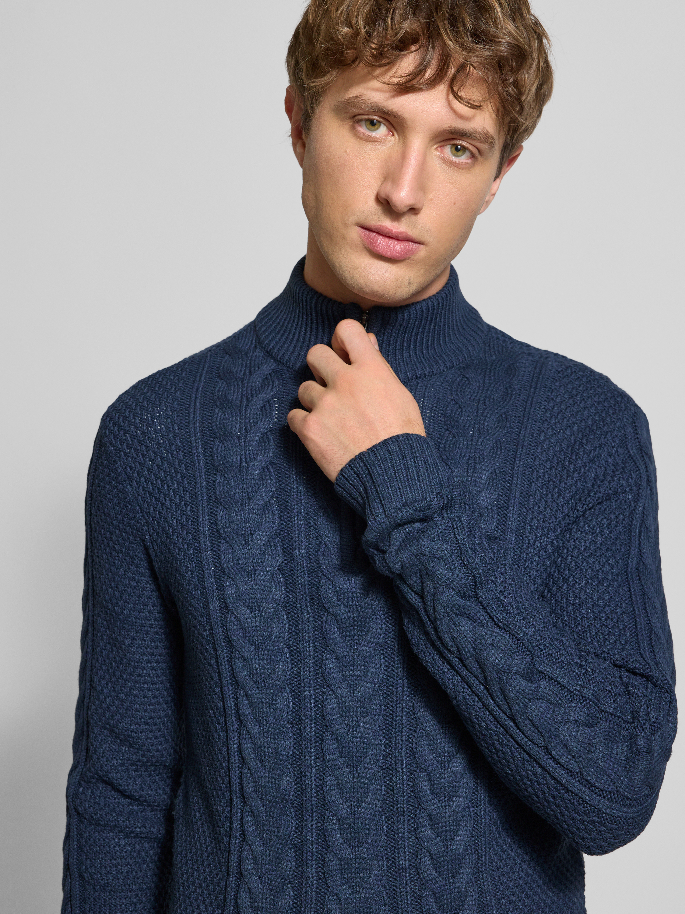 Der Herren Strickpullover Blend Modell 'BASIM' verbindet ein markantes Zopfmuster mit einem Stehkragen und passt sich durch den Slim Fit angenehm an die Silhouette an. Der weiche Baumwoll-Mix fühlt sich leicht auf der Haut an, sodass man sich im Alltag flexibel bewegen kann. Dezente Details wie das Label-Detail runden das Design ab und verleihen dem Pullover eine moderne Note.