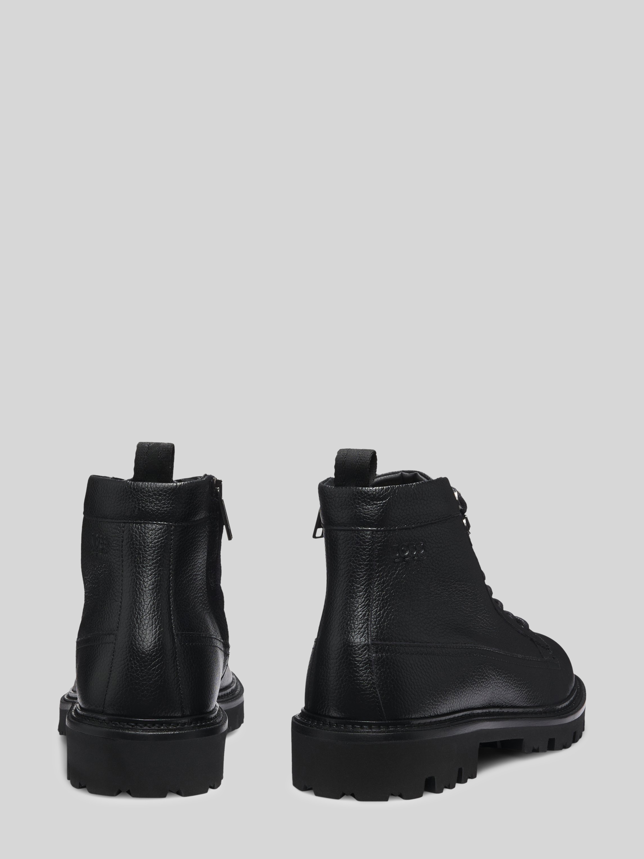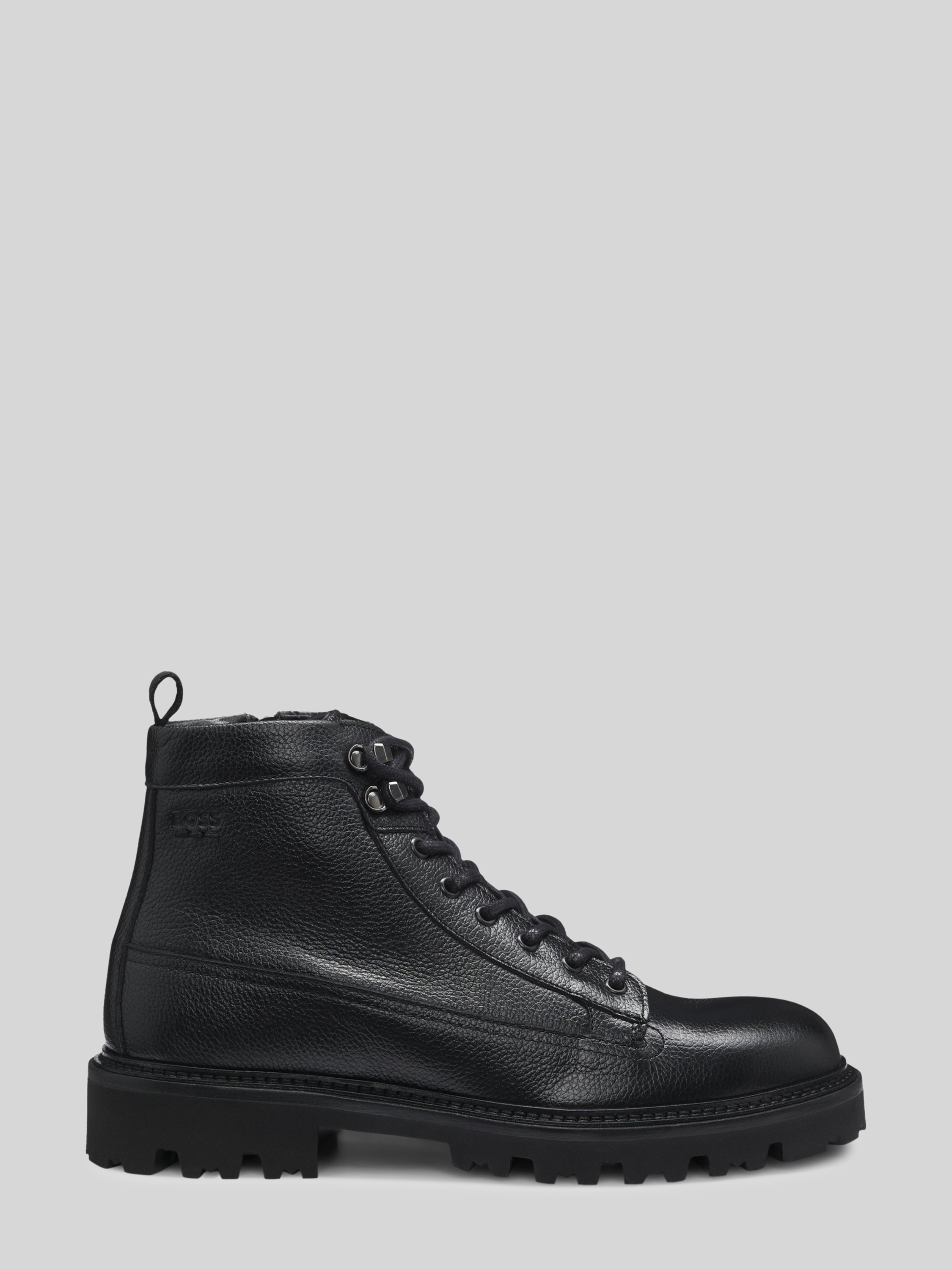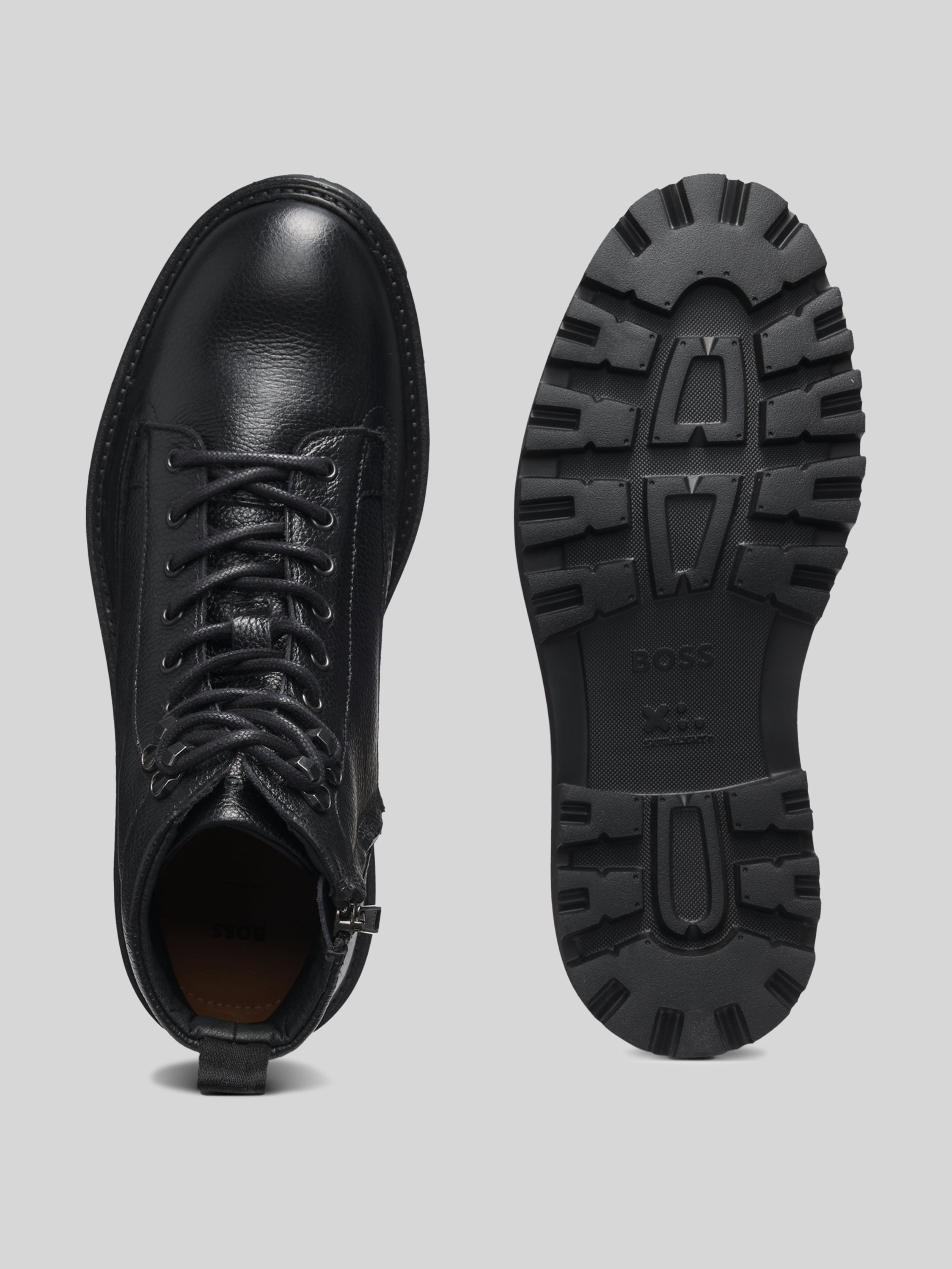 Die Herren Boots von BOSS, Modell Julyo, zeichnen sich durch ihr robustes Rindsleder aus, das eine angenehme Haptik mit einer dezenten Struktur verbindet. Die abgerundete Schuhspitze und der stabile Blockabsatz sorgen für Komfort im Alltag. Dank der profilierten Sohle bleibt der Auftritt stets sicher.