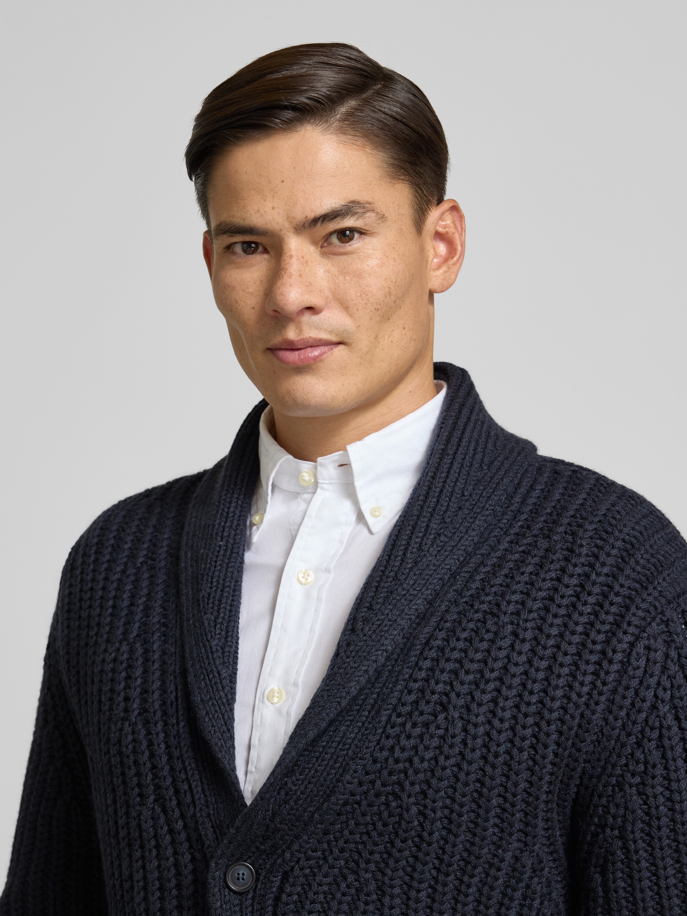 Der Herren Blouson von BECKHAM x BOSS verbindet durch seinen Regular Fit eine angenehme Passform mit einem klassischen Umlegekragen. Der Schurwoll-Kaschmir-Mix sorgt für ein angenehmes Tragegefühl und hält zuverlässig warm. In Grobstrick-Optik gehalten, eignet sich das Modell für vielseitige Kombinationen.