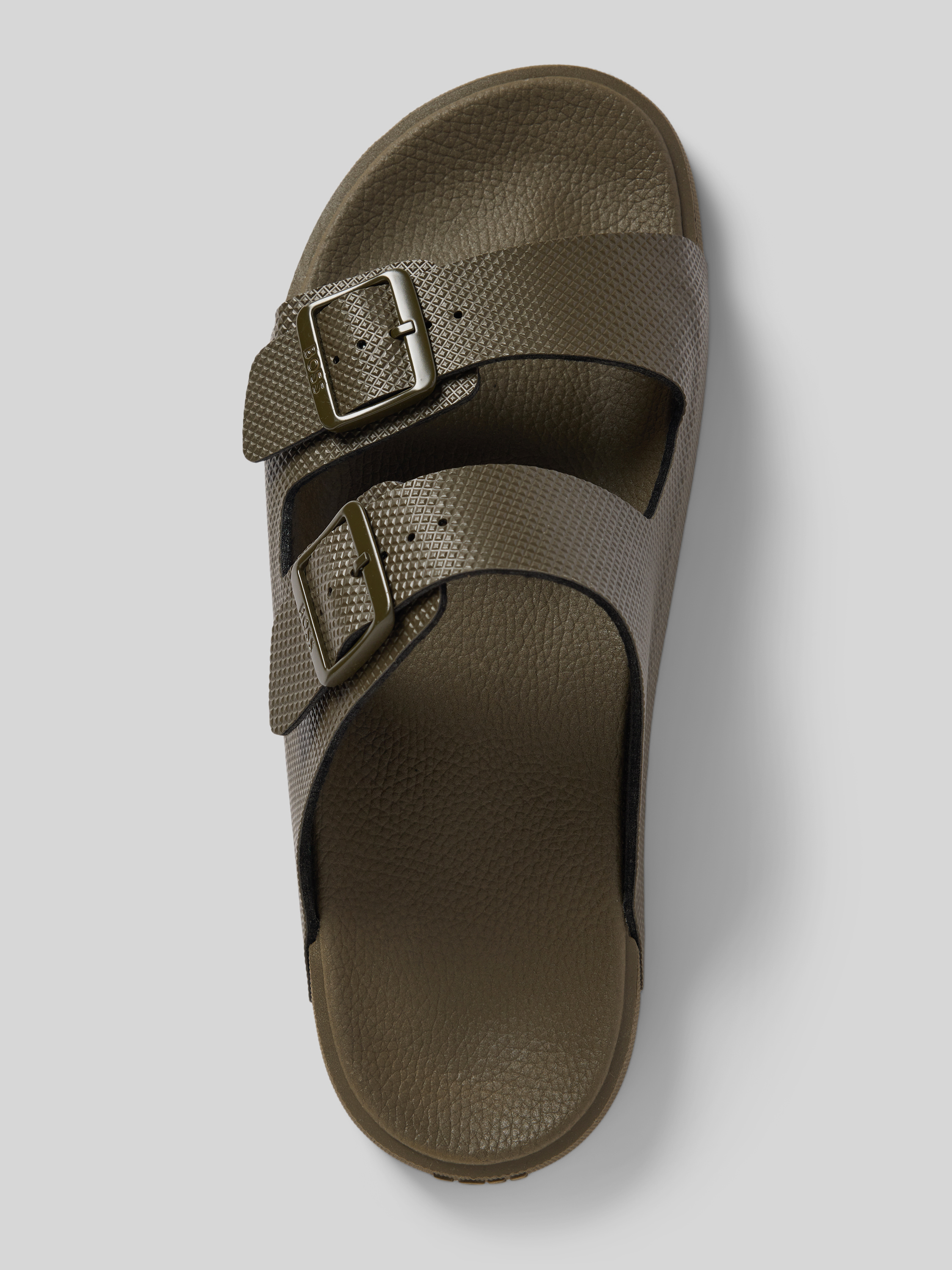 Die Sandalette von BOSS, Modell 'Surfley', kombiniert eine abgerundete Spitze mit einer praktischen Schlupfform, die ein einfaches Anziehen ermöglicht. Der Riemen mit Dornschließe sorgt für sicheren Halt, während die dezenten Label-Details einen subtilen Markenakzent setzen. Der 2 cm hohe Absatz bietet angenehmen Tragekomfort.