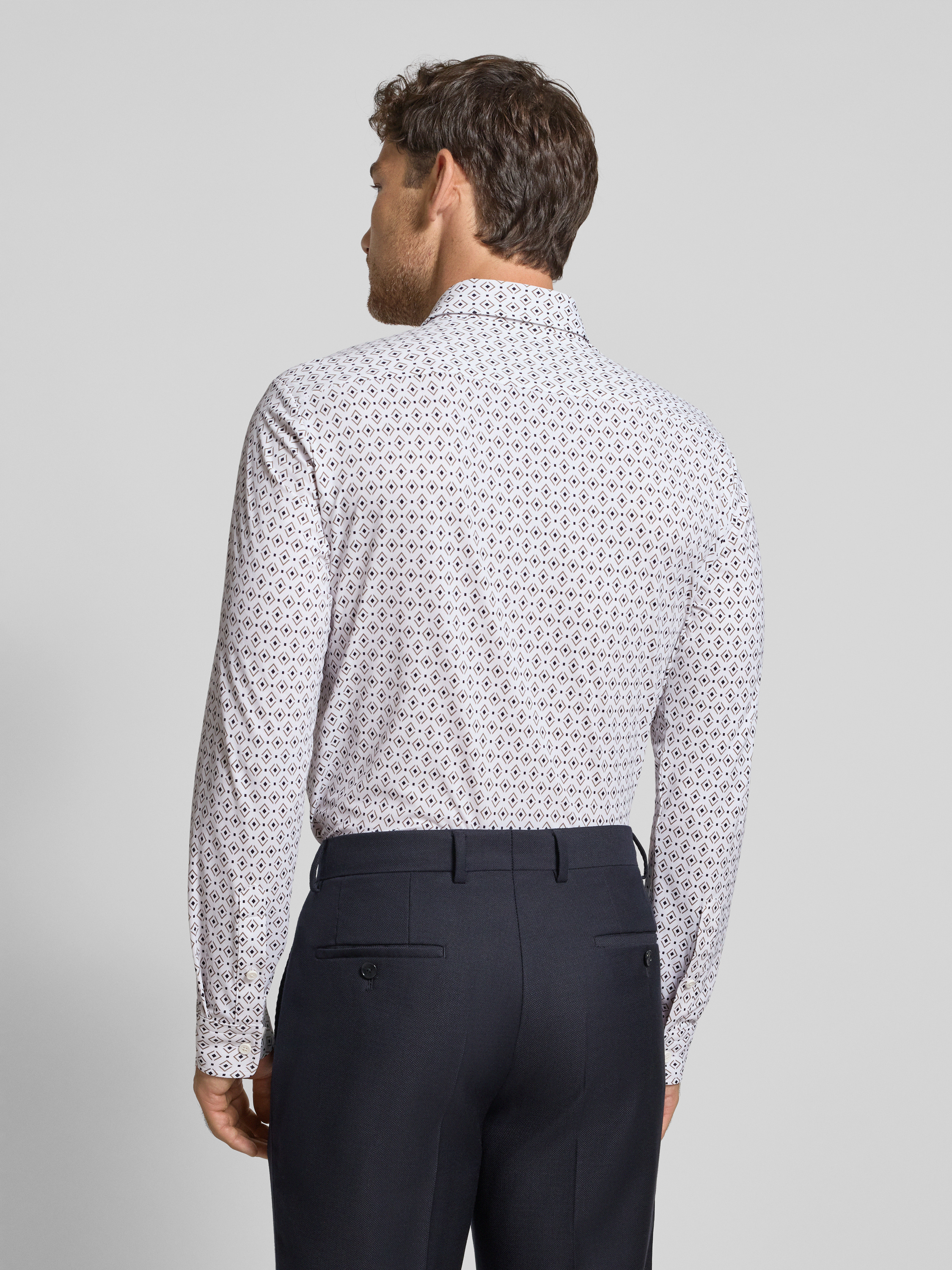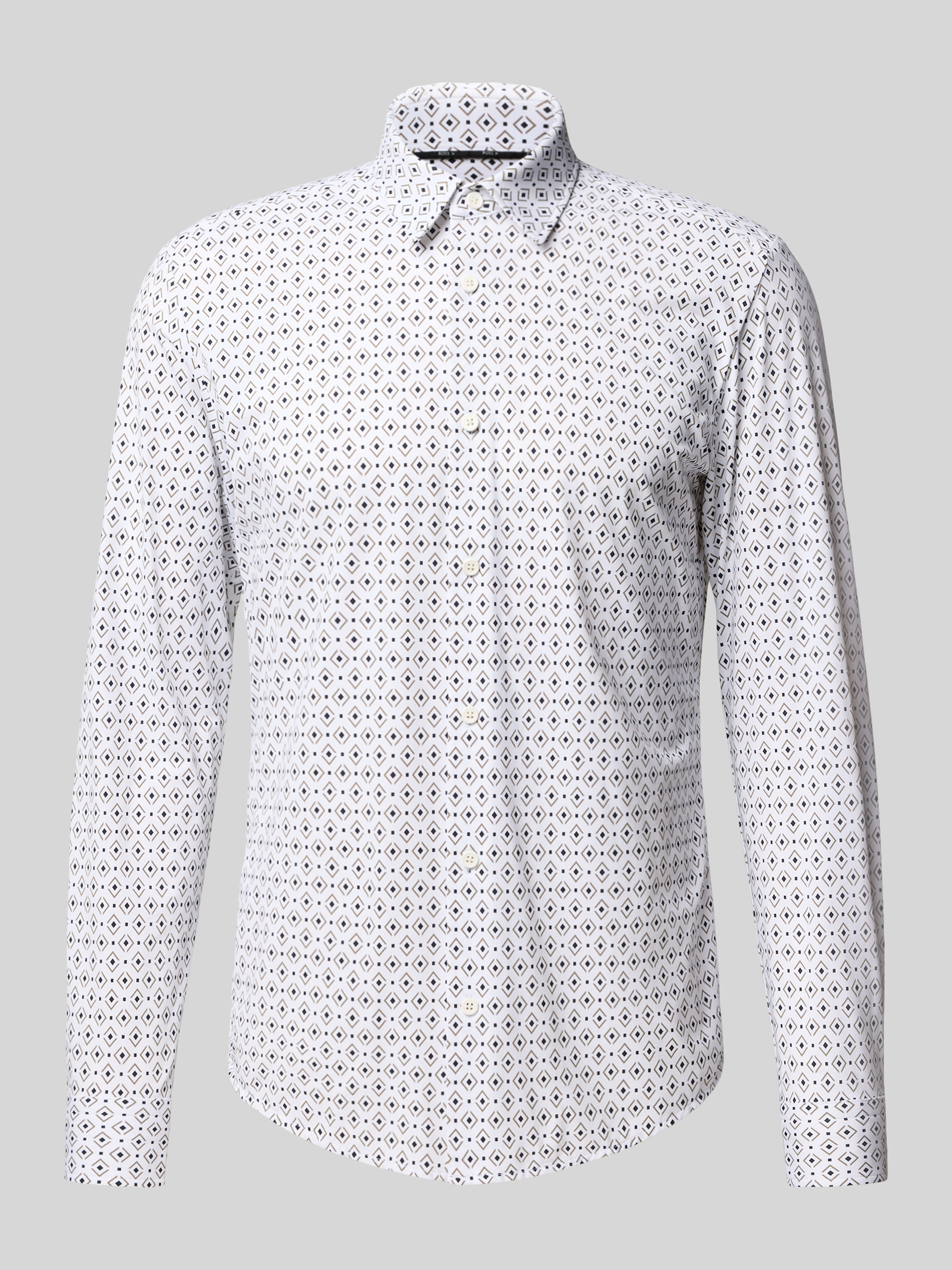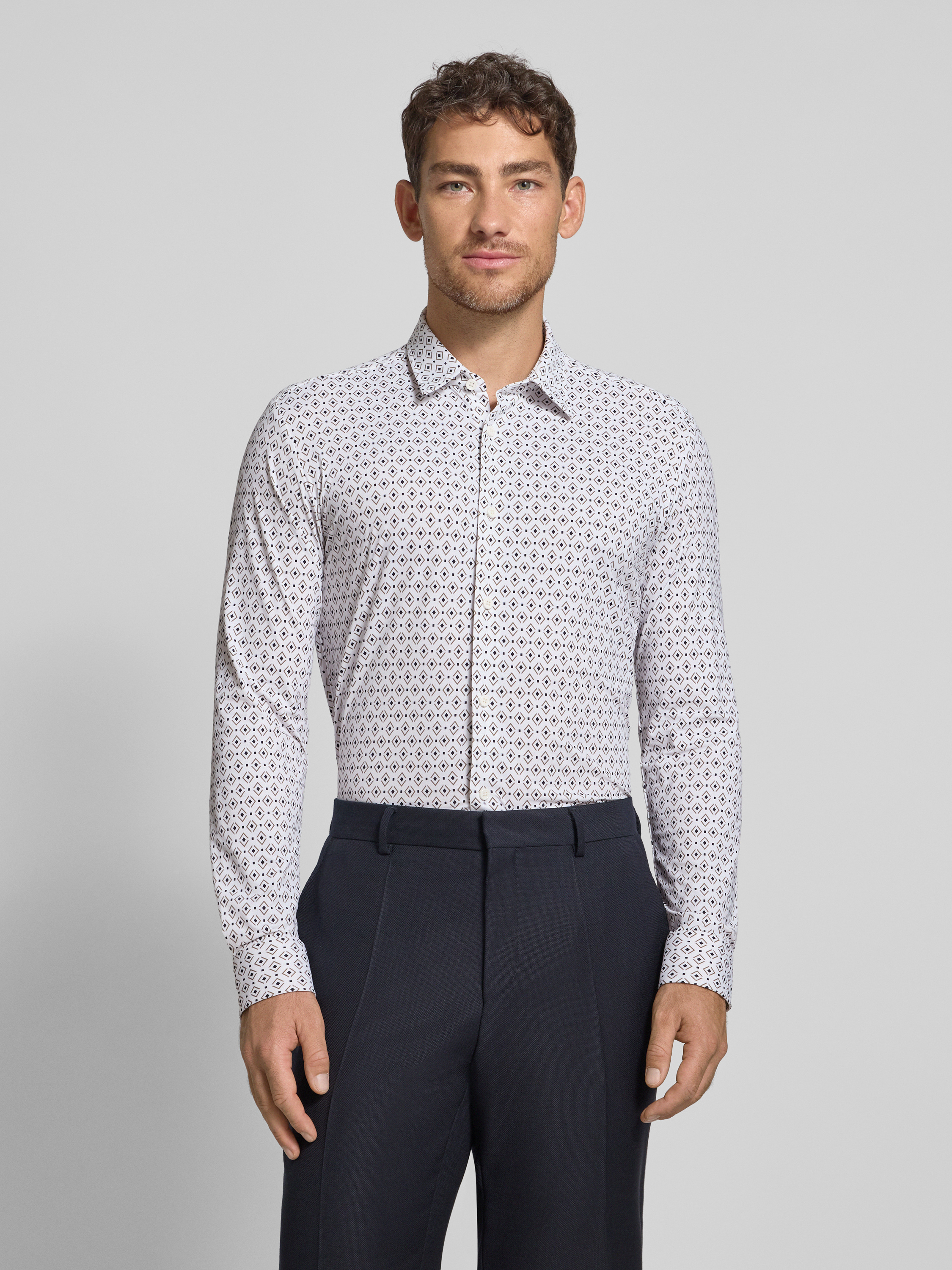 Das Herrenhemd von BOSS, Modell P-Roan, zeigt sich im schlanken Slim Fit und einem markanten Allover-Muster. Dank des klassischen Kentkragens passt es zu vielen Gelegenheiten und unterstreicht einen gepflegten Stil. Die langen Ärmel mit Manschetten sorgen für angenehmen Tragekomfort im Alltag.