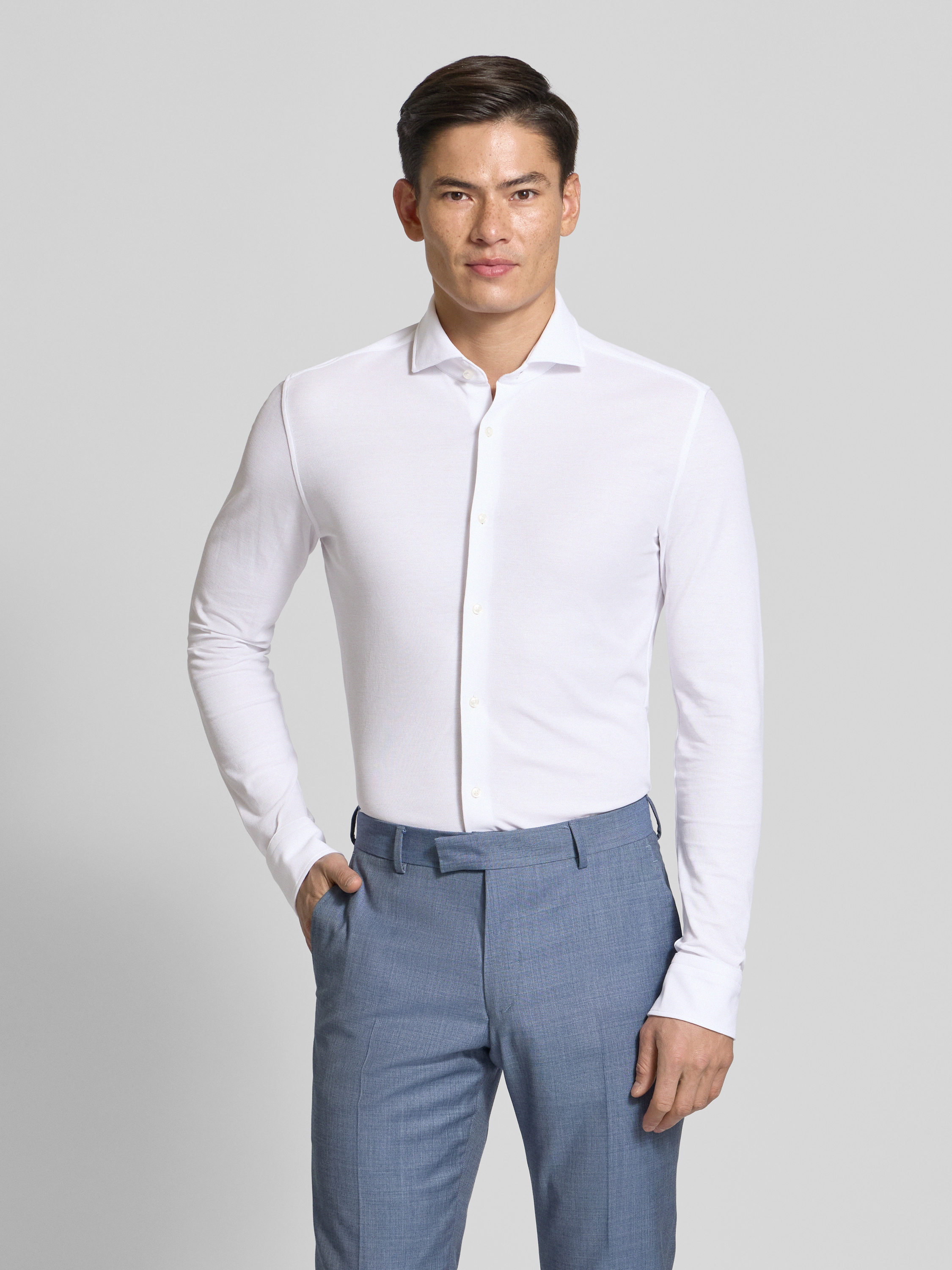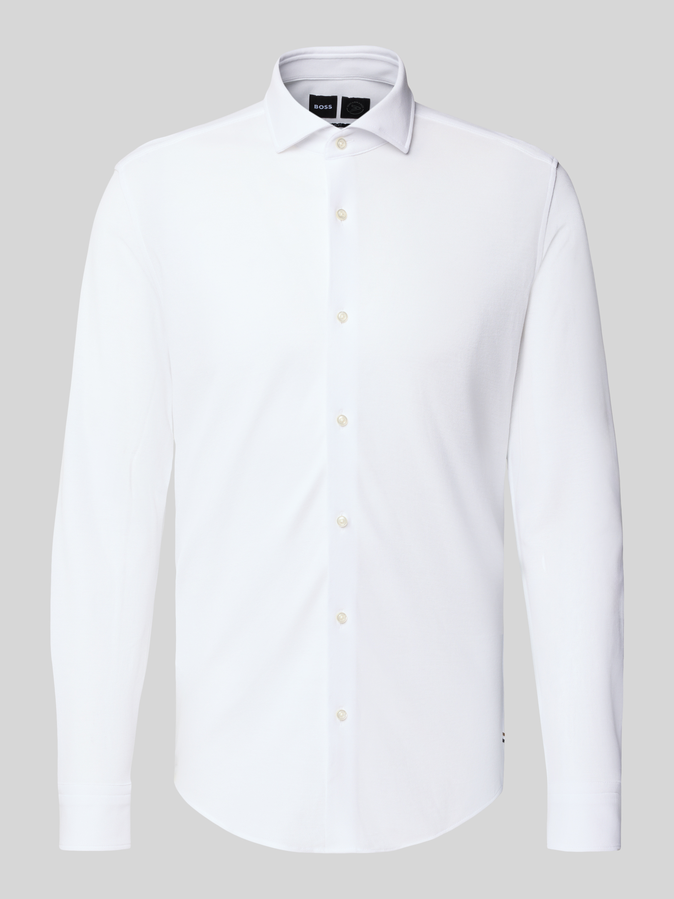 Das Herrenhemd von BOSS in schmaler Passform legt sich angenehm an und sorgt durch das feine Webmuster für einen dezenten Akzent. Gefertigt aus reiner Baumwolle, fühlt sich das Modell besonders weich auf der Haut an. Der Cutaway-Kragen ergänzt formelle Outfits mühelos.