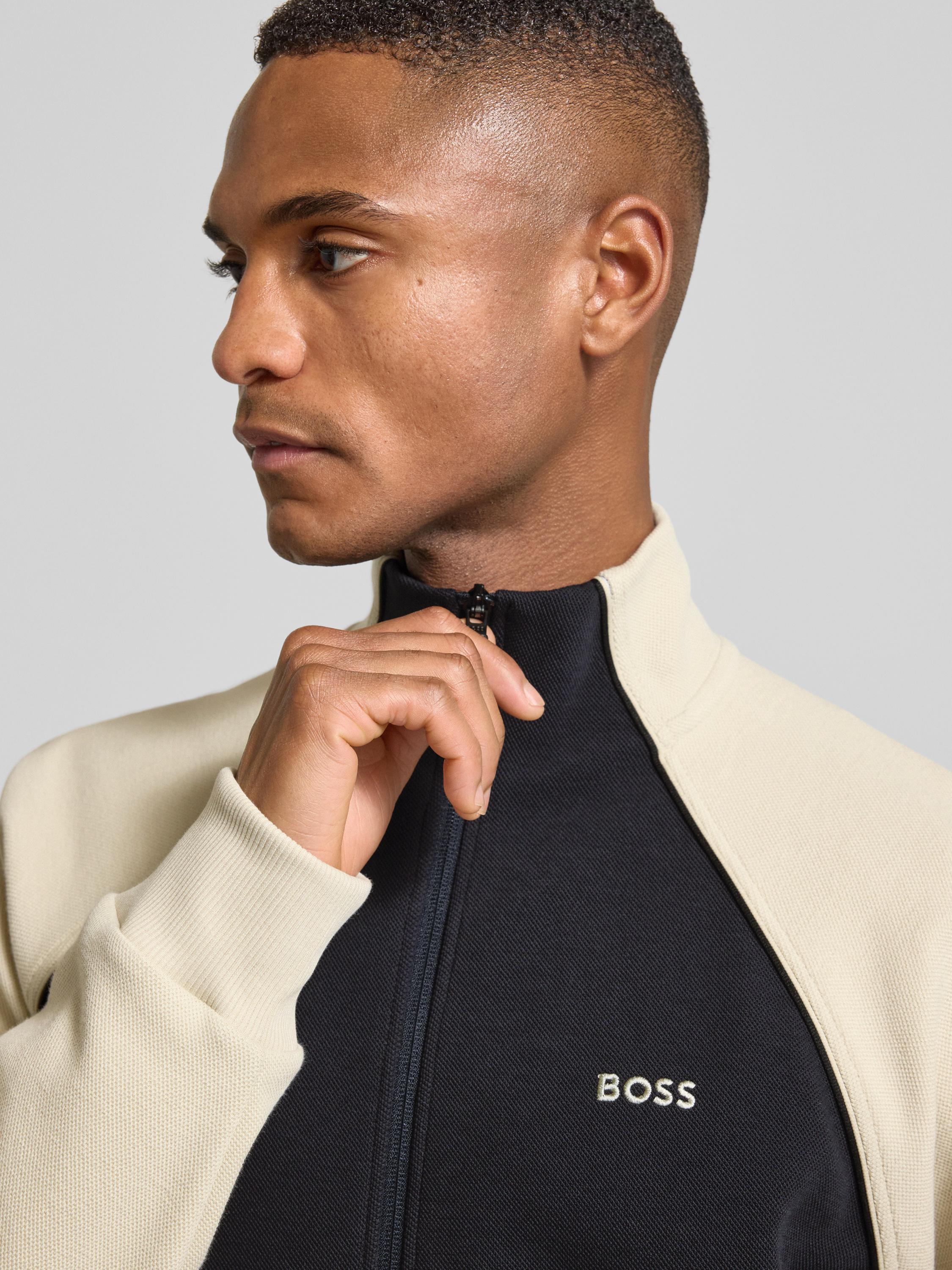 Die Herren Sweatjacke von BOSS Green fällt durch ihre Two-Tone-Optik angenehm ins Auge und lässt sich vielseitig kombinieren. Dank Regular-Fit-Passform bleibt sie locker, ohne aufzutragen, und sorgt für bequemen Sitz im Alltag. Der Baumwoll-Mix mit Piqué-Struktur verleiht dem Material eine dezente Griffigkeit, wodurch man sich auch an längeren Tagen wohlfühlt.