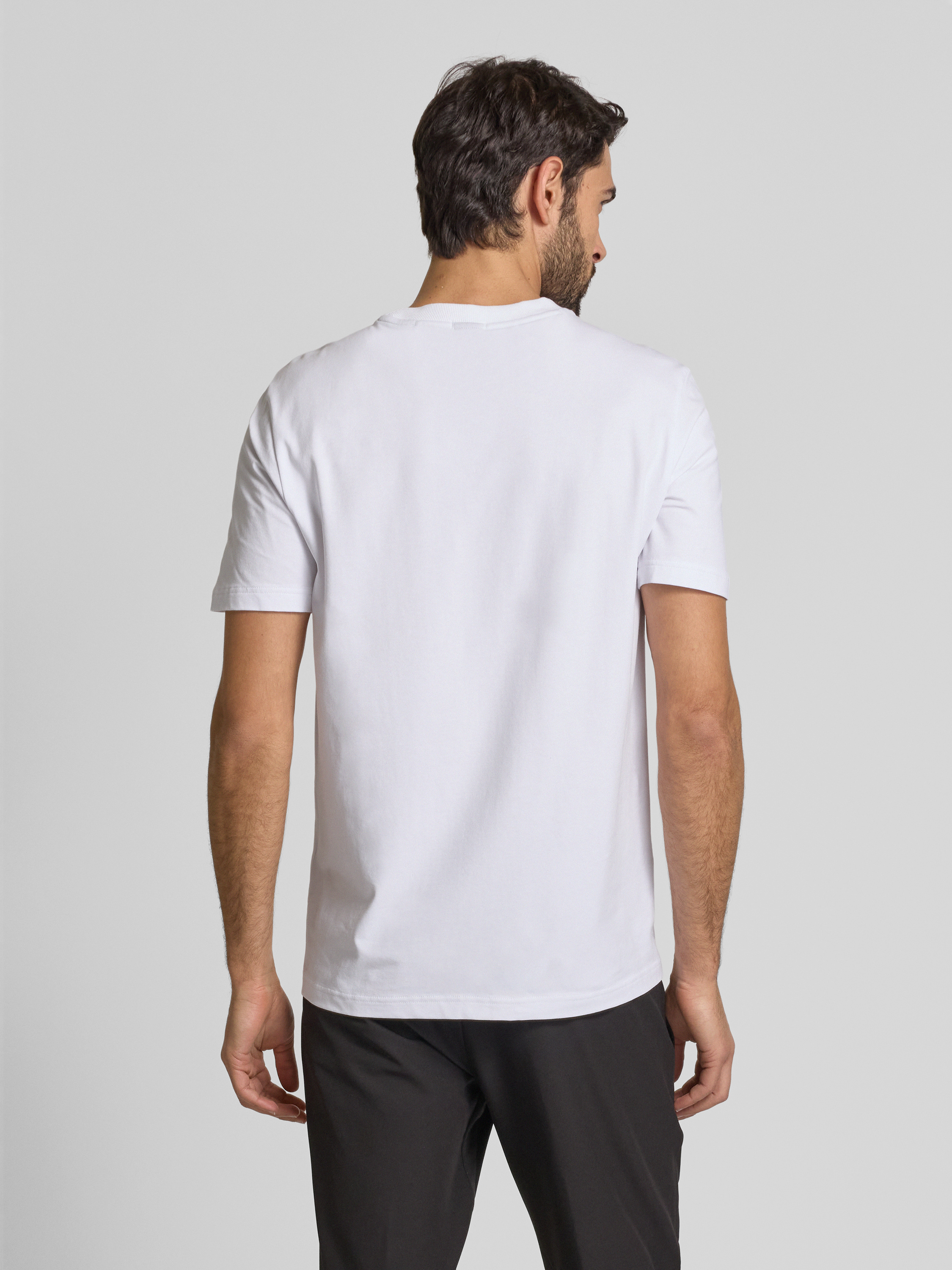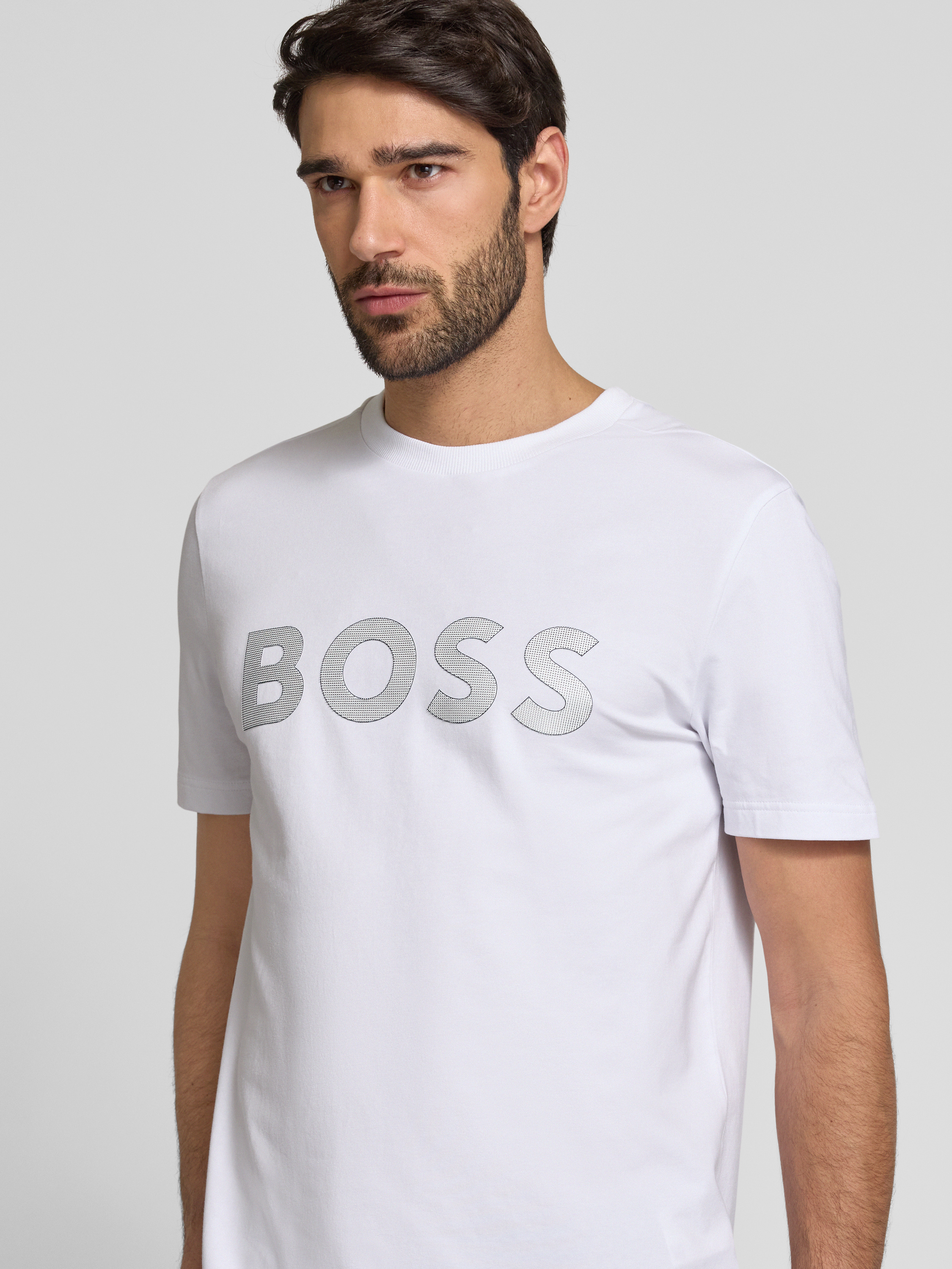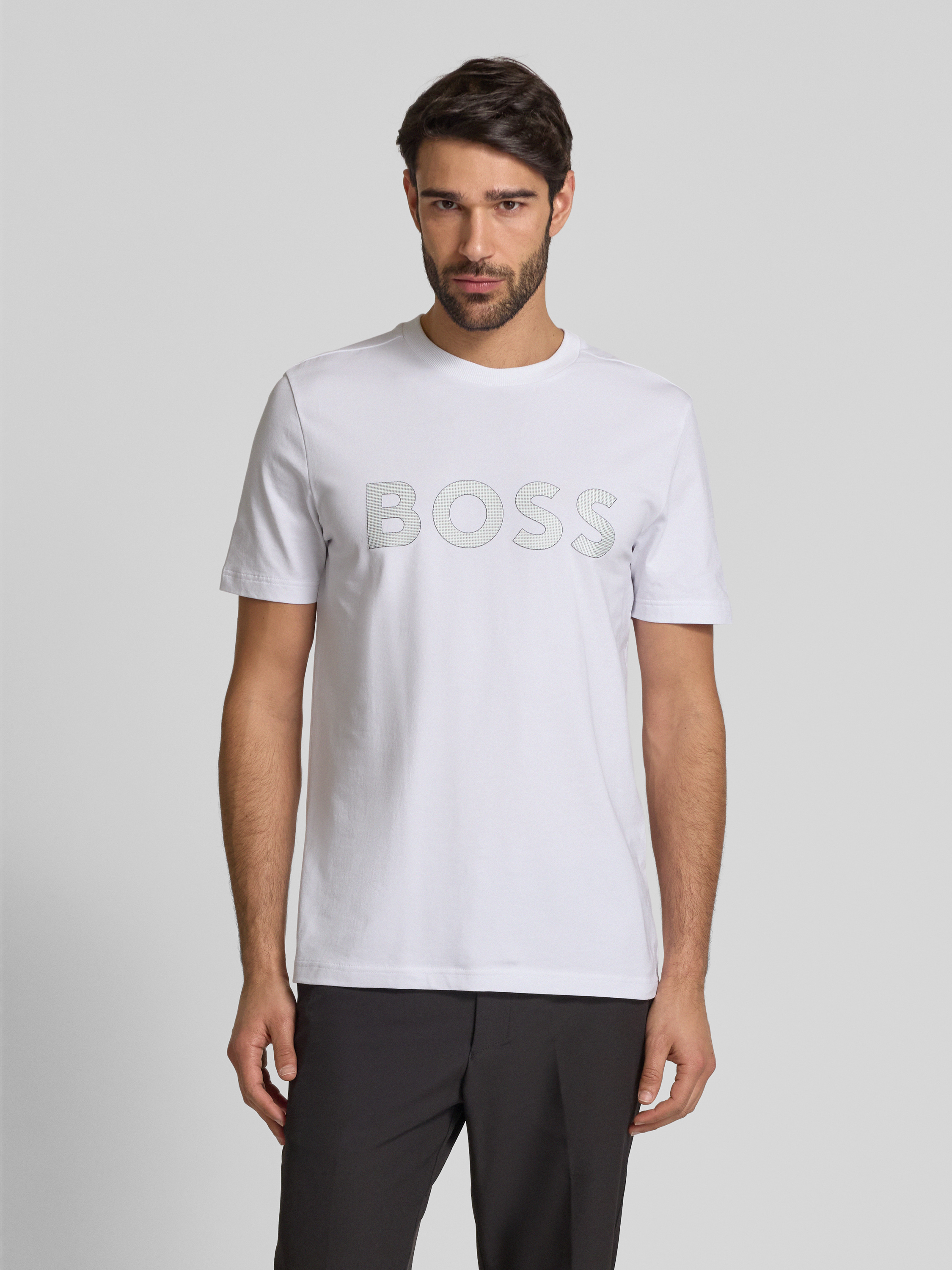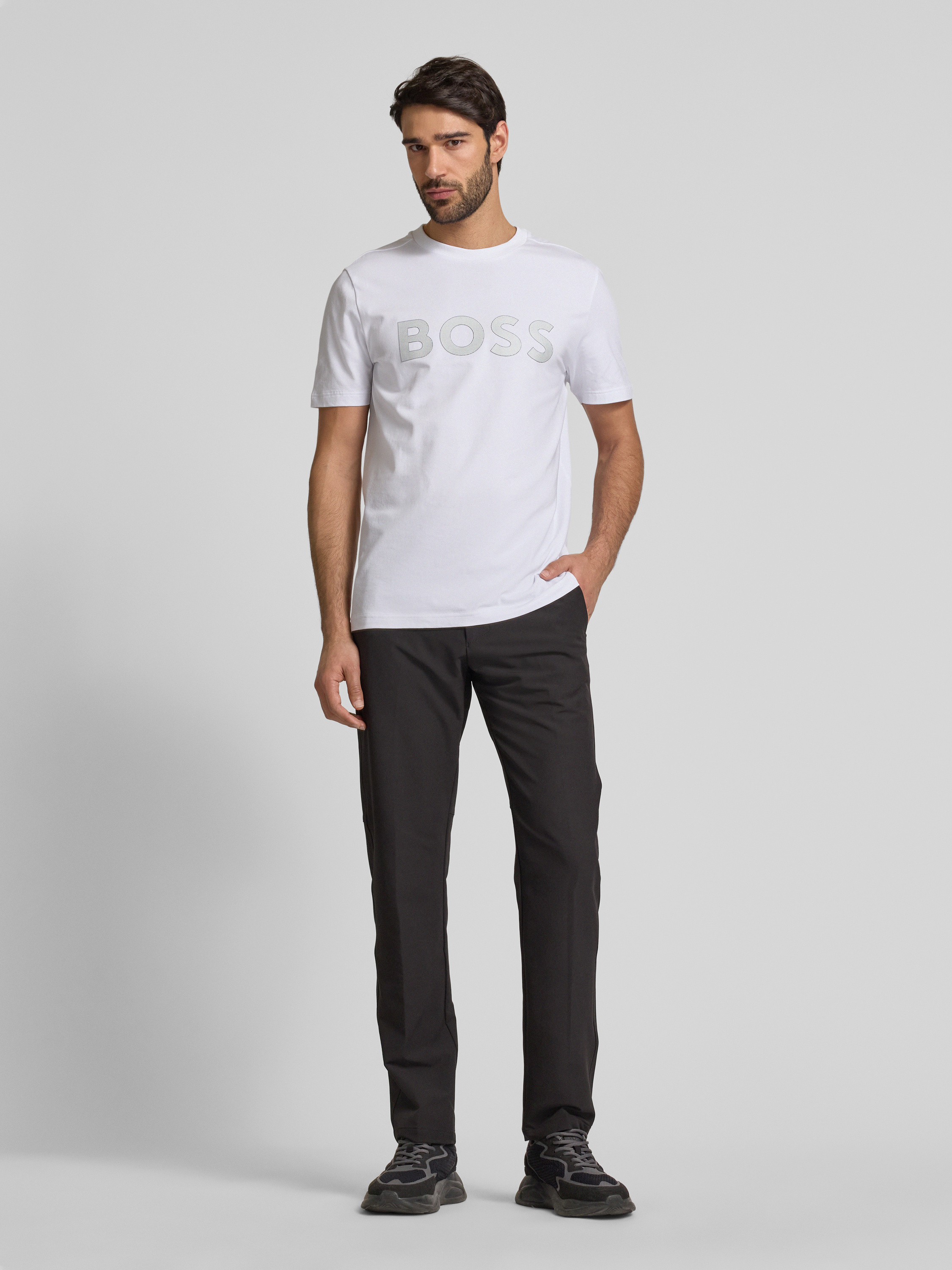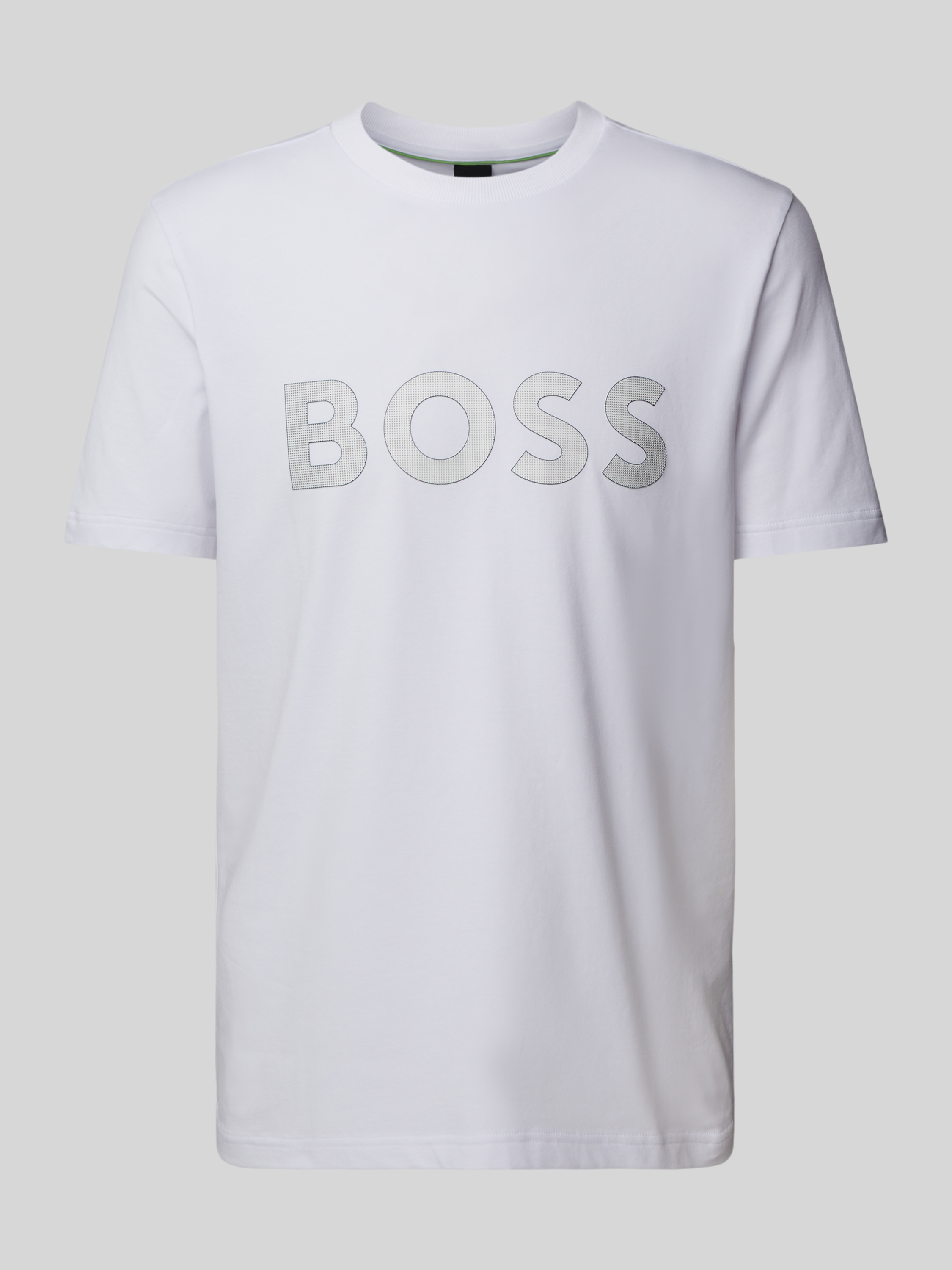 Das Herren T-Shirt von BOSS Green kombiniert einen angenehmen Baumwoll-Elasthan-Mix mit einem geraden Schnitt, der für hohen Tragekomfort sorgt. Der Rundhalsausschnitt bietet eine klassische Note, während der auffällige Label-Print auf der Vorderseite einen modernen Akzent setzt. Ideal für einen lässigen Alltagslook.