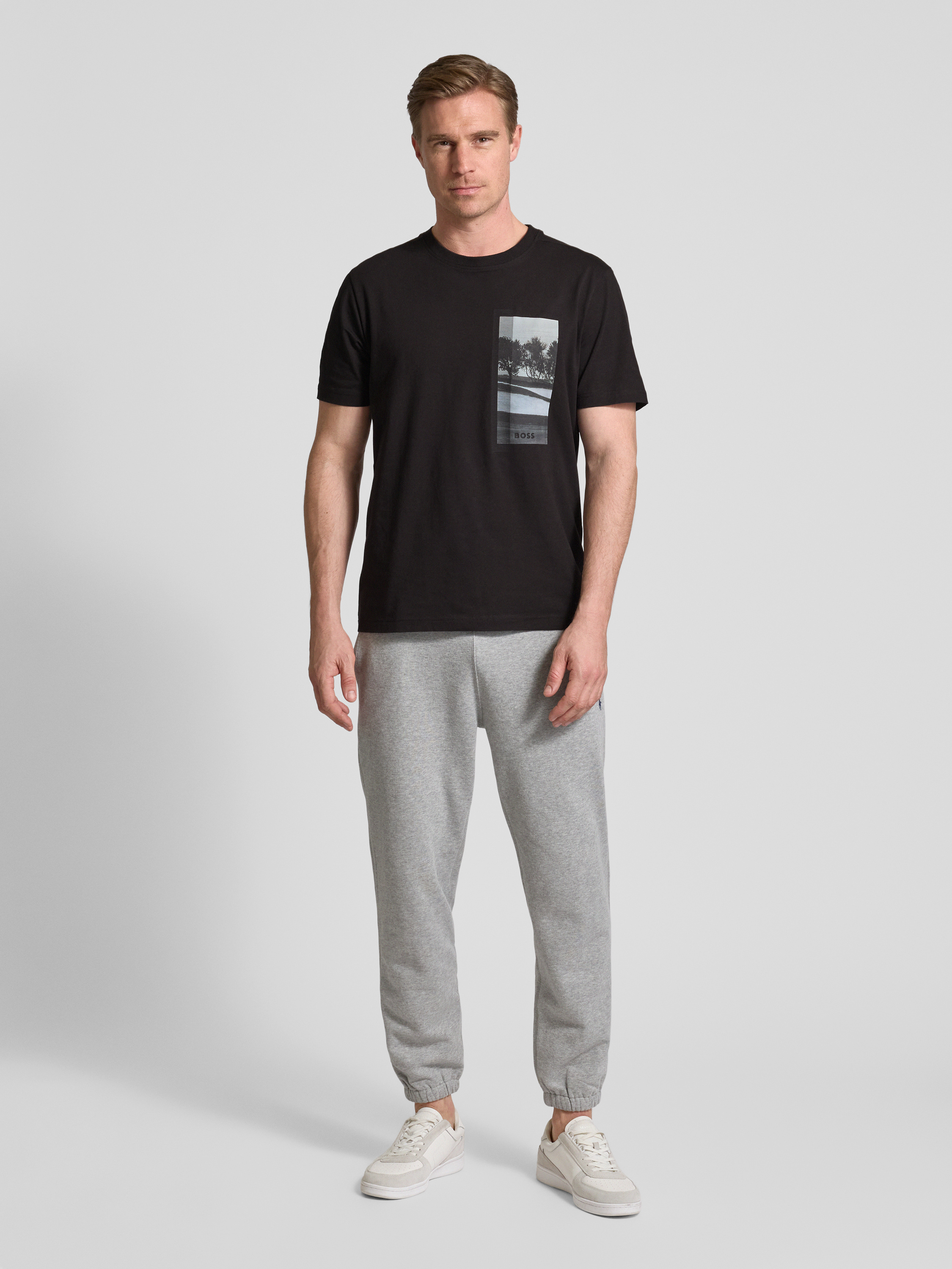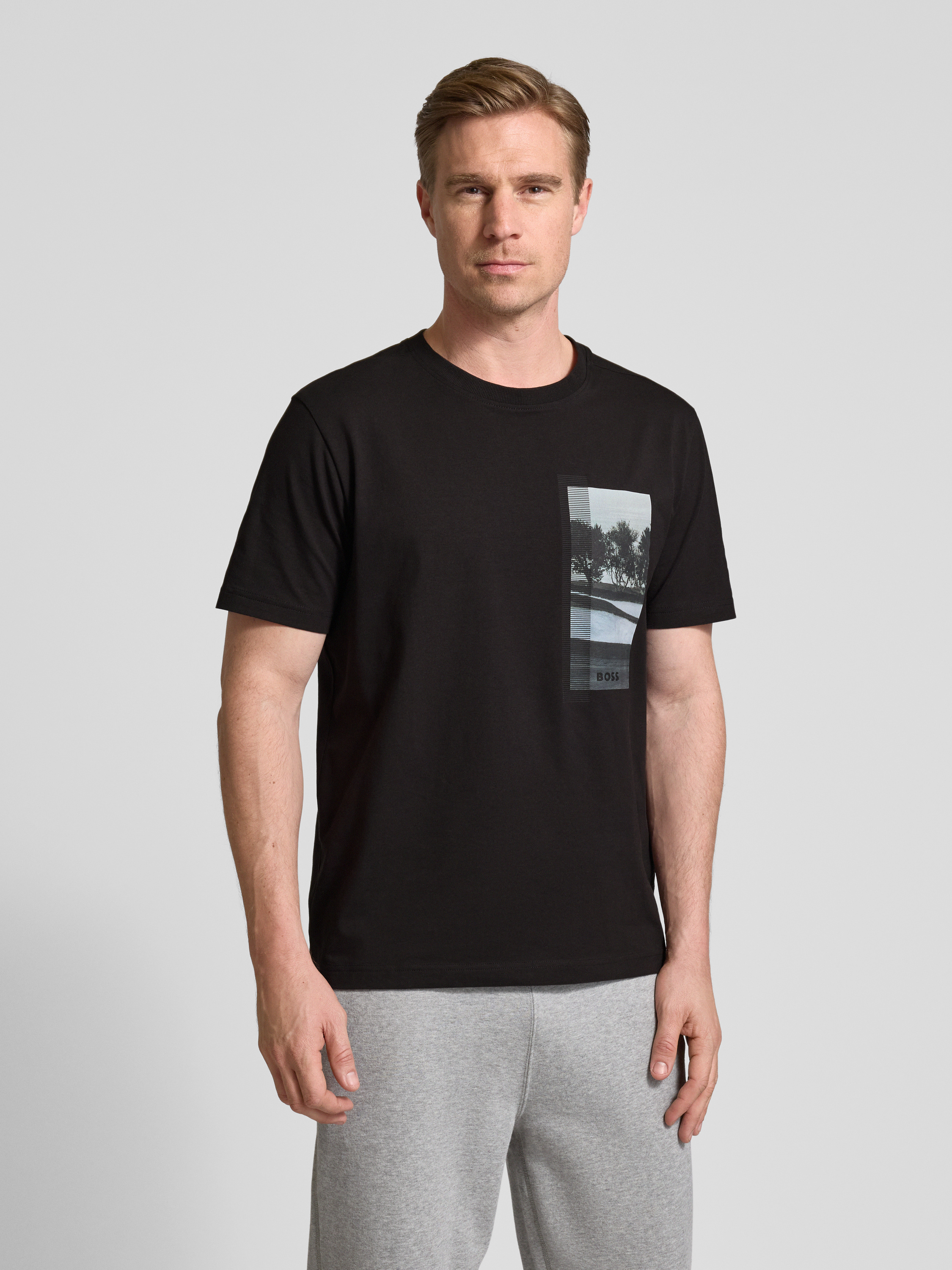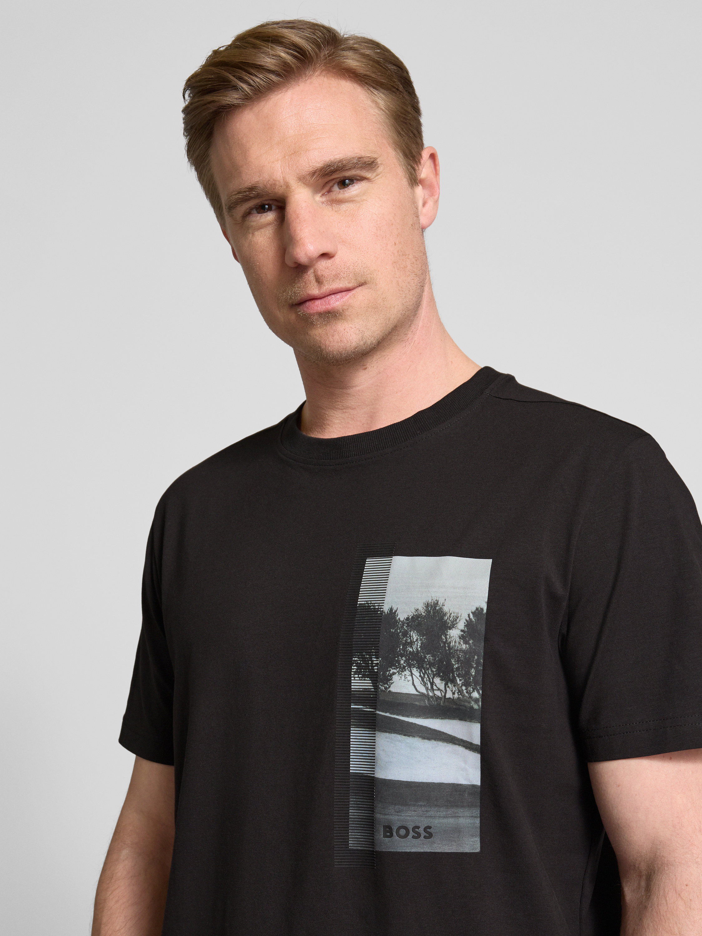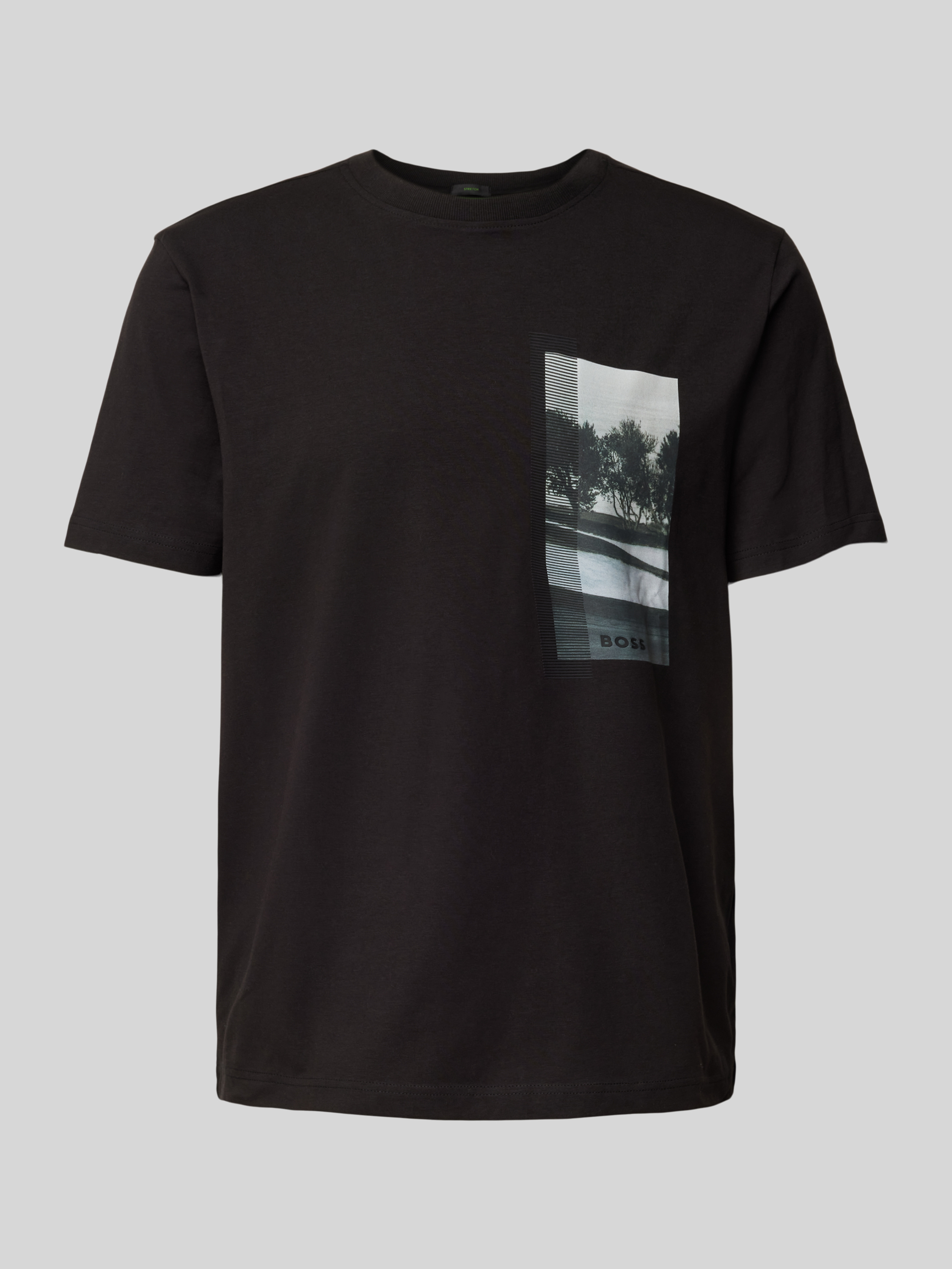 Das Herren T-Shirt von BOSS Green kombiniert einen Material-Mix mit Stretch-Anteil und bietet so eine angenehme Bewegungsfreiheit. Der gerade Schnitt und der Rundhalsausschnitt sorgen für eine bequeme Passform, während der auffällige Motiv-Print für einen modernen Look sorgt. Ideal für vielseitige Alltagskombinationen.