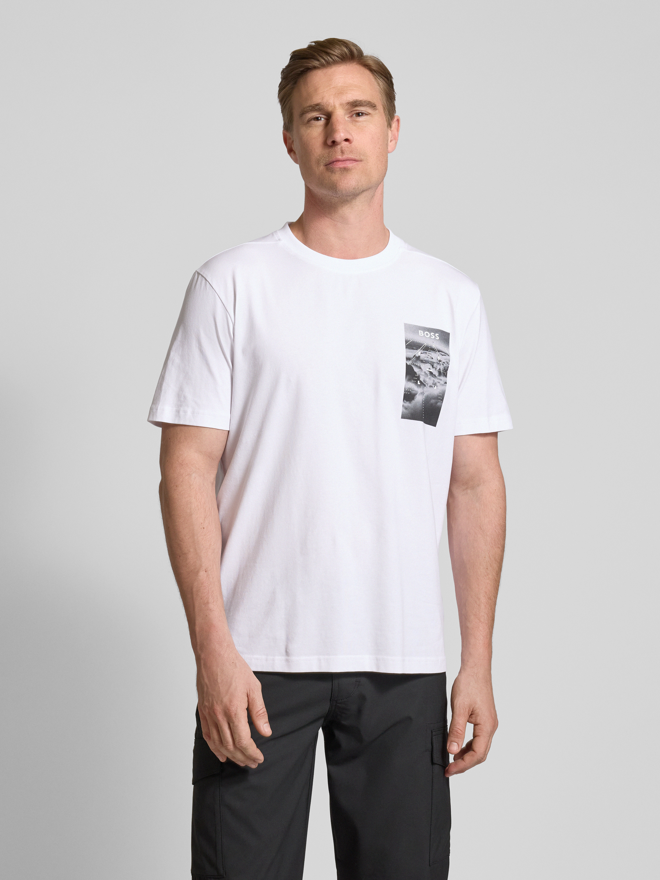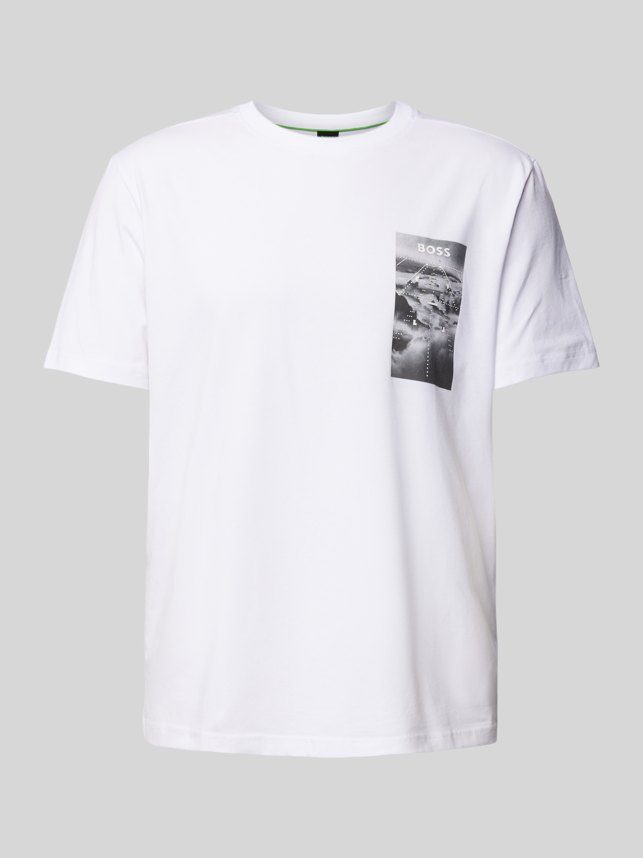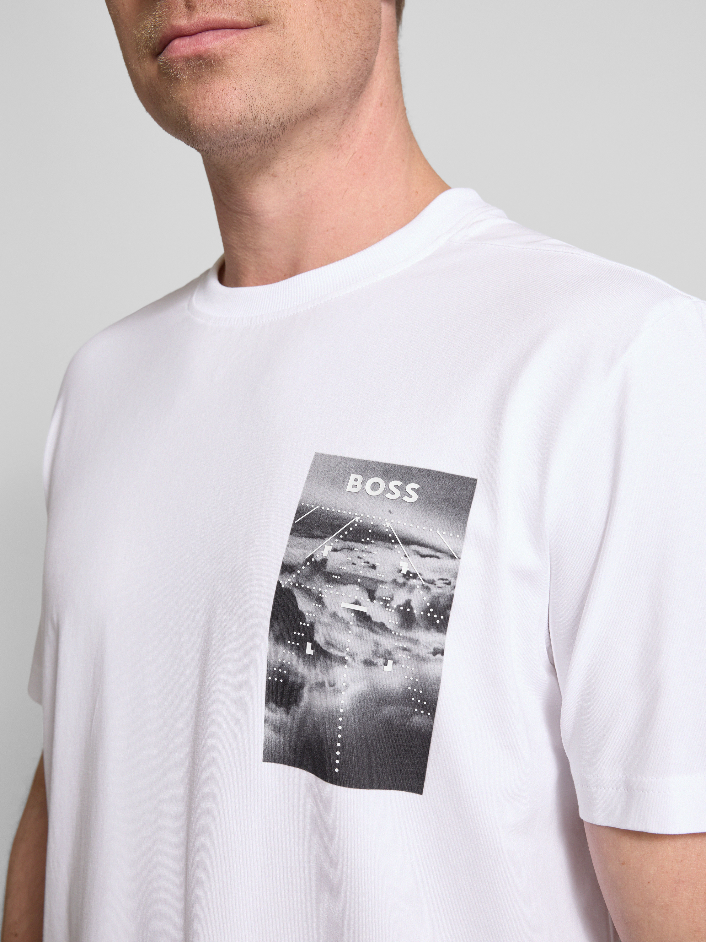 Das Herren T-Shirt von BOSS Green kombiniert einen Material-Mix mit Stretch-Anteil und bietet so eine angenehme Bewegungsfreiheit. Der gerade Schnitt und der Rundhalsausschnitt sorgen für eine bequeme Passform, während der auffällige Motiv-Print für einen modernen Look sorgt. Ideal für vielseitige Alltagskombinationen.