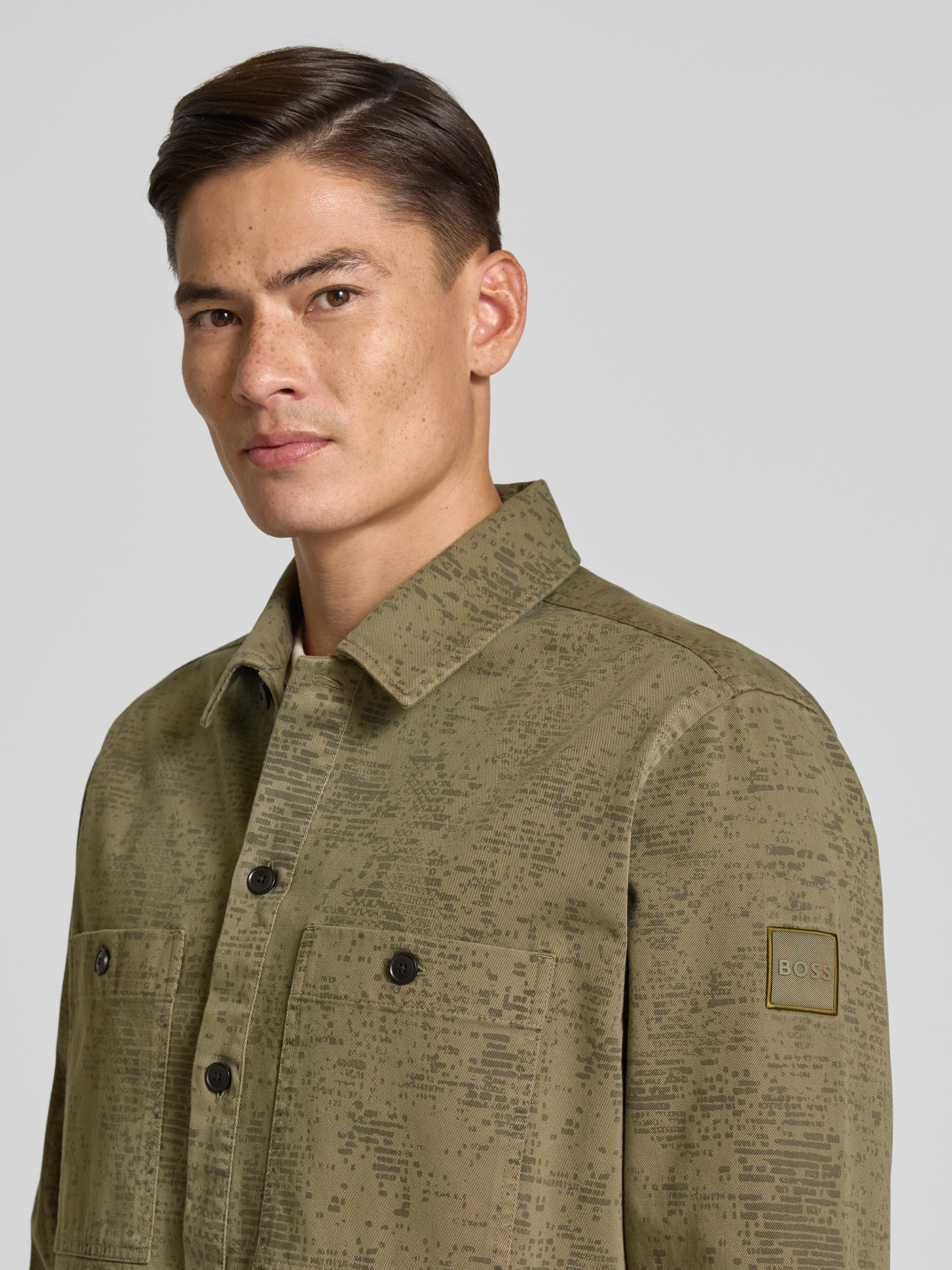 Das Herrenmodell Locky_2 von BOSS Orange kombiniert einen klassischen Umlegekragen mit einem modernen, abstrakten Allover-Muster. Die lockere Regular Fit-Form und reine Baumwolle sorgen für ein angenehmes Tragegefühl im Alltag. Praktische Brusttaschen und lange Ärmel unterstreichen den lässigen Charakter dieser Hemdjacke.