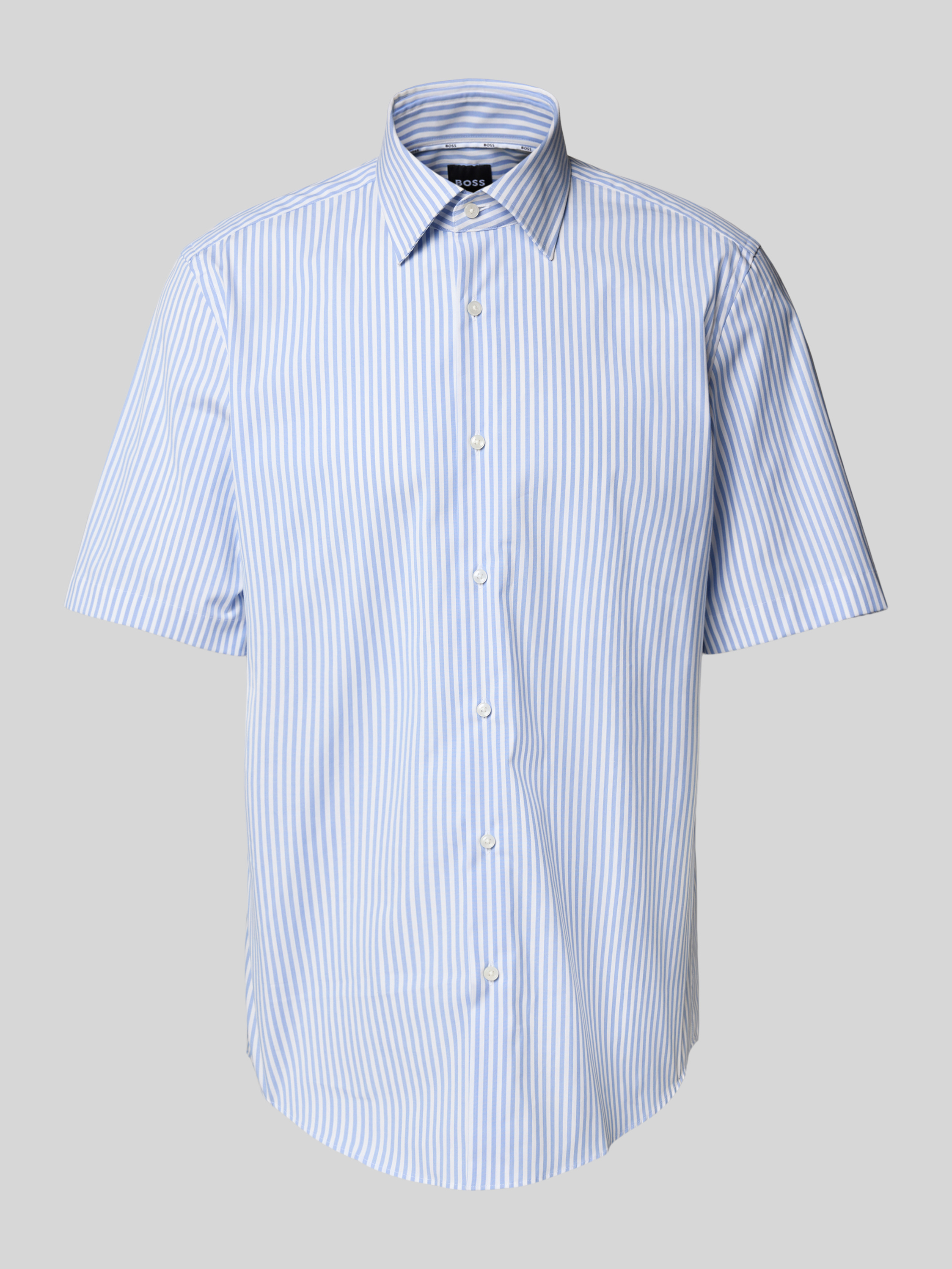 Das Regular Fit Kurzarmhemd von BOSS, Modell 'Joe', überzeugt durch einen angenehmen Baumwoll-Mix mit Stretch-Anteil. Der Kentkragen verleiht eine klassische Note, während der abgerundete Saum für eine bequeme Passform sorgt. Ideal für lässige Anlässe und warme Tage.