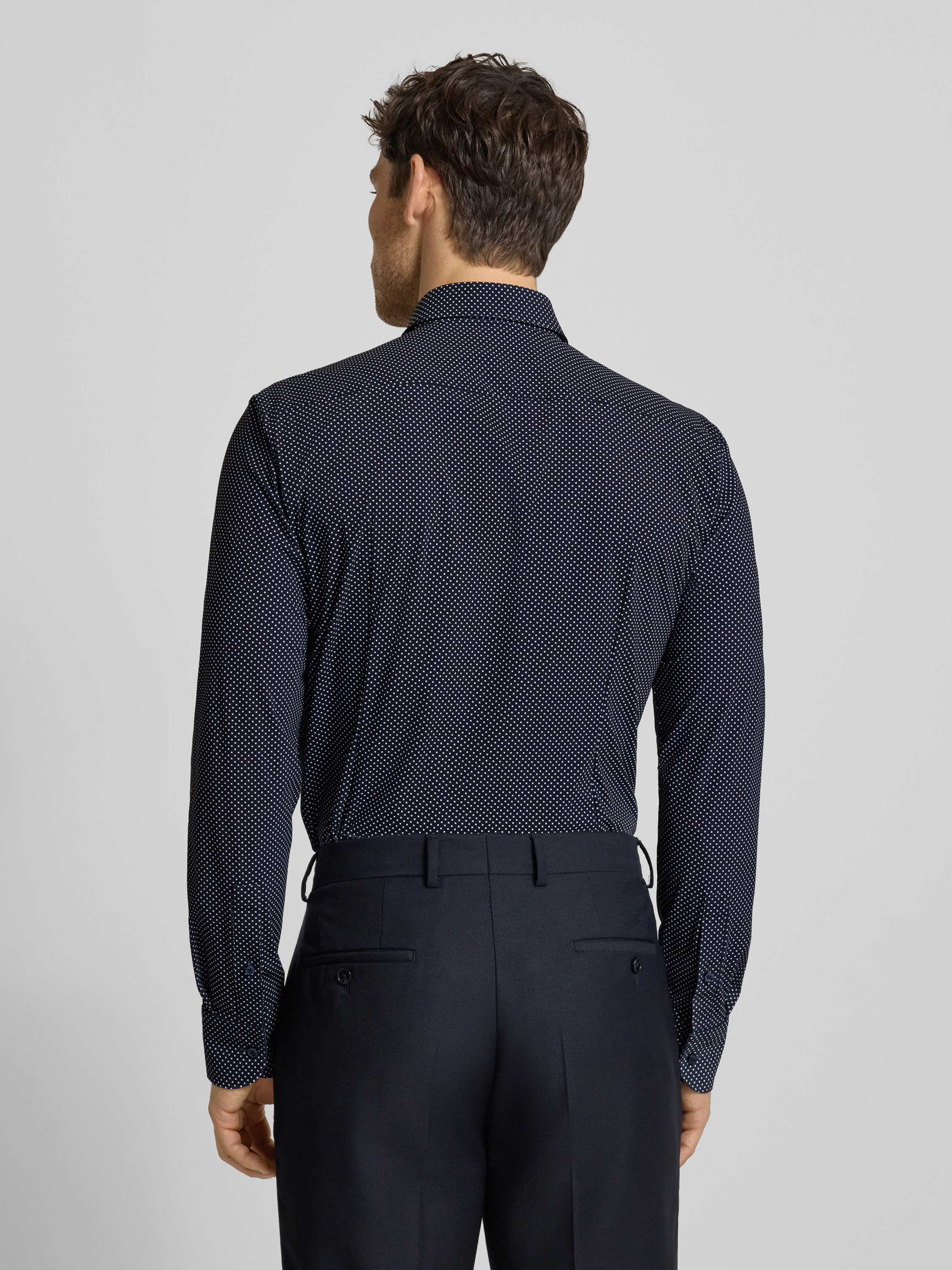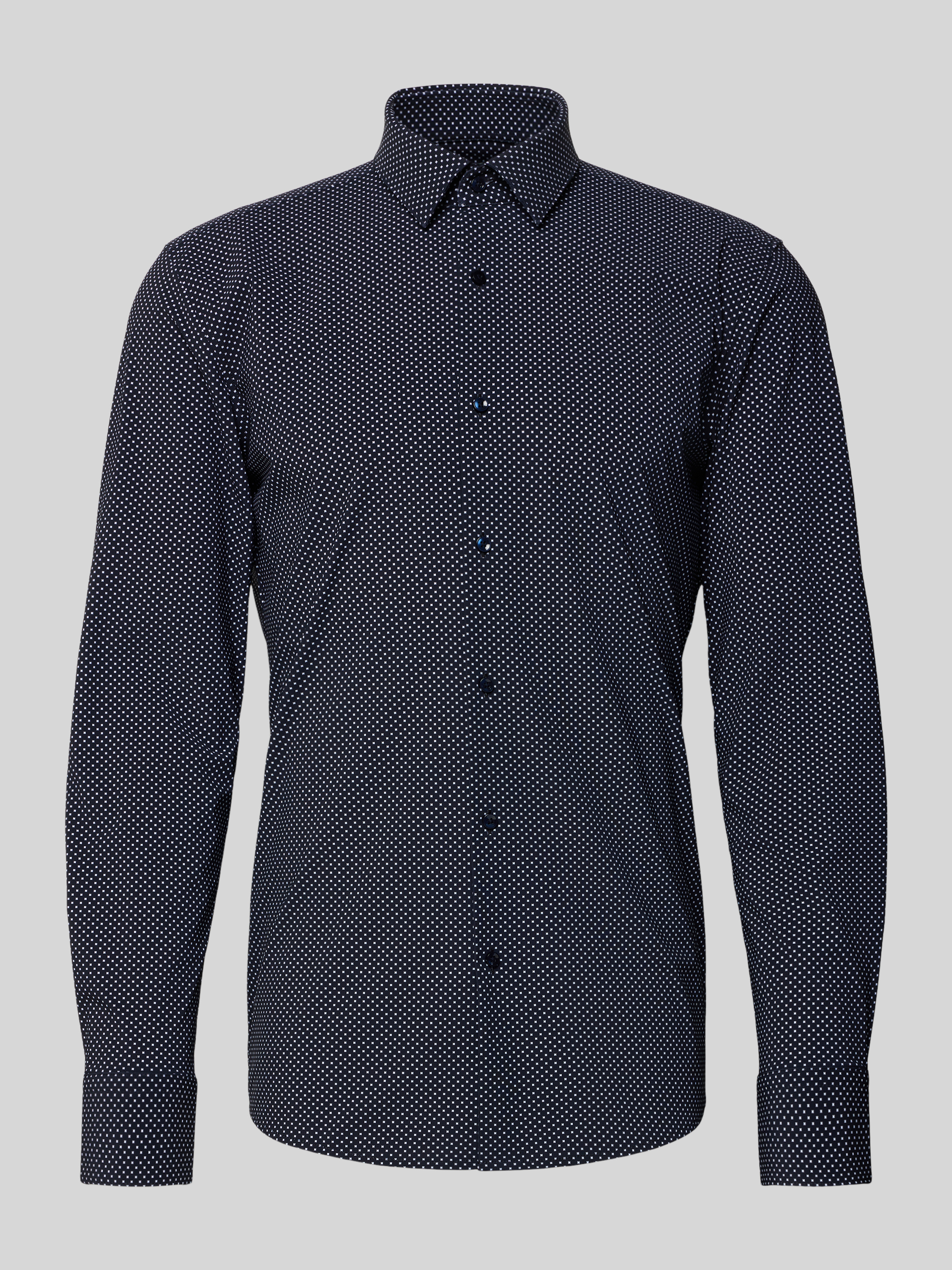 Das Herren Businesshemd von BOSS, Modell 'HANK', fällt durch sein feines Allover-Muster und die schlanke Slim-Fit-Passform auf. Der Kentkragen und die durchgehende Knopfleiste unterstreichen den klassischen Hemd-Look, während das atmungsaktive, feuchtigkeitsregulierende Material für angenehmen Tragekomfort sorgt. Mit der dezenten Rückenpasse bleibt Bewegungsfreiheit erhalten, sodass man sich im Alltag flexibel zeigen kann.