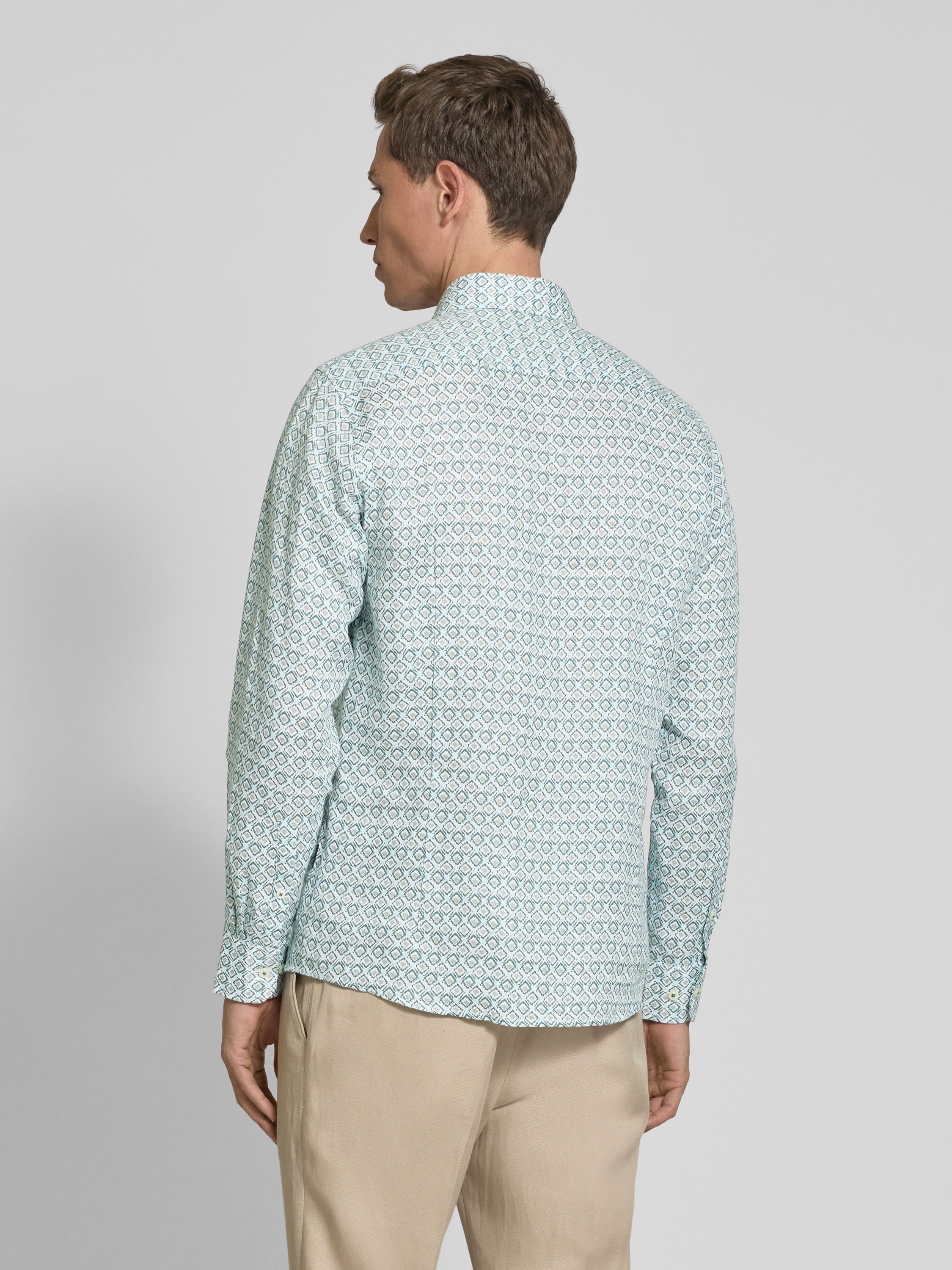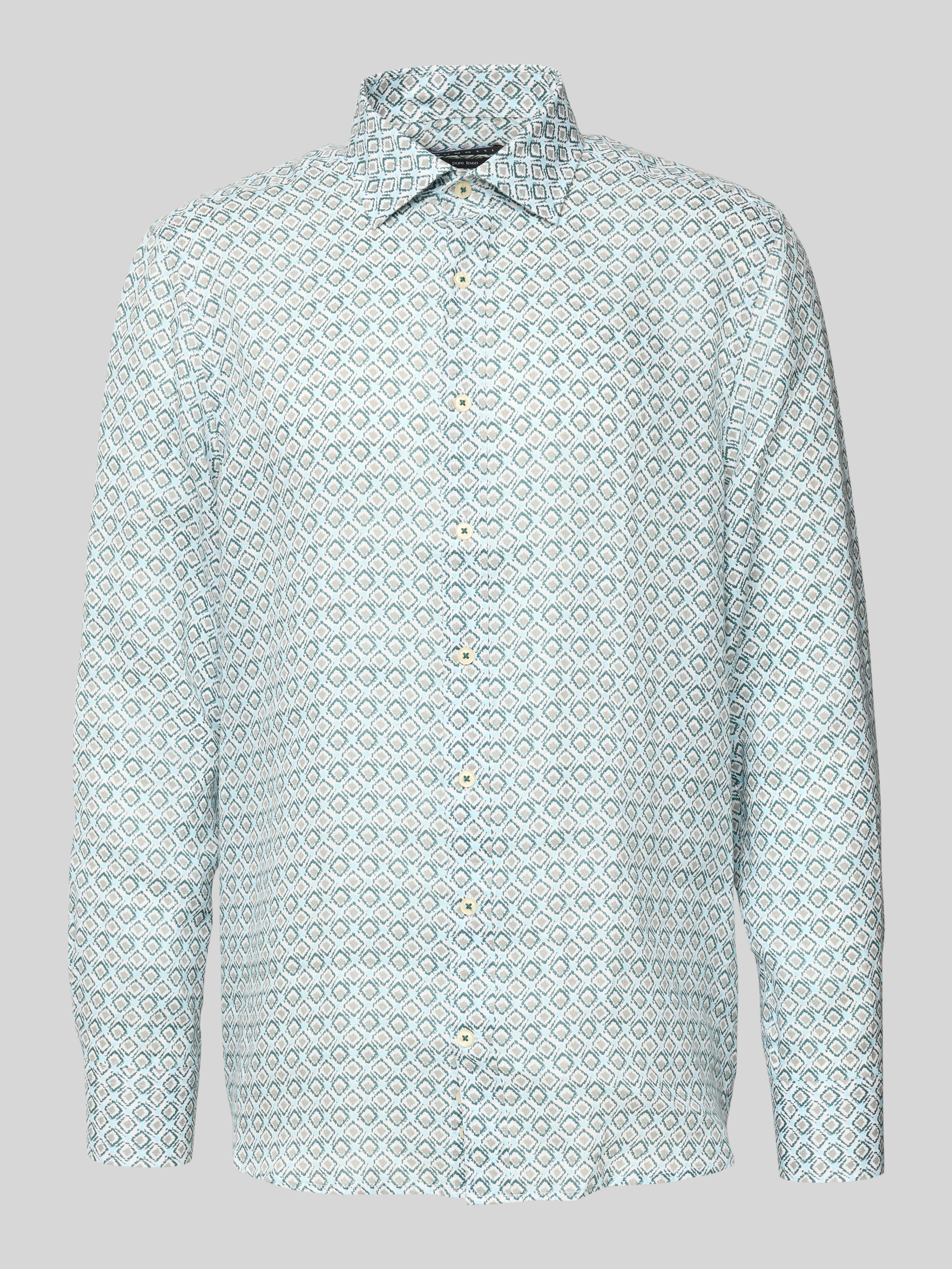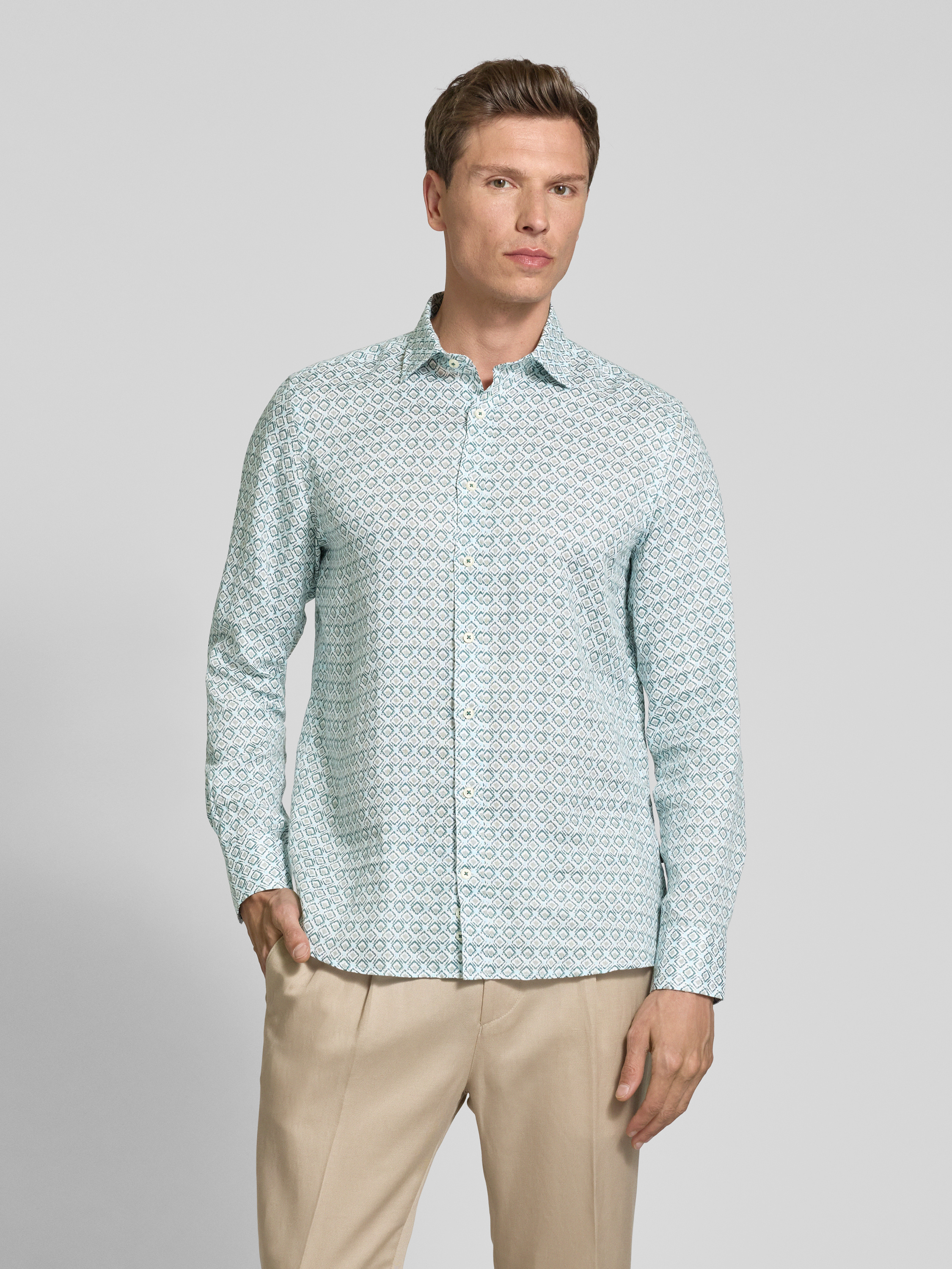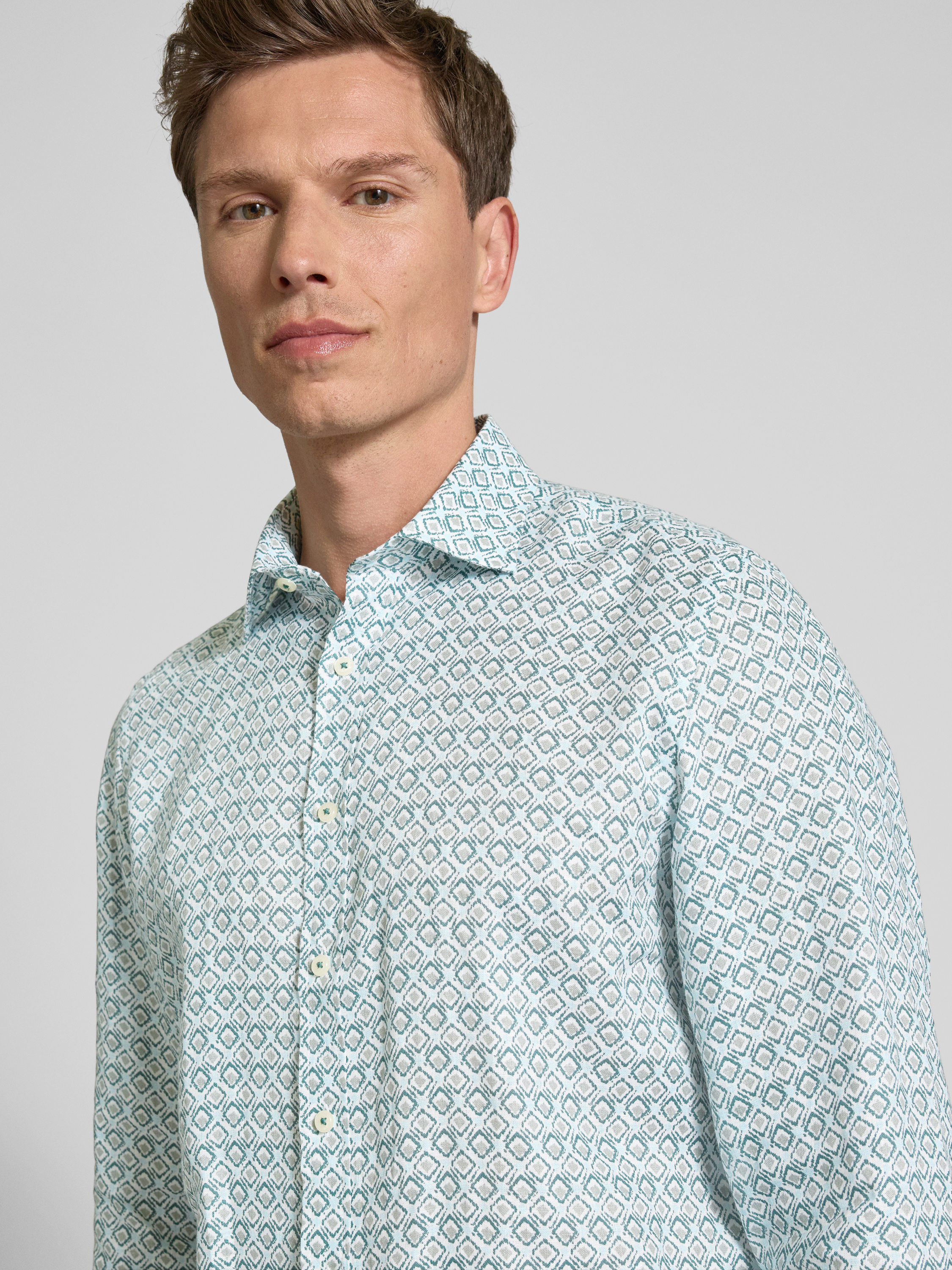 Das Herren Leinenhemd von bugatti, gefertigt aus reinem Leinen, kombiniert ein angenehmes Tragegefühl mit einer lockeren Regular-Fit-Passform. Der klassische Kentkragen und die durchgehende Knopfleiste verleihen dem langärmligen Design eine zeitlose Eleganz, während die Sportmanschetten für einen modernen Akzent sorgen.