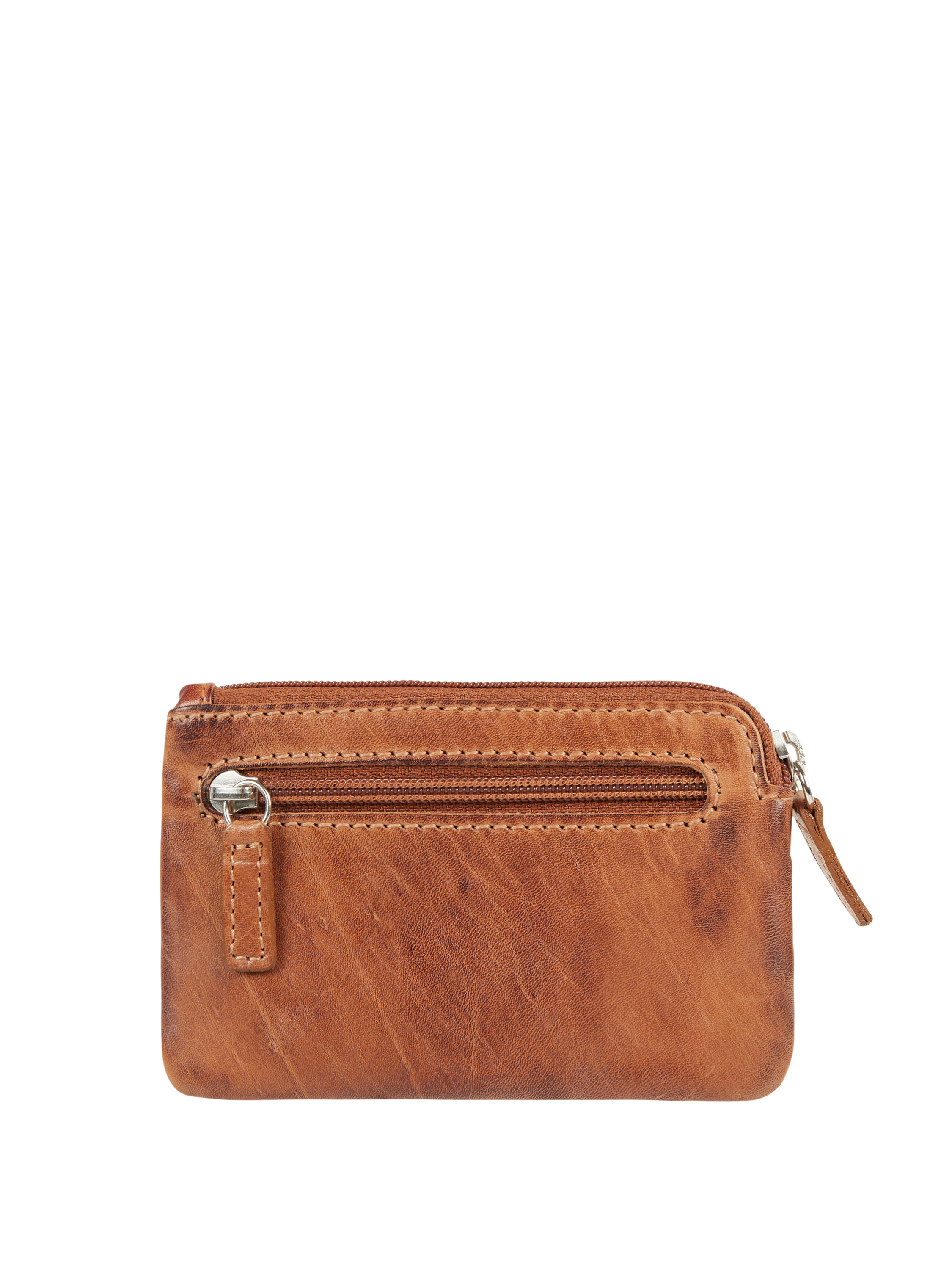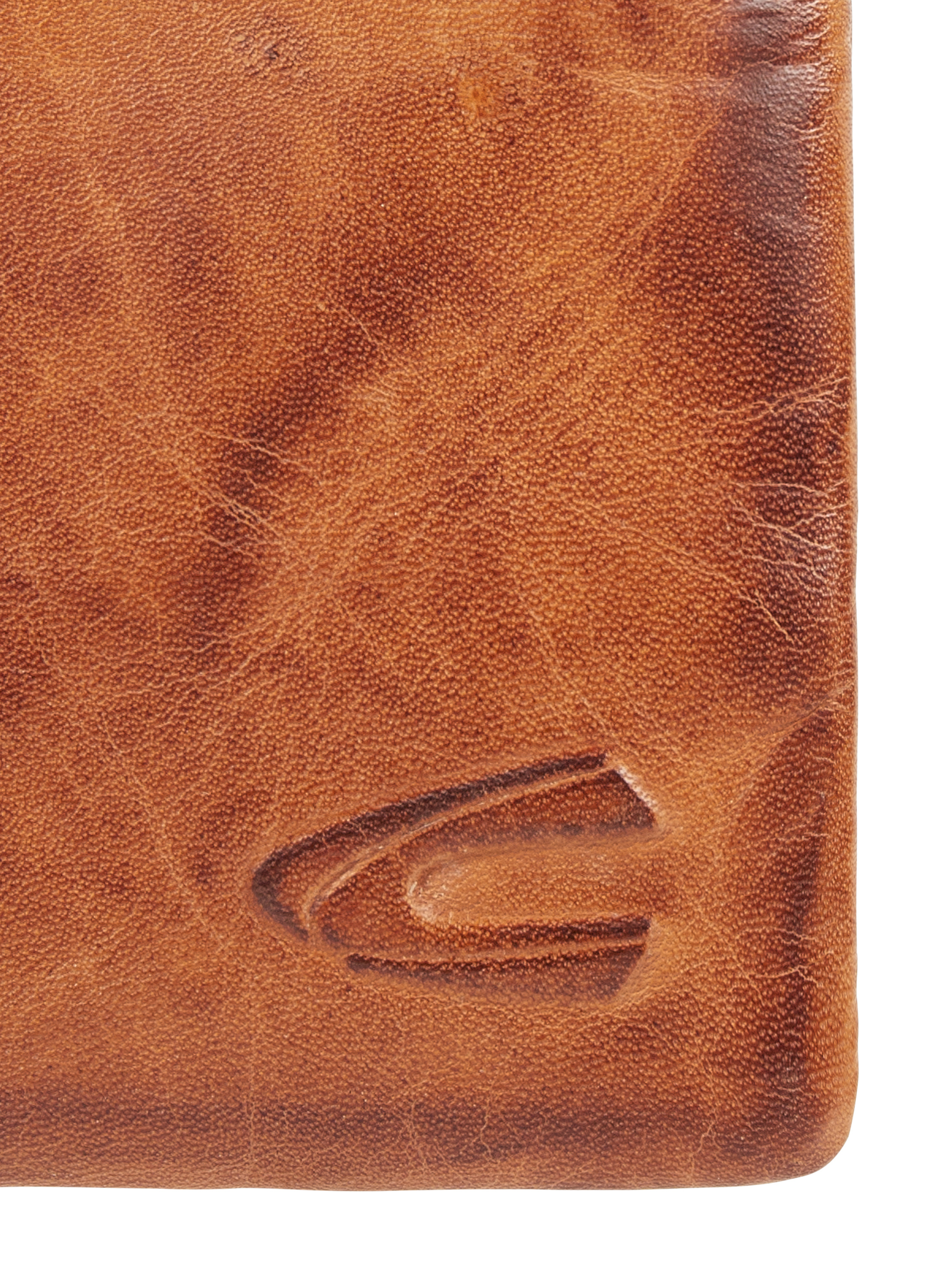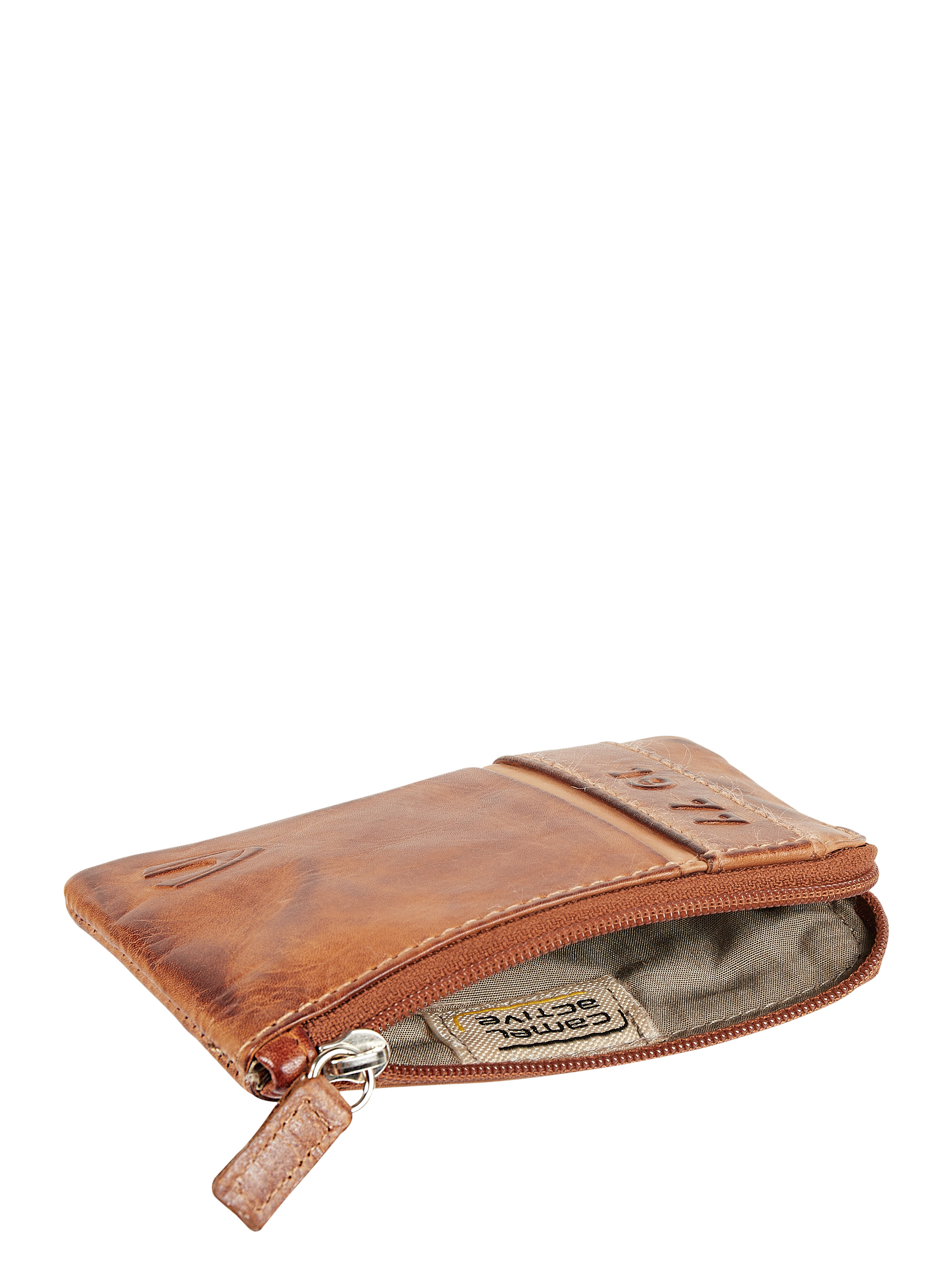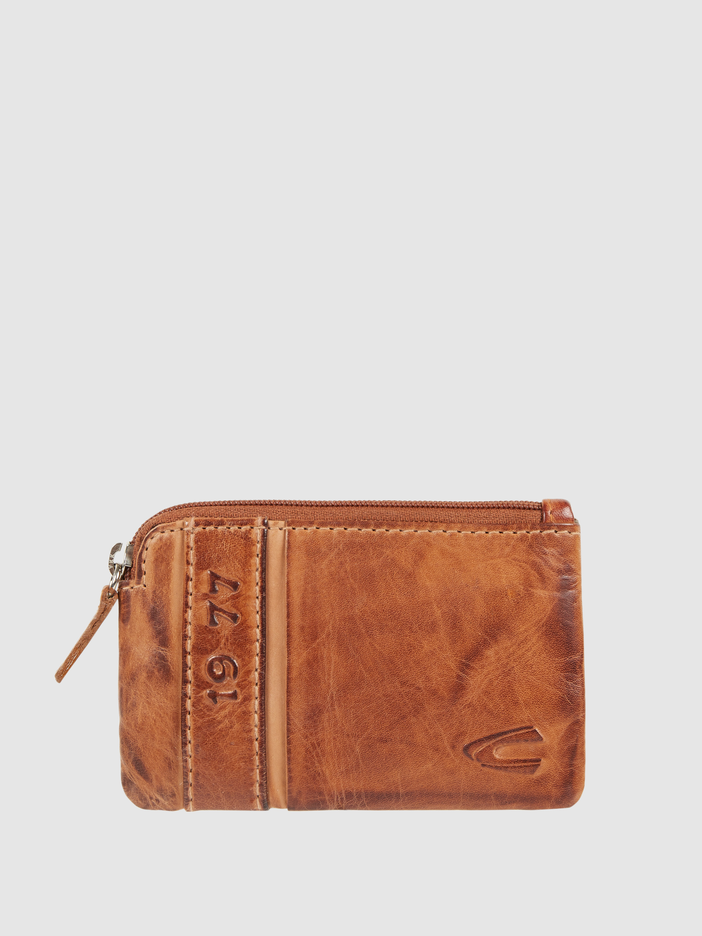 Das Schlüsseletui von camel active ist aus echtem Leder gefertigt. Es kommt im Retro-Look mit Reißverschlussfächern und Logo.
