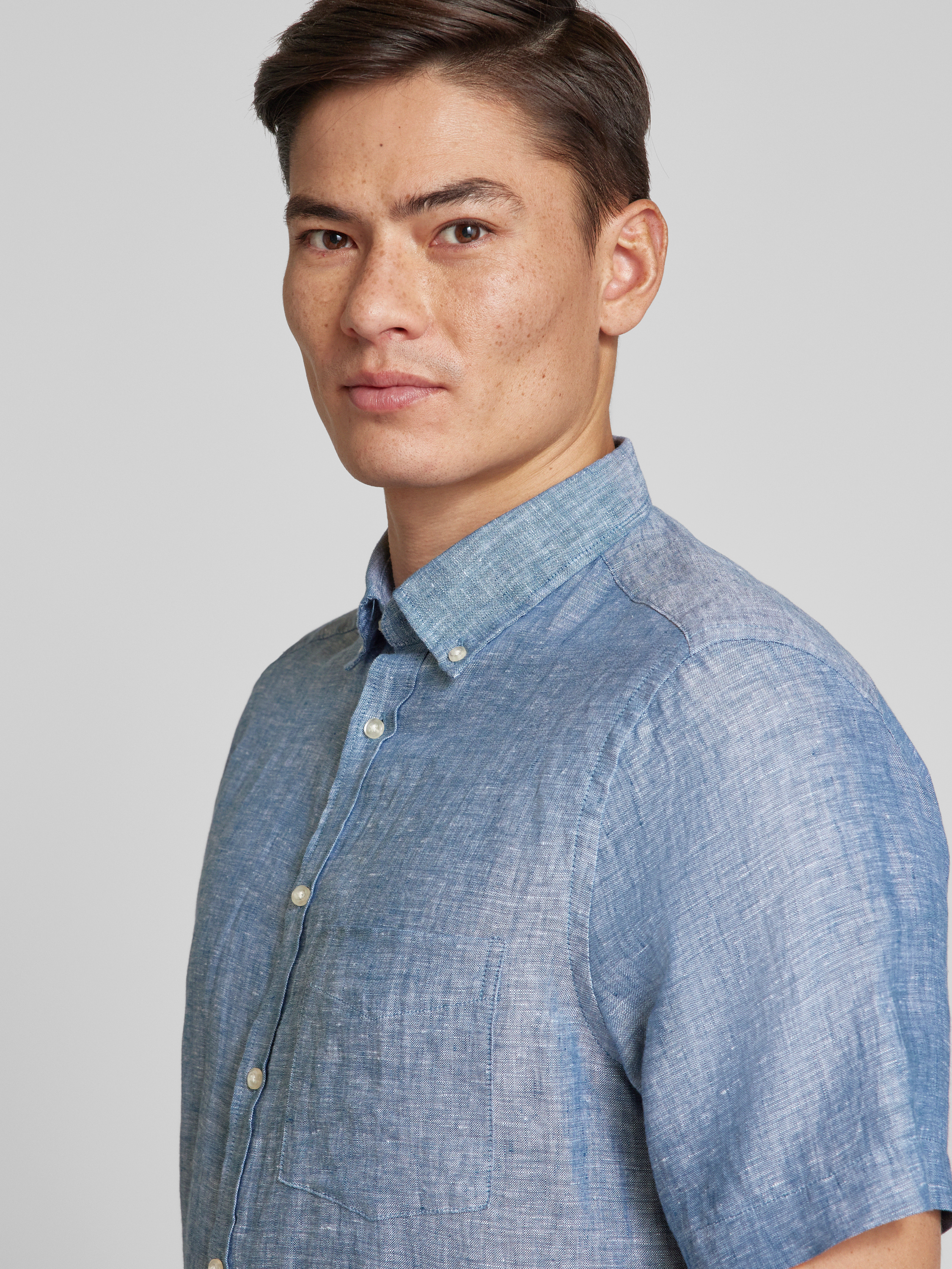 Das Herren Leinenhemd von Christian Berg Men vereint entspannten Regular Fit mit dem angenehmen Tragegefühl von reinem Leinen. Der Button-Down-Kragen verleiht dem Hemd einen klassischen Touch, während die halblangen Ärmel und die Brusttasche funktionale Akzente setzen. Ideal für warme Tage.