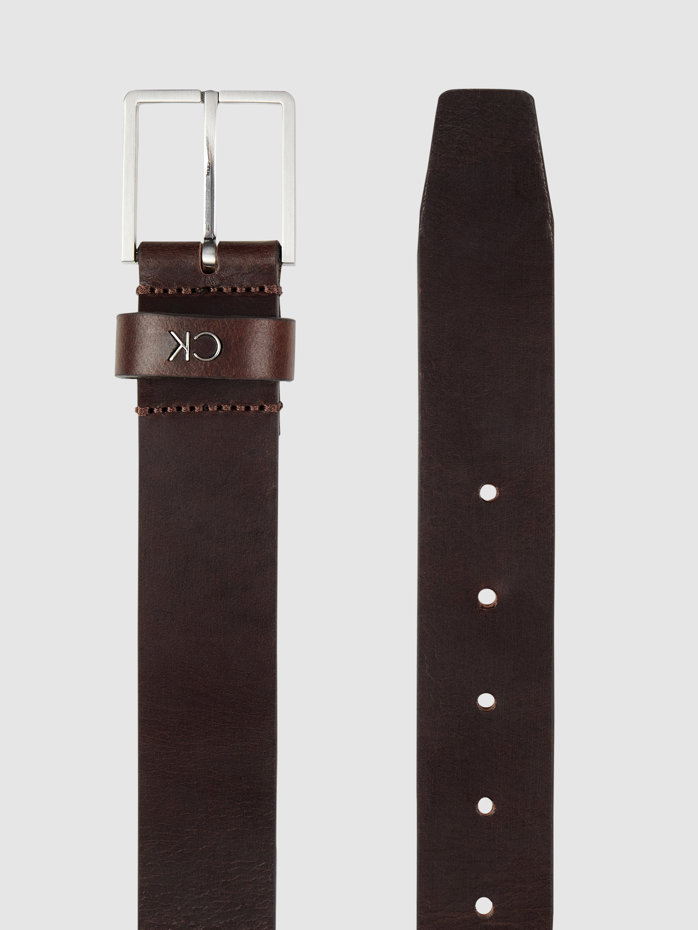 Der Gürtel von CK Calvin Klein ist aus echtem Büffelleder gefertigt. Er kommt mit Dornschließe, fixierter Gürtelschlaufe und Logo.