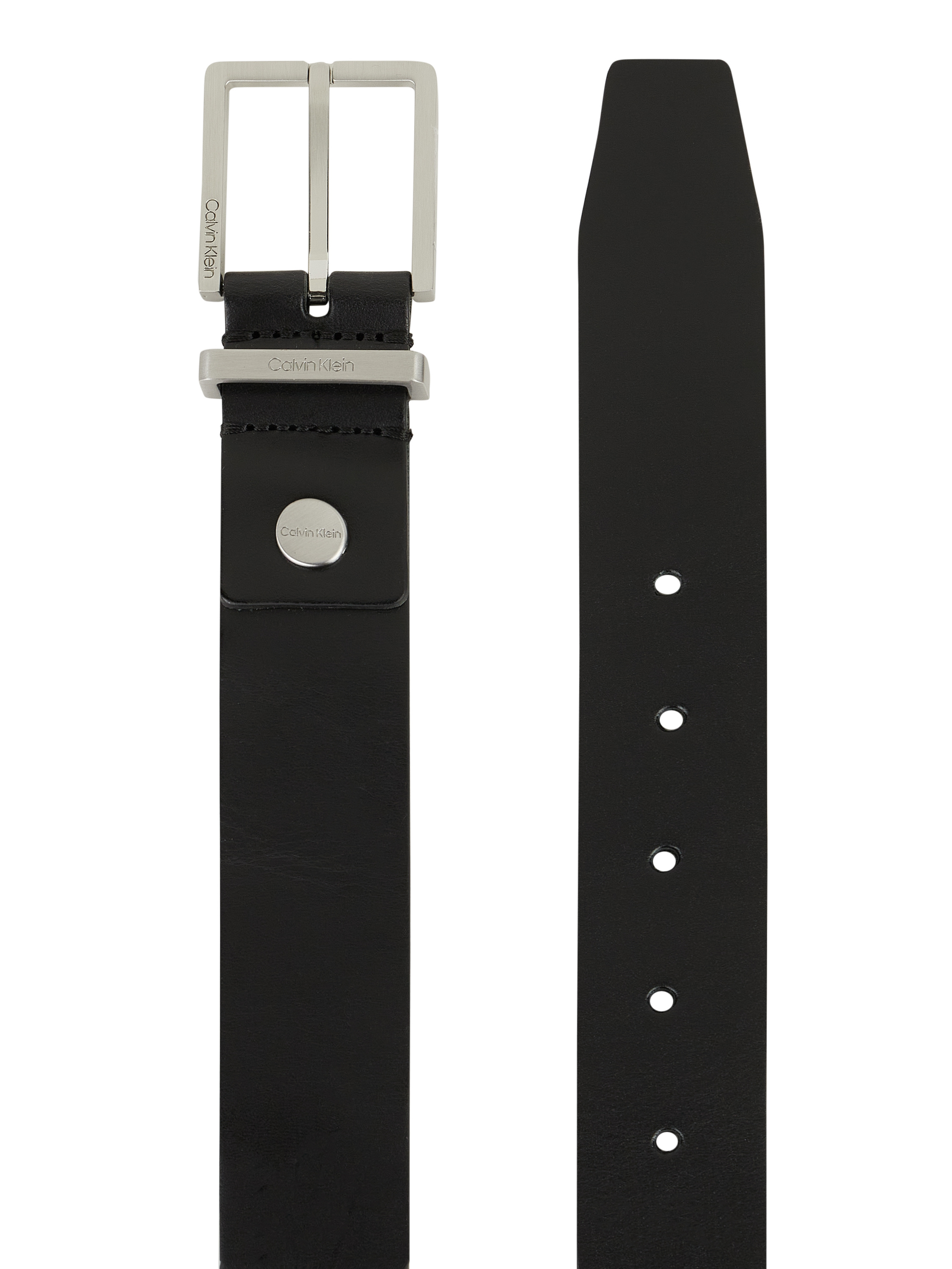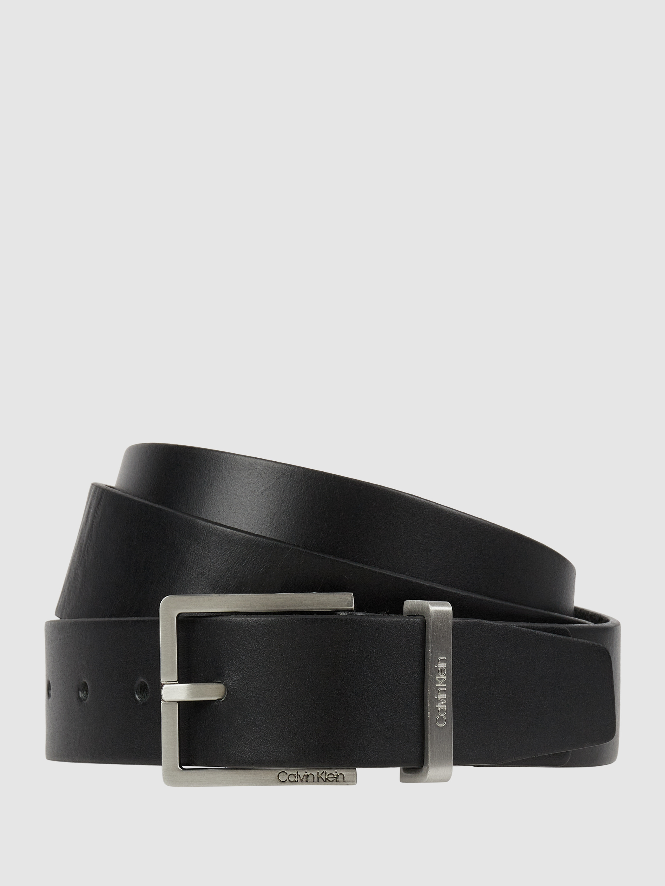 Der Gürtel von CK Calvin Klein ist aus echtem Leder gefertigt. Er zeigt sich mit Dornschließe aus Metall und kleinem Logo.