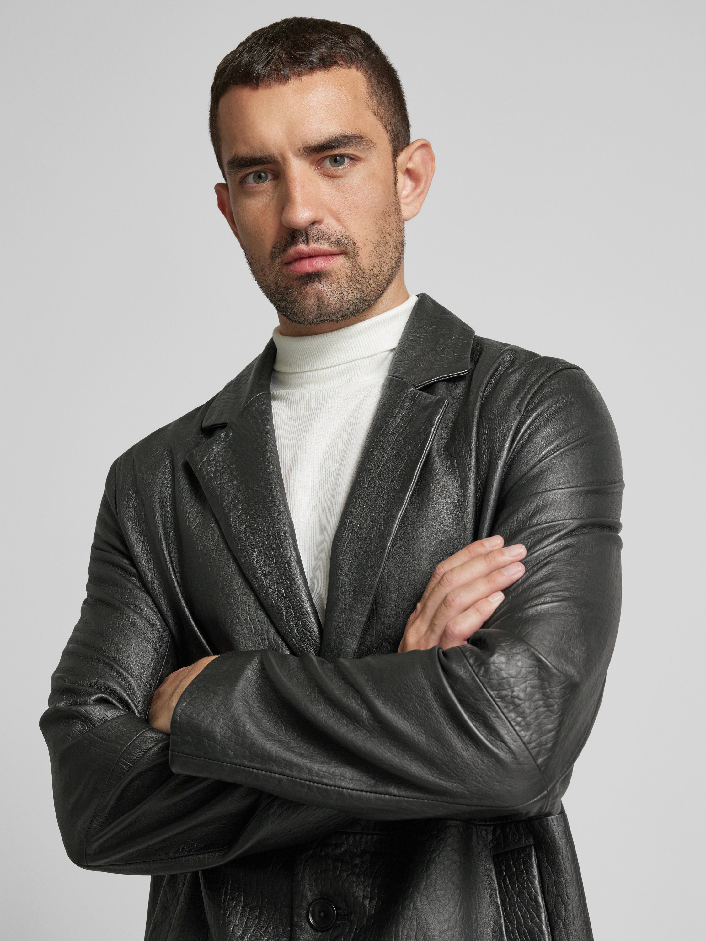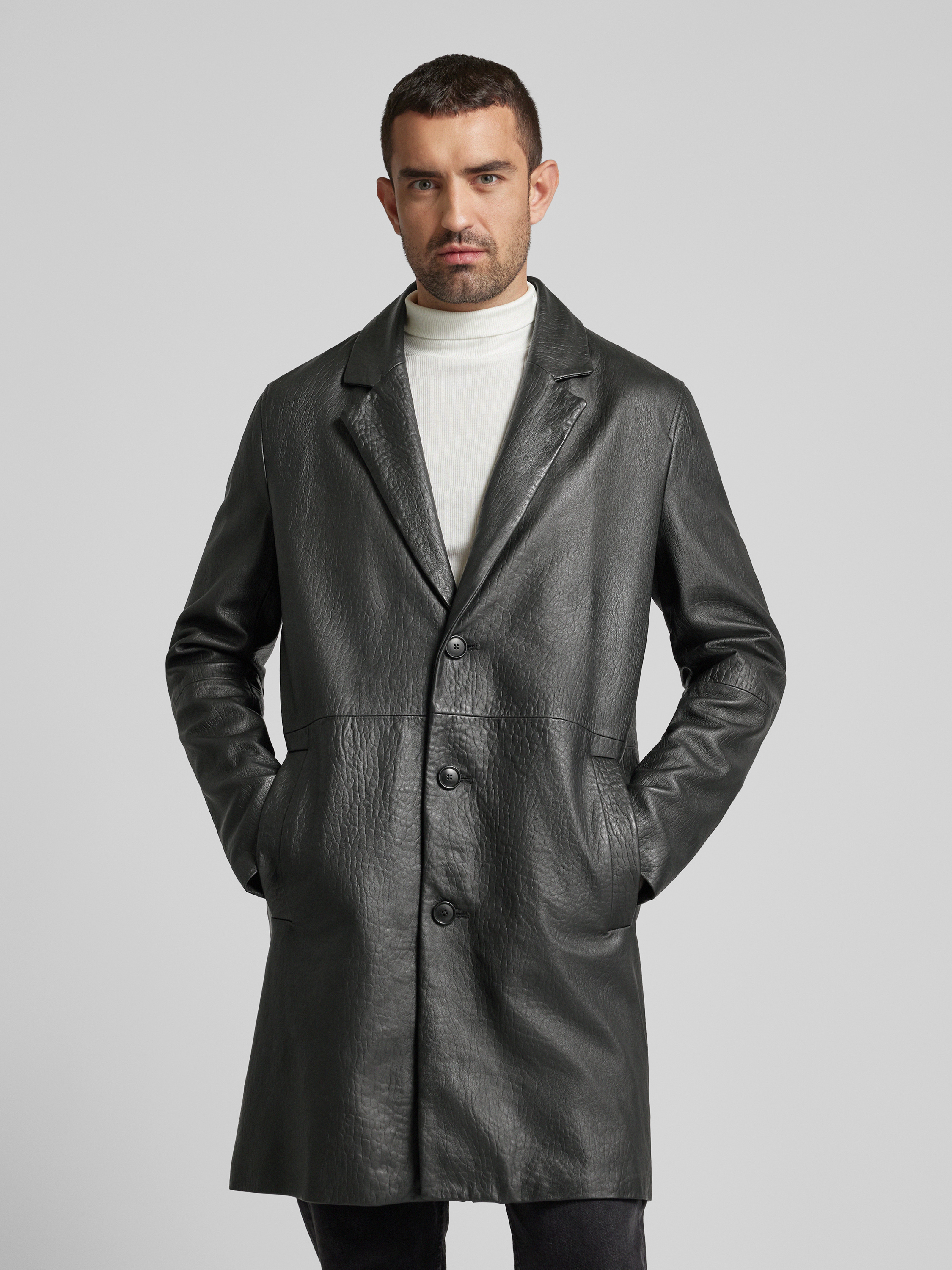 Der Herrenmantel 'Skolan' von DRYKORN präsentiert sich in einem geraden Schnitt aus reinem Leder, der durch seinen klassischen Reverskragen eine zeitlose Eleganz ausstrahlt. Die sorgfältig gesetzten Teilungsnähte verleihen dem Modell Struktur, während die Knopfleiste für eine dezente Geschlossenheit sorgt. Perfekt für jene, die stilvolle Schlichtheit schätzen.