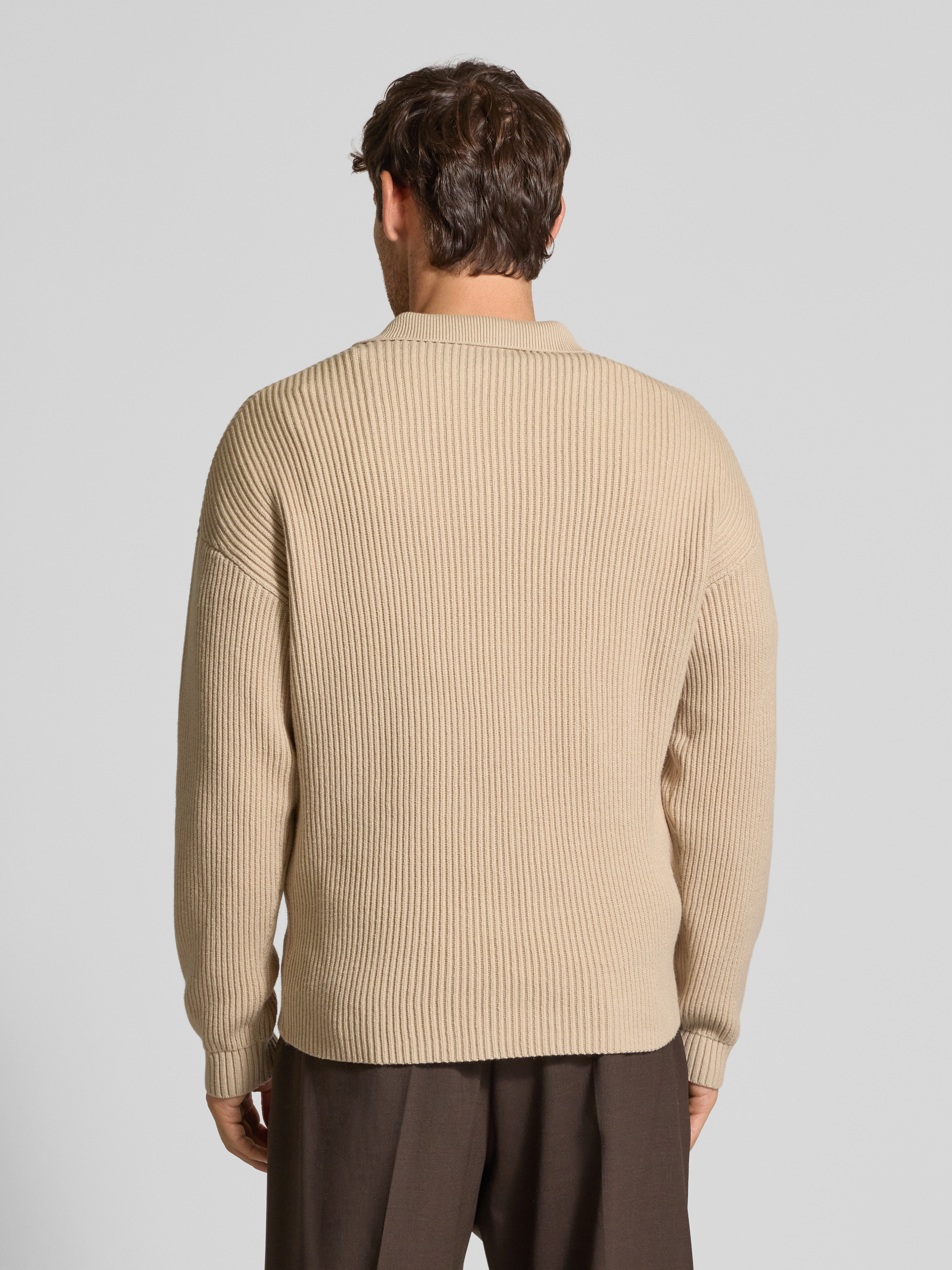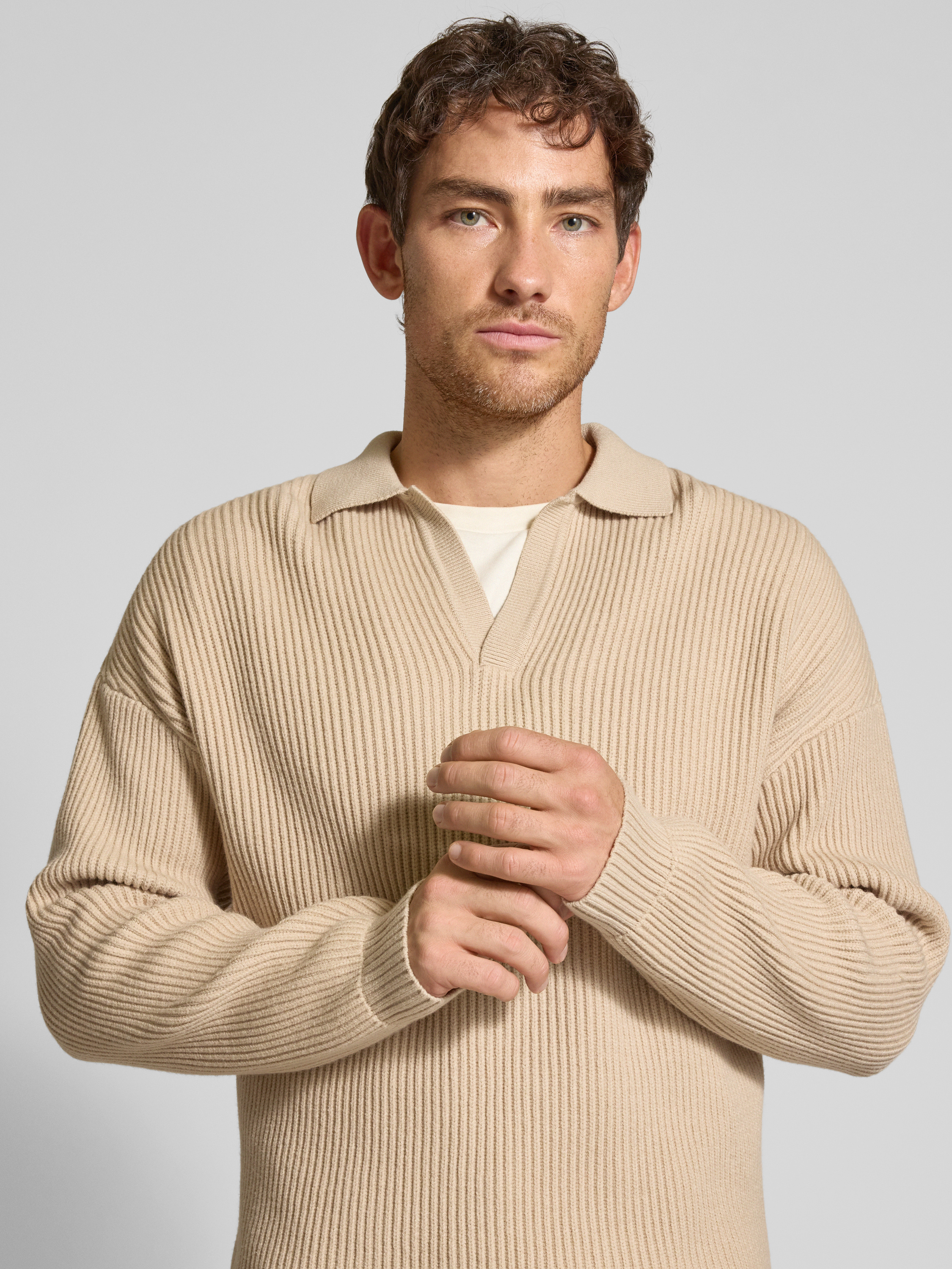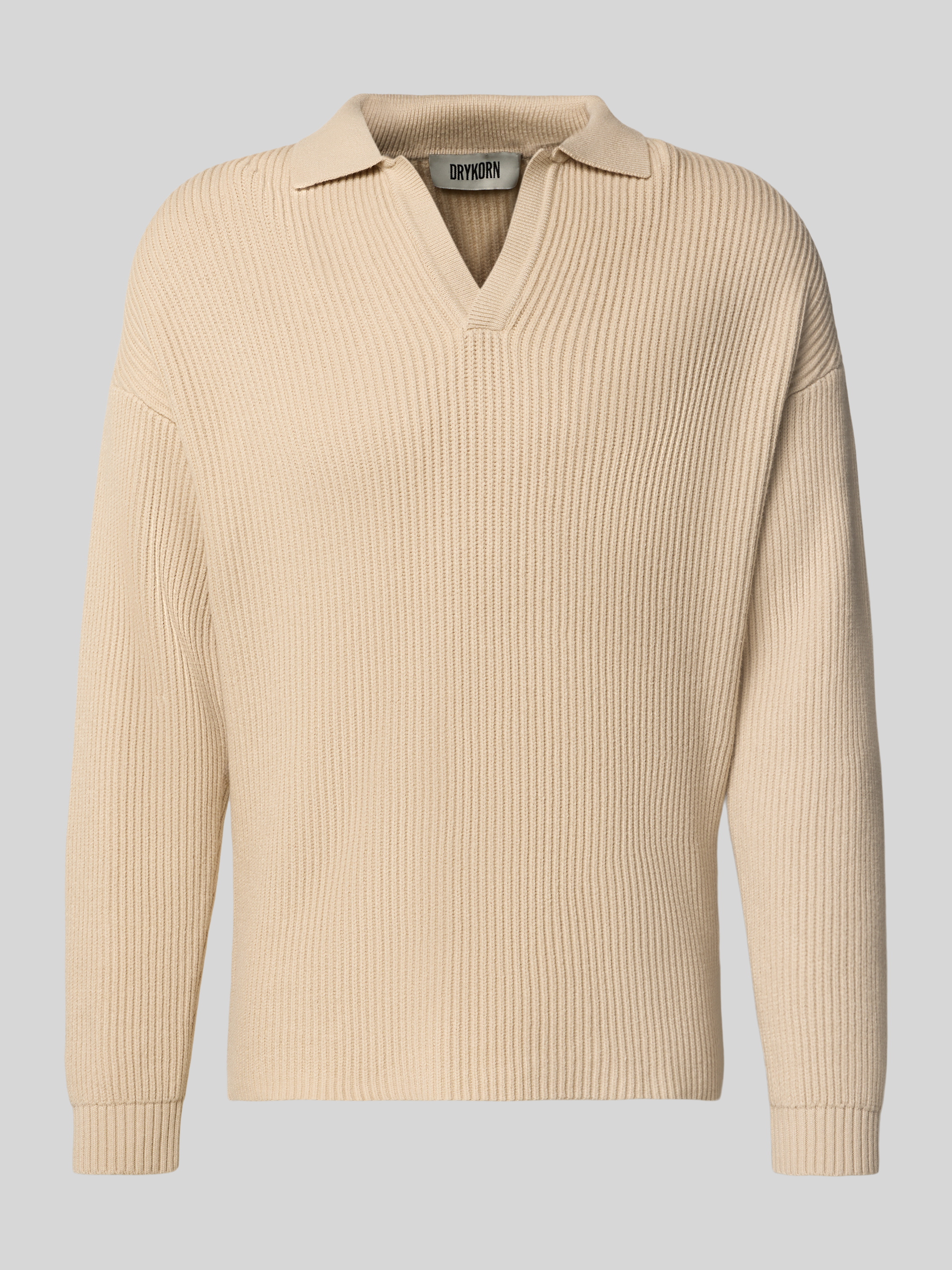 Der Herren Strickpullover von Drykorn im lockeren Schnitt fällt durch einen Polokragen mit V-Ausschnitt angenehm auf und schafft so einen entspannten Look. Ein Baumwoll-Mix sorgt dabei für ein angenehmes Gefühl auf der Haut, während gerippte Ärmelabschlüsse den lässigen Stil abrunden. Durch die legere Passform eignet sich das Modell vielseitig für Alltag und Freizeit.