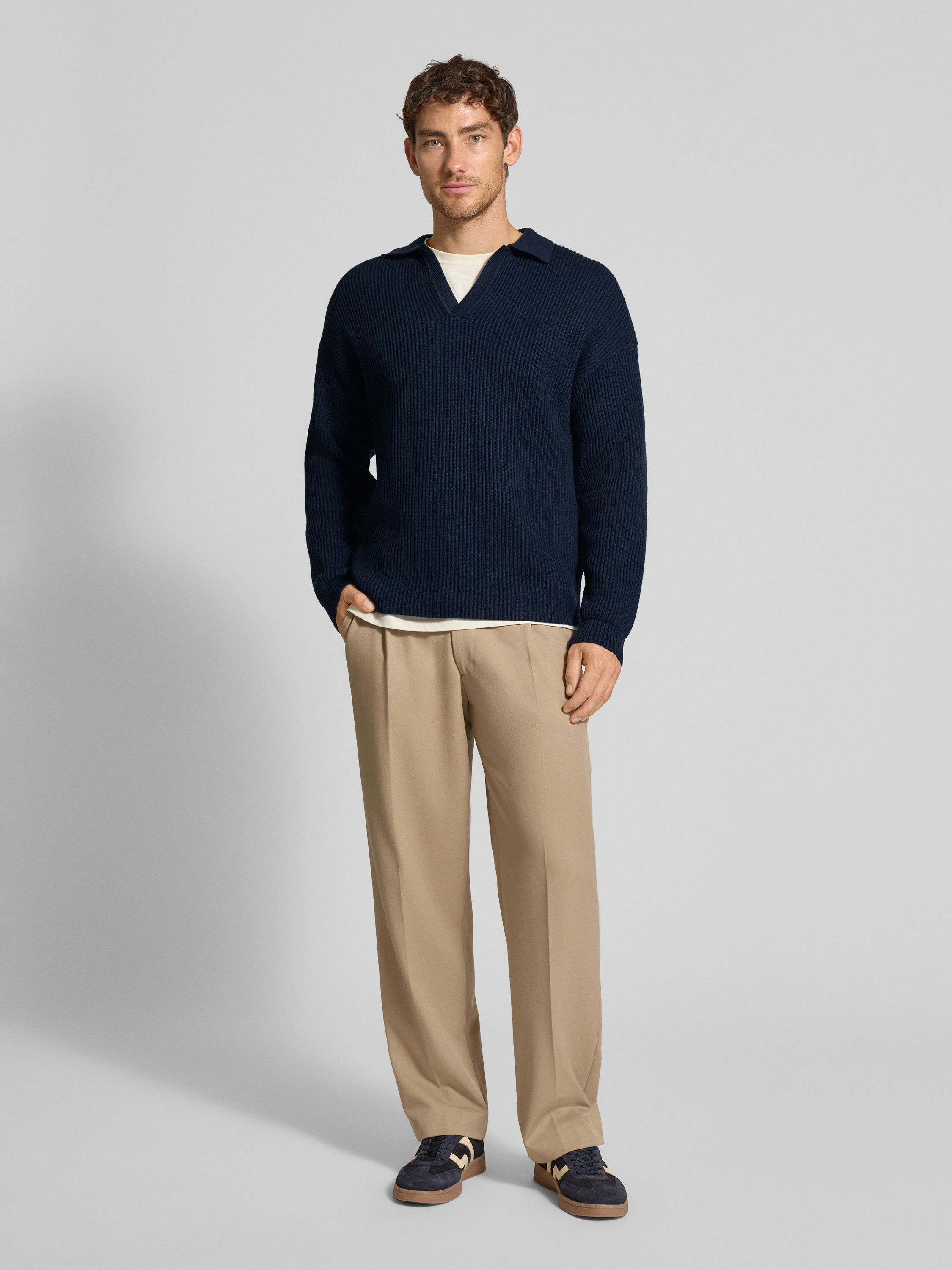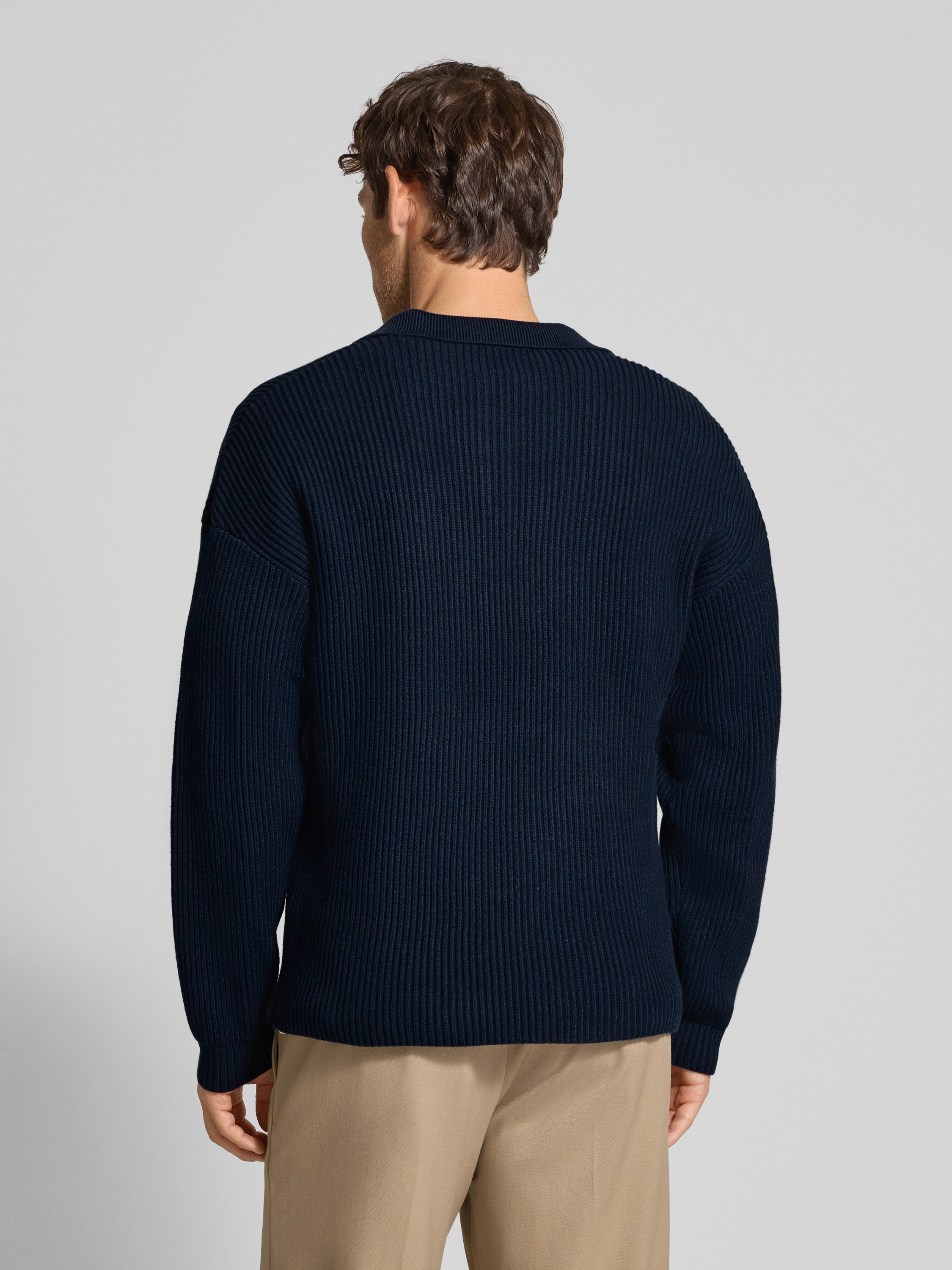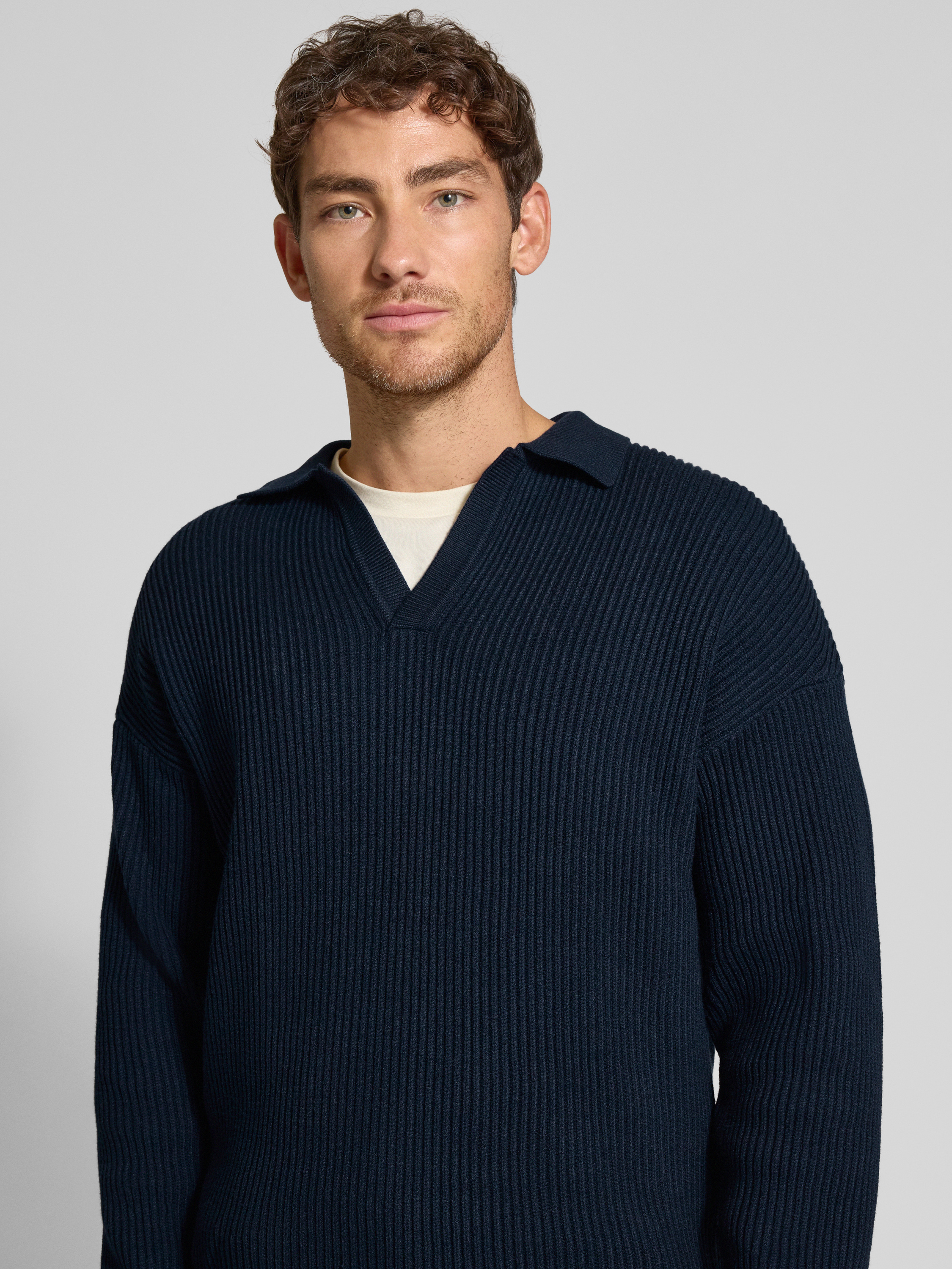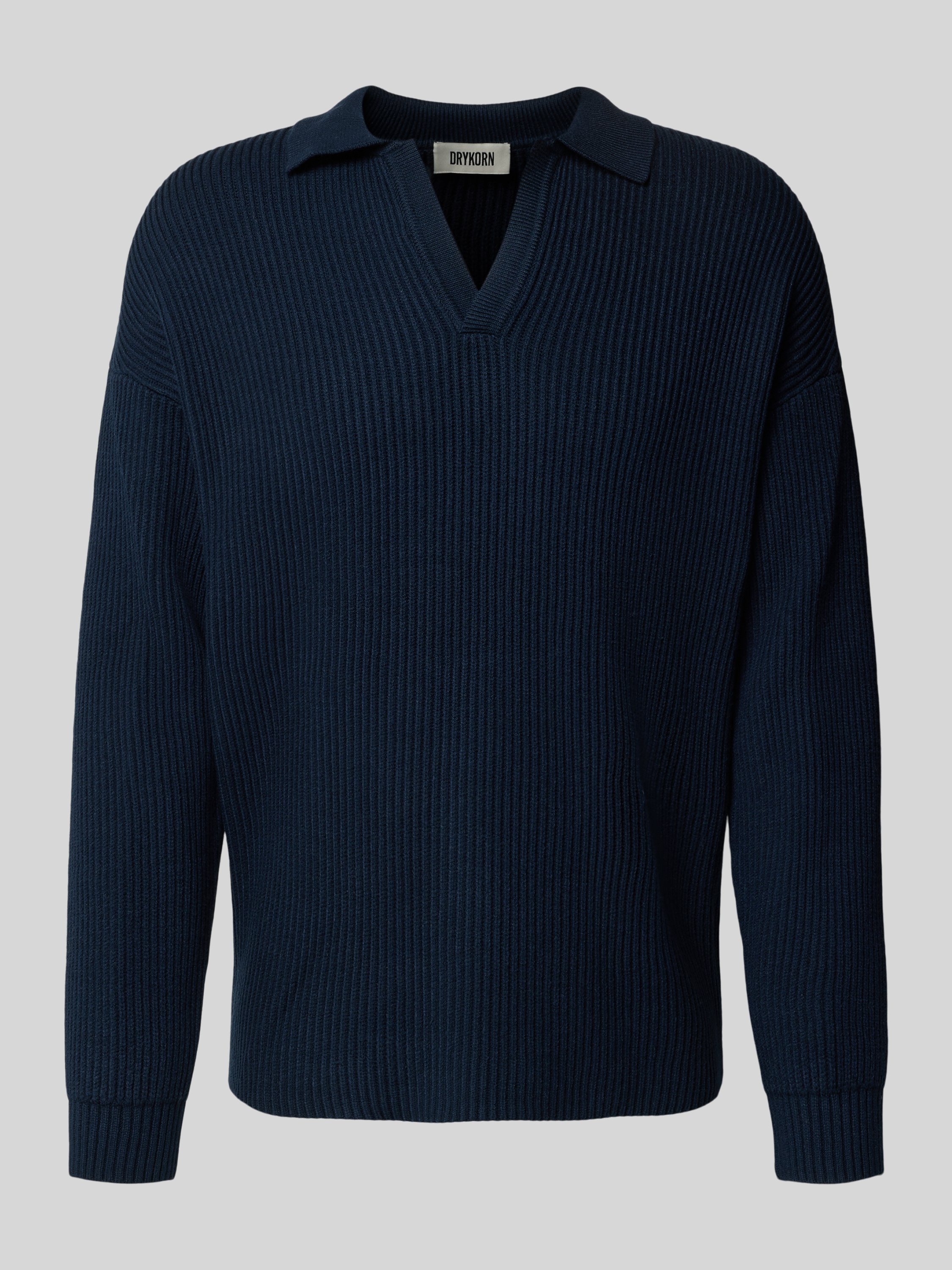 Der Herren Strickpullover von Drykorn im lockeren Schnitt fällt durch einen Polokragen mit V-Ausschnitt angenehm auf und schafft so einen entspannten Look. Ein Baumwoll-Mix sorgt dabei für ein angenehmes Gefühl auf der Haut, während gerippte Ärmelabschlüsse den lässigen Stil abrunden. Durch die legere Passform eignet sich das Modell vielseitig für Alltag und Freizeit.