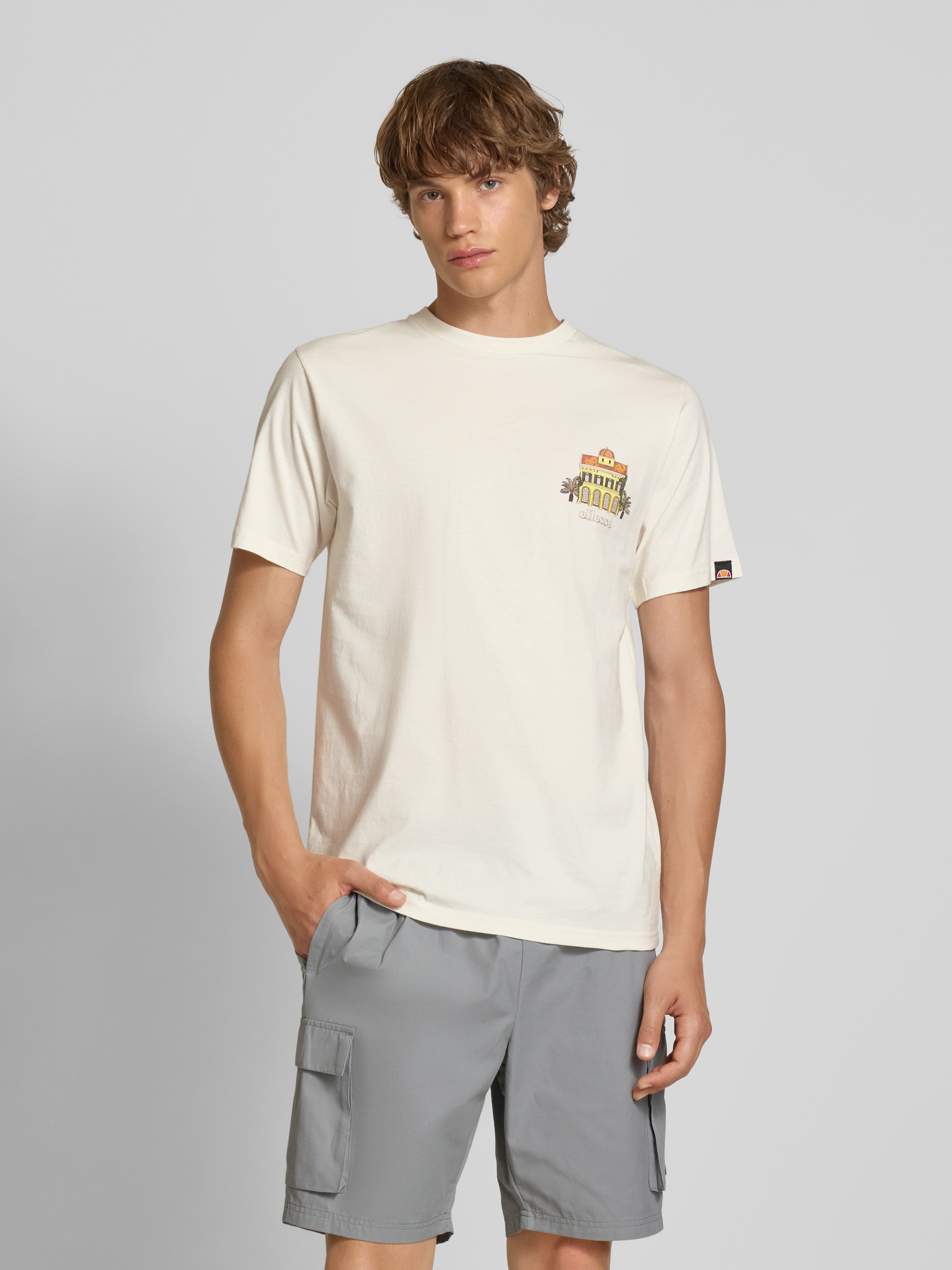 Das Ellesse T-Shirt Modell 'PIAZZO' aus reiner Baumwolle vereint Komfort und Stil. Der gerade Schnitt und der Rundhalsausschnitt sorgen für eine bequeme Passform, während der auffällige Motiv-Print auf Vorder- und Rückseite ein modisches Statement setzt. Ideal für lässige Alltagslooks.
