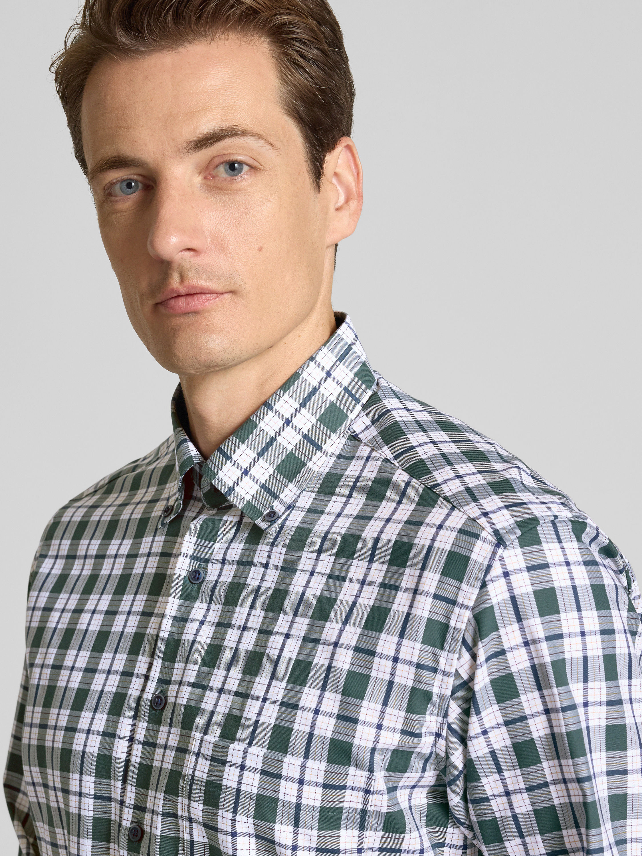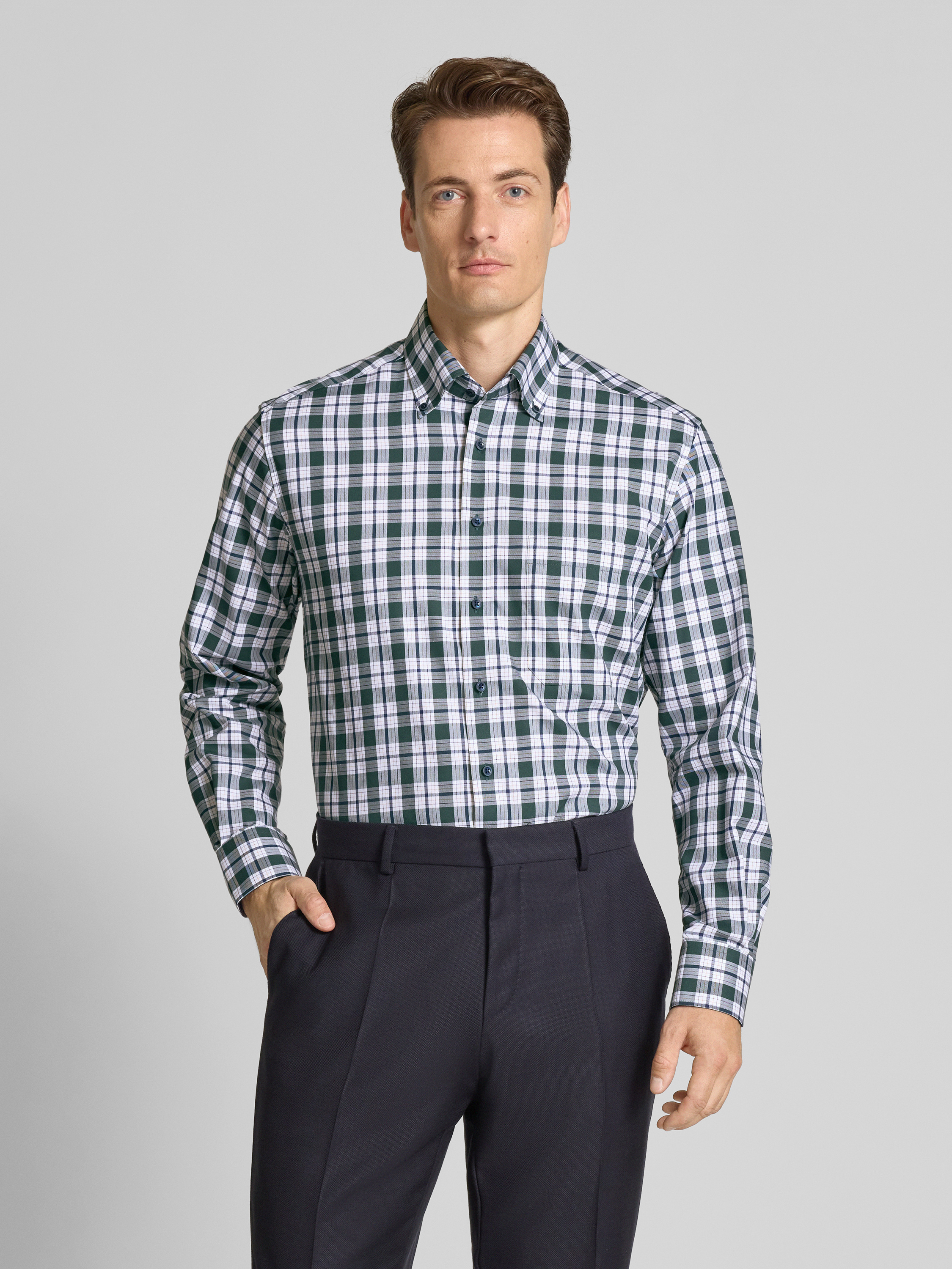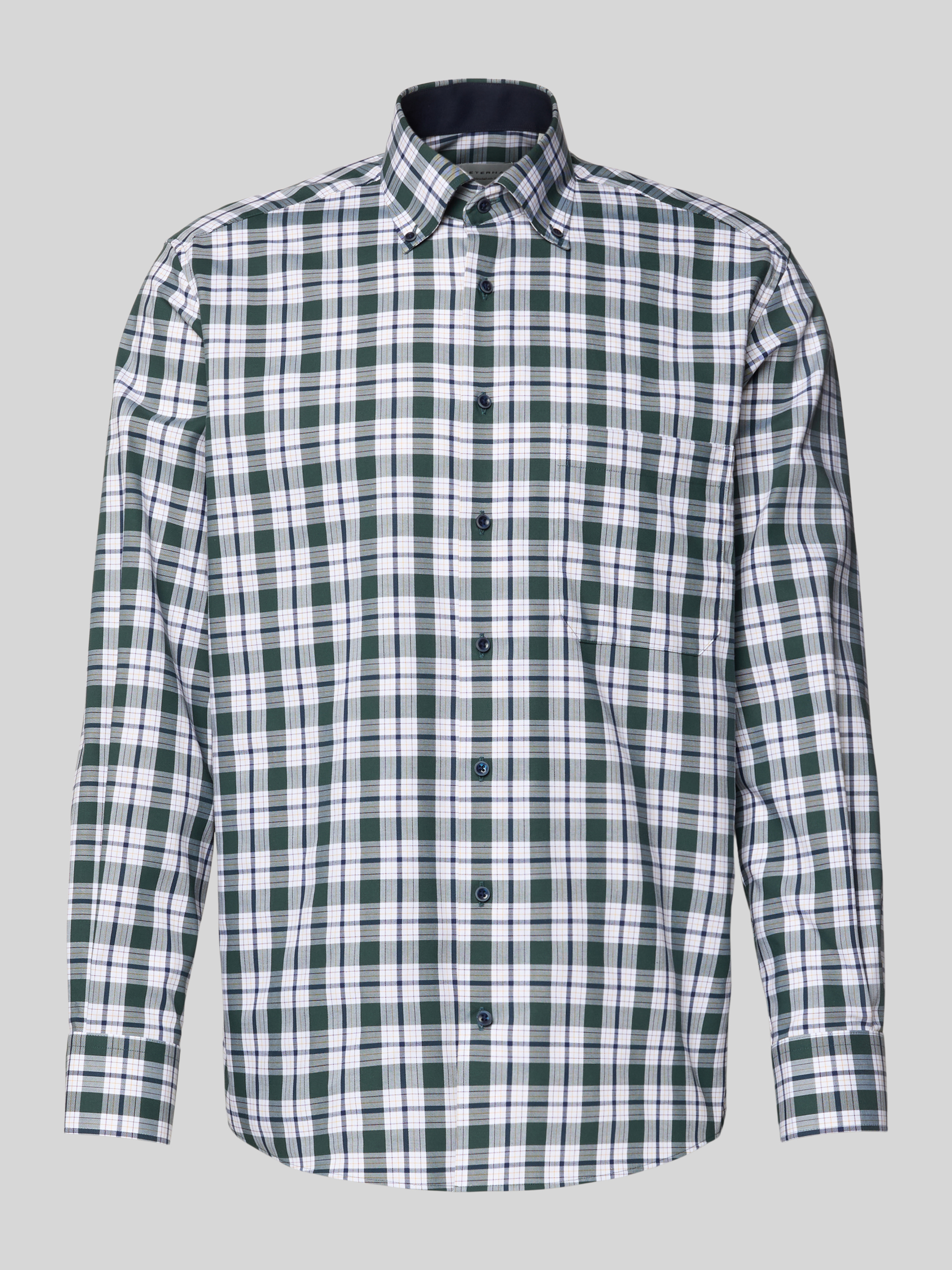 Das Herrenhemd Comfort Fit von ETERNA aus reiner Baumwolle liegt angenehm auf der Haut und sorgt dank weiter Schnittführung für Bewegungsfreiheit. Ein klassischer Button-Down-Kragen und die dezente Brusttasche unterstreichen den zeitlosen Charakter. Für den Büroalltag eignet sich das Modell ebenso wie für formelle Anlässe.
