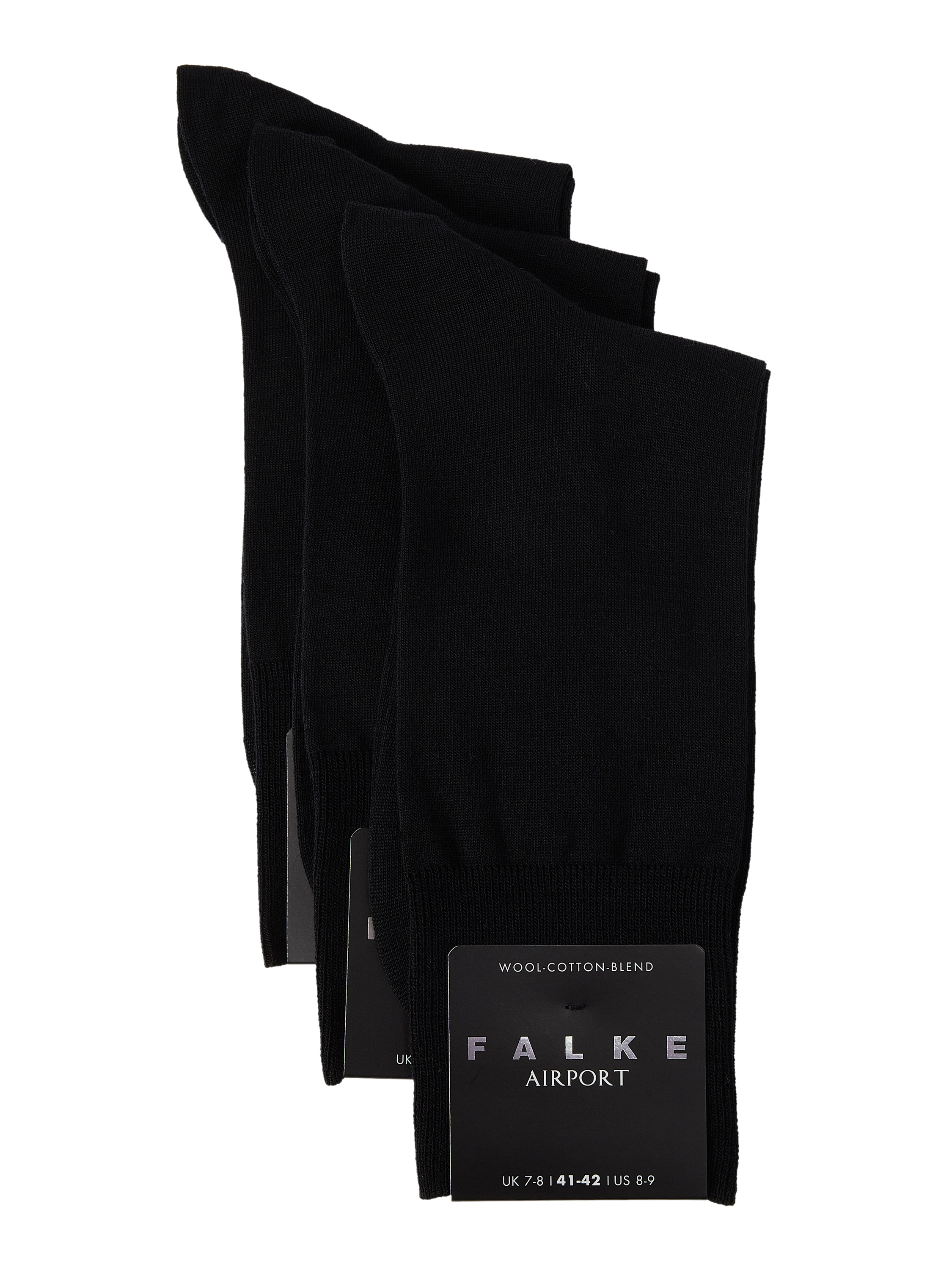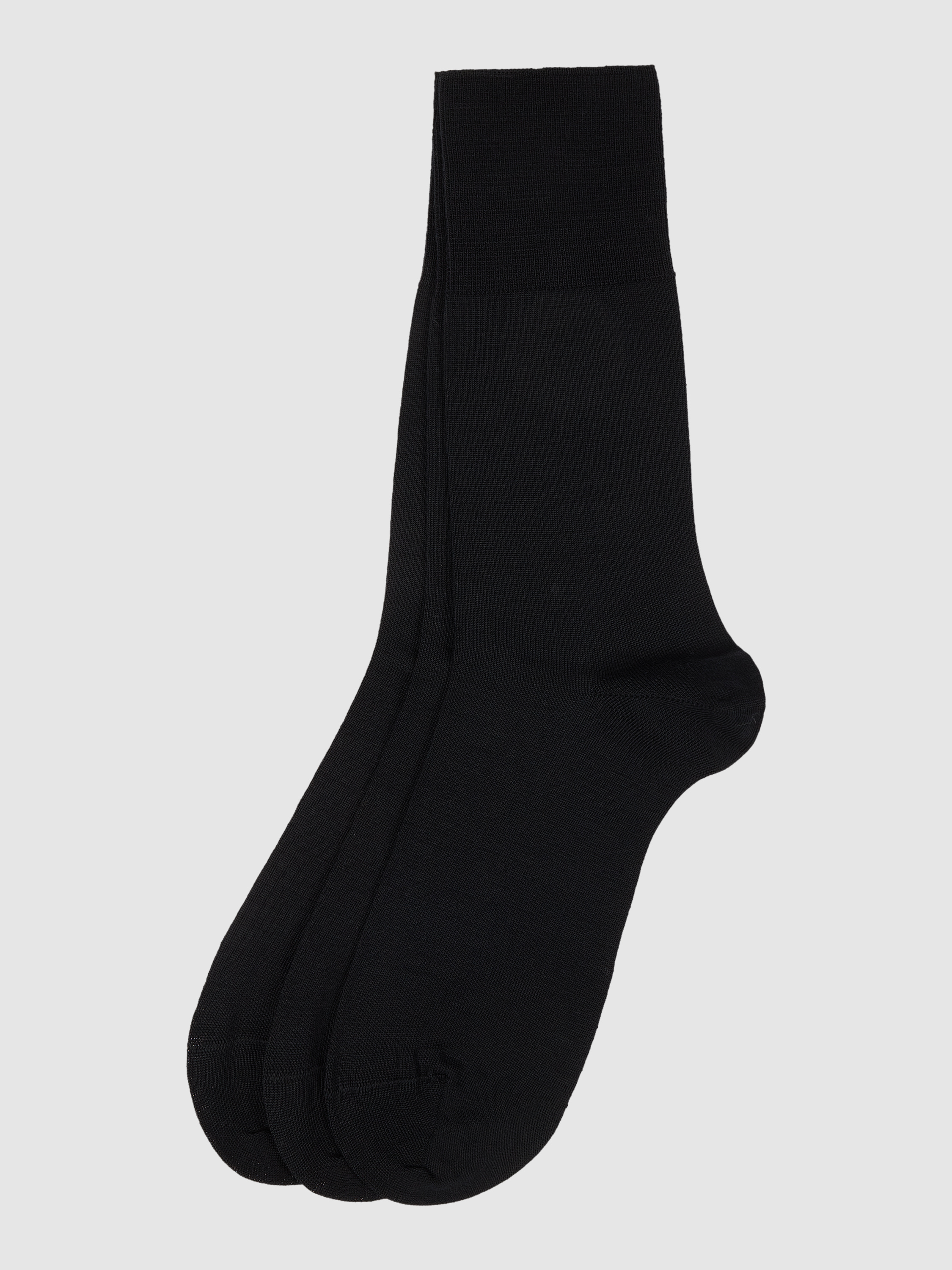 Die FALKE Socken aus einer Schurwollmischung bieten mit ihrem Baumwoll- und Stretch-Anteil hohen Tragekomfort. Im 3er-Pack erhältlich, sorgen verstärkte Belastungszonen für Langlebigkeit. Der elastische Bund sorgt für einen angenehmen Sitz, während das dezente Logo Eleganz verleiht.