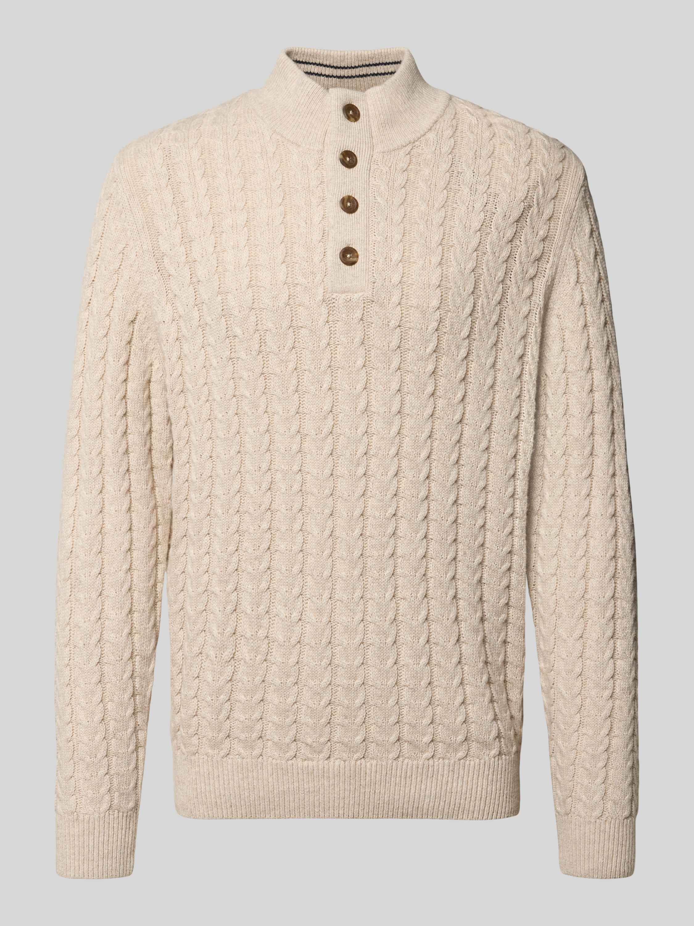 Der Herren Strickpullover von Fynch-Hatton verbindet einen klassischen Regular Fit mit dem angenehmen Tragegefühl eines Baumwoll-Woll-Mix. Durch den Stehkragen erhält das Modell eine sportliche Note, während gerippte Abschlüsse für Formstabilität sorgen. So lässt sich das Oberteil vielseitig kombinieren und passt zu unterschiedlichen Anlässen.