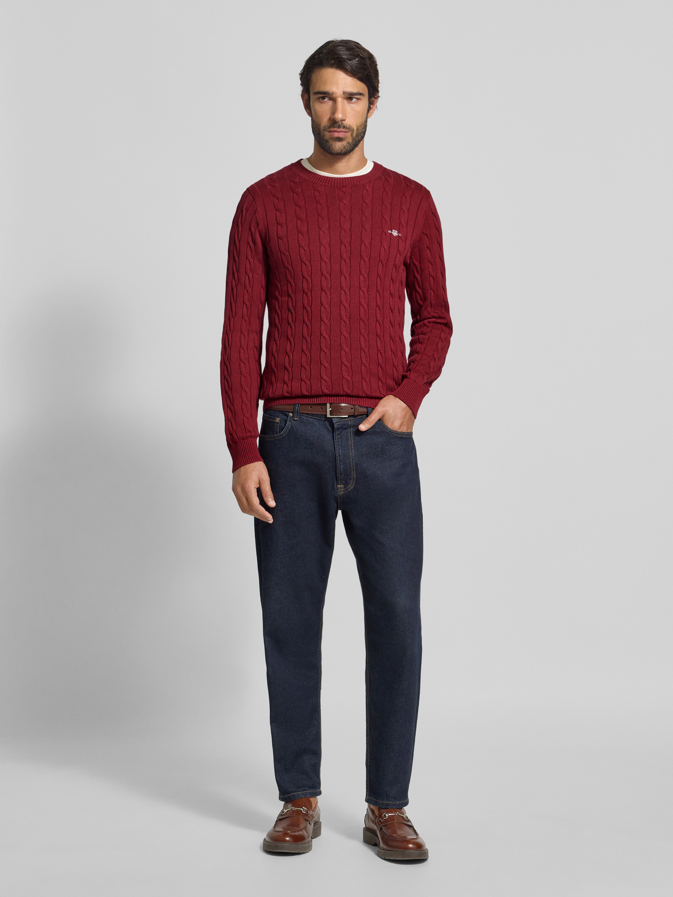 Der Herren Strickpullover von Gant setzt auf reine Baumwolle und vermittelt durch den Regular Fit eine angenehme Passform, die sich für viele Gelegenheiten eignet. Gerippte Abschlüsse und ein Rundhalsausschnitt unterstreichen den klassischen Charakter, während das dezente Label-Stitching einen zurückhaltenden Akzent setzt. So entsteht ein Kleidungsstück, das sich unkompliziert kombinieren lässt und für Komfort im Alltag sorgt.
