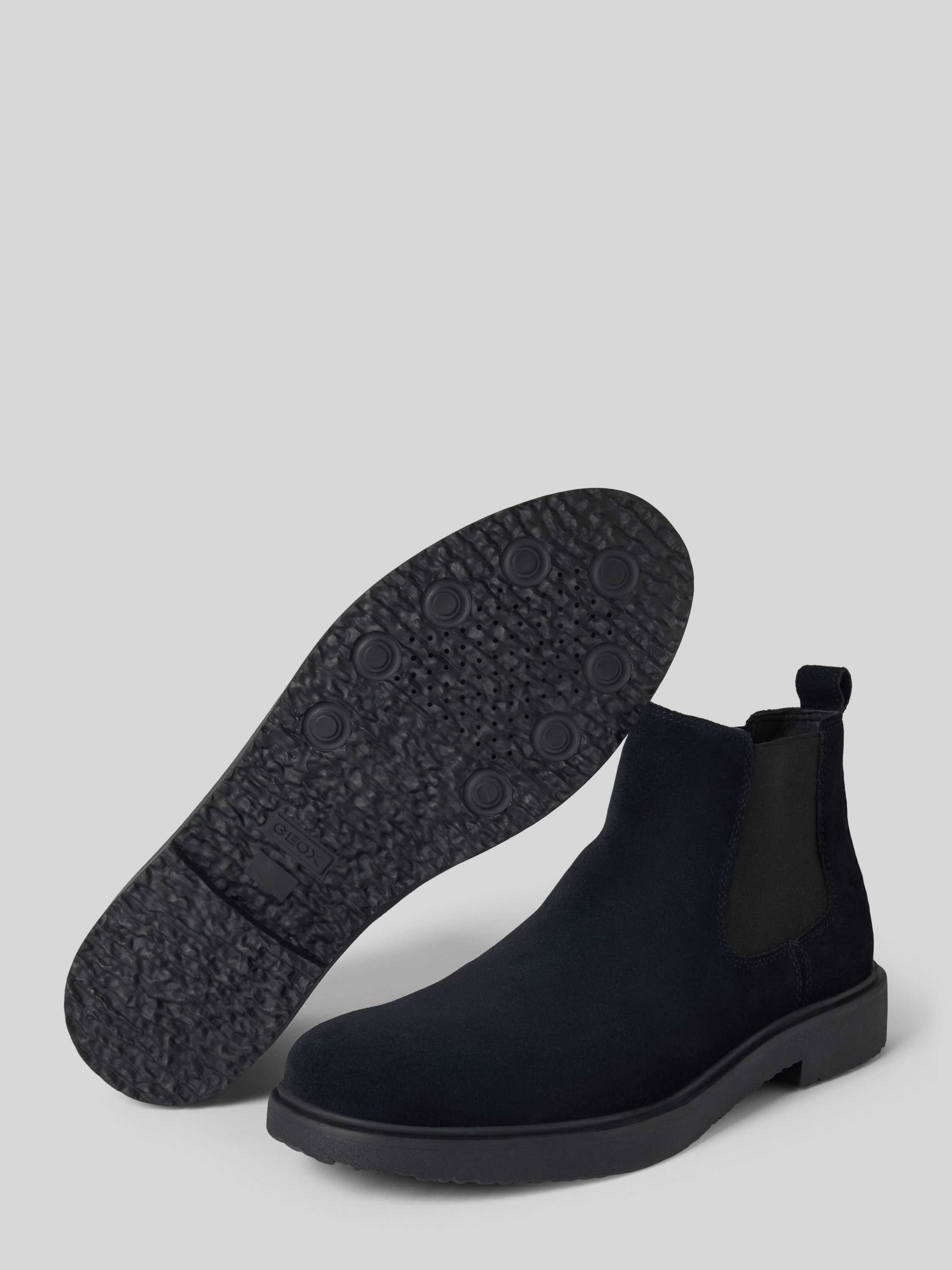 Der Herrenschuh Chelsea Boots mit Zugschlaufe von Geox Modell 'MASSIMIANO' besteht aus echtem Leder und zeigt sich in einer abgerundeten Form. Durch die strukturiert gearbeitete Sohle erhält der Fuß einen festen Stand auf verschiedenen Untergründen. Praktische Details wie elastische Einsätze erleichtern das An- und Ausziehen.