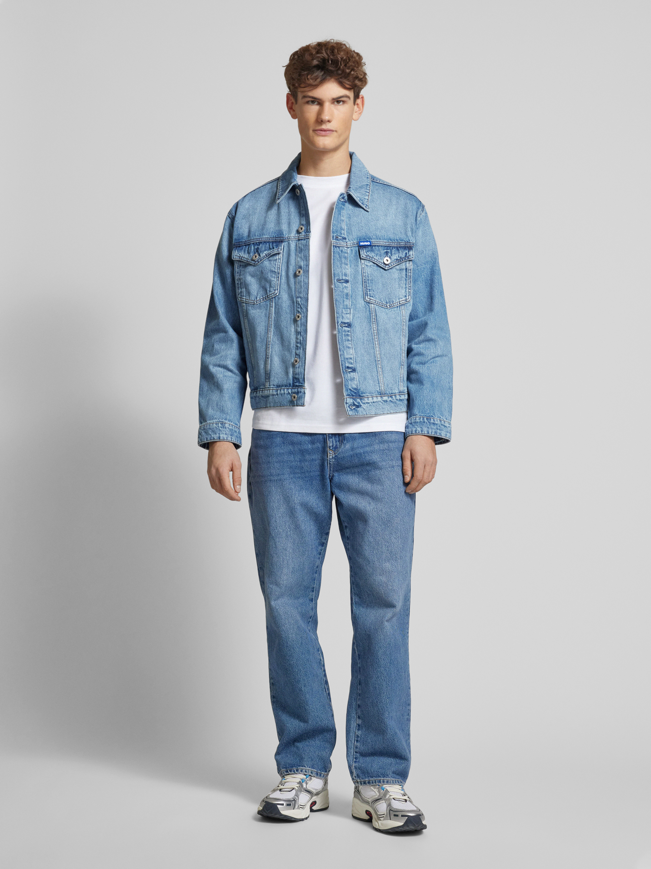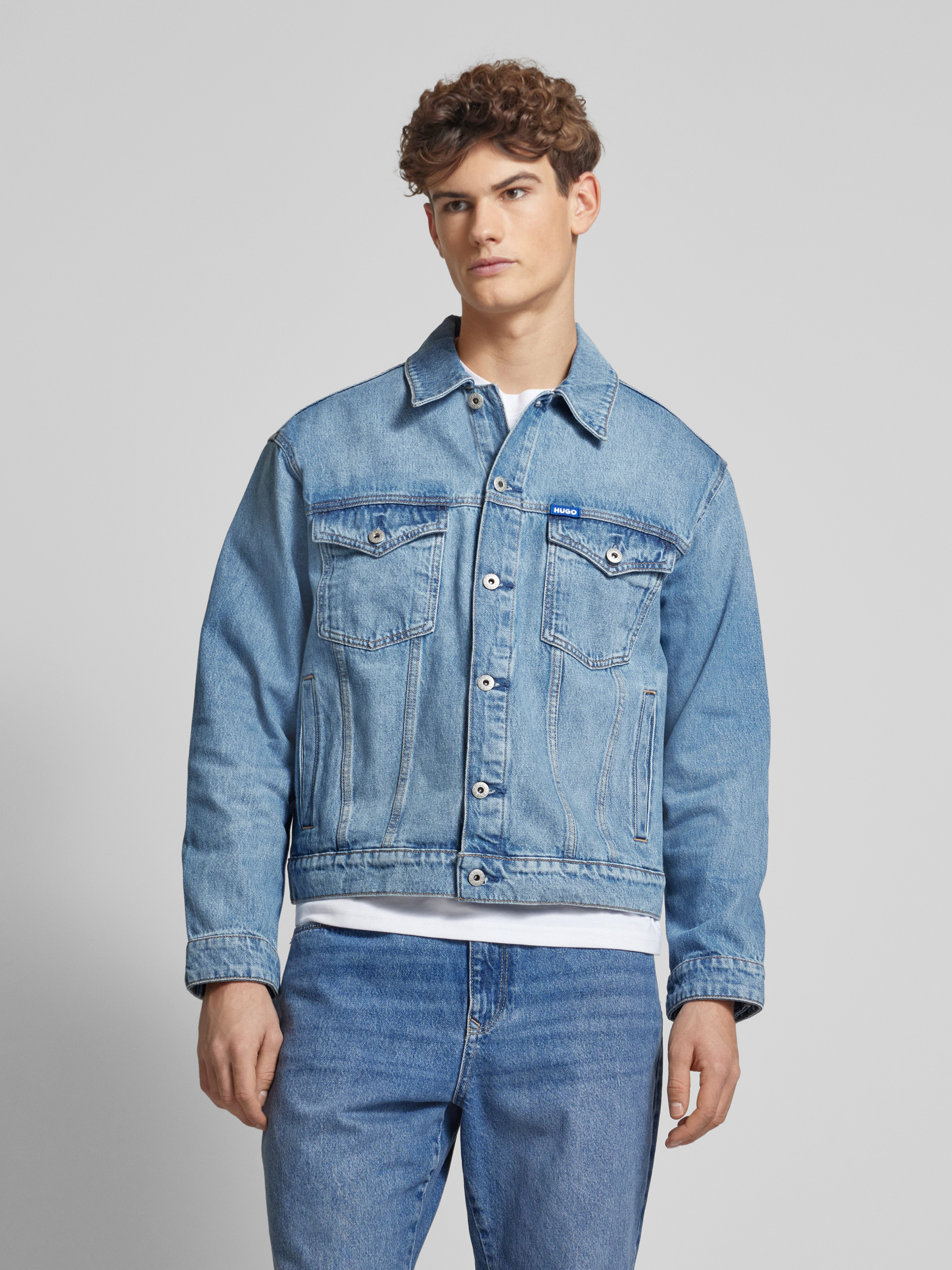 Die Herren Jeansjacke 'Dex' von Hugo Blue, gefertigt aus reiner Baumwolle, zeichnet sich durch ihren lockeren Schnitt und den klassischen Umlegekragen aus. Praktische Brustpattentaschen und seitliche Leistentaschen bieten vielseitige Aufbewahrungsmöglichkeiten. Ein dezentes Label-Badge verleiht der Jacke eine besondere Note.