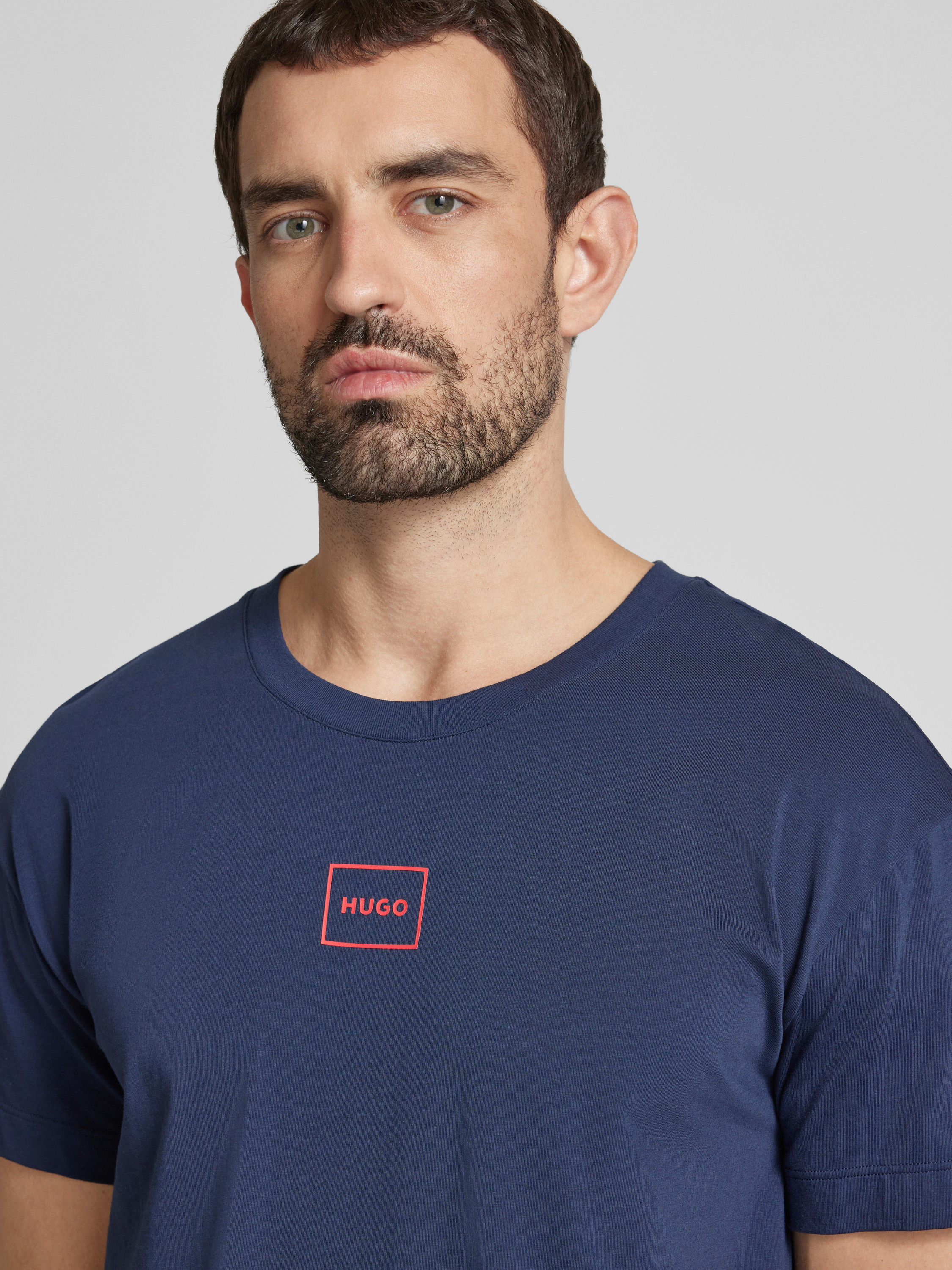Das Herren T-Shirt von HUGO kombiniert einen Baumwoll-Mix mit Stretch-Anteil, was für angenehme Bewegungsfreiheit sorgt. Der gerade Schnitt und der Rundhalsausschnitt verleihen dem Shirt eine klassische Note, während der Label-Print einen modernen Akzent setzt. Ideal für einen lässigen Alltagslook.