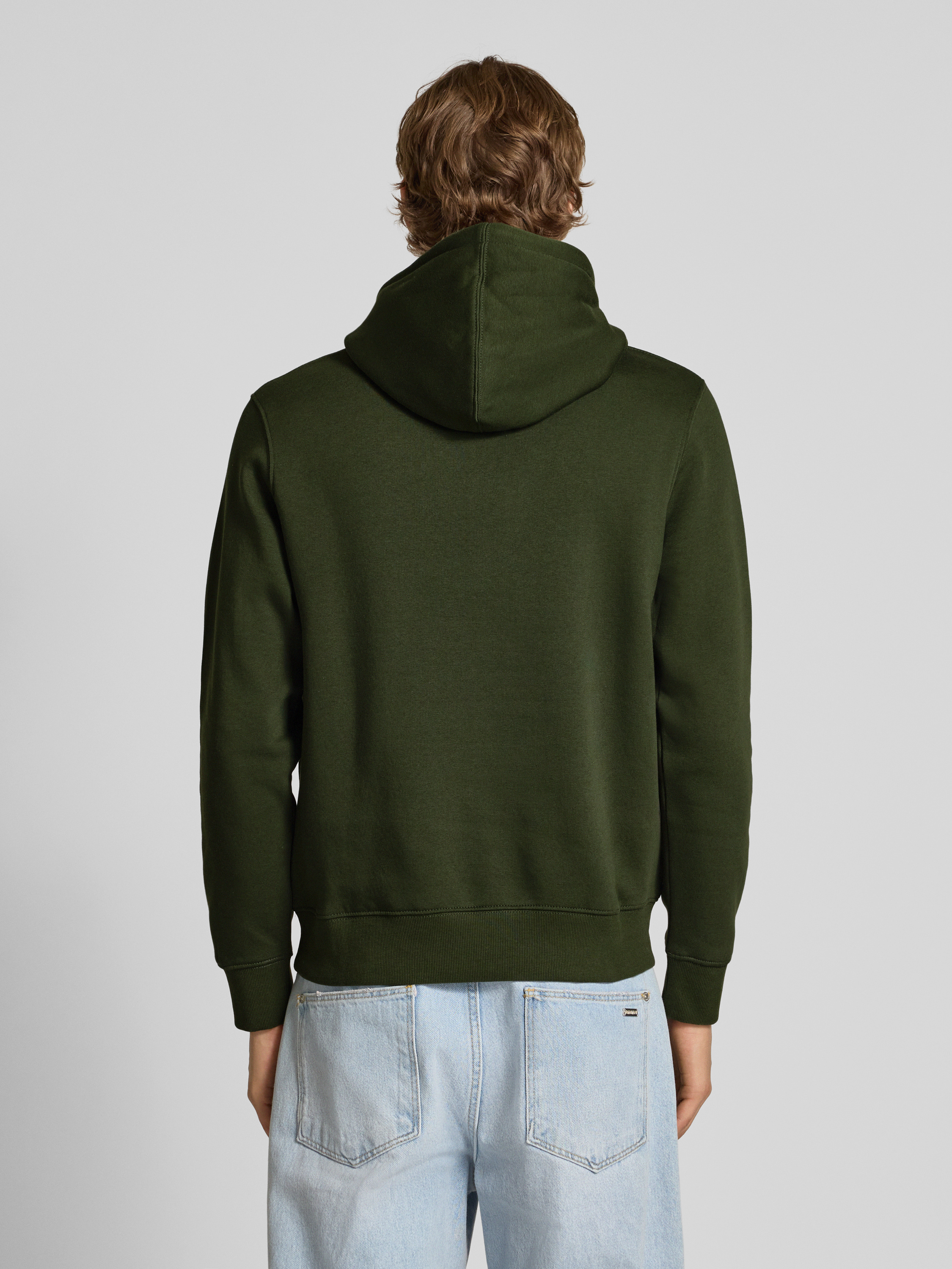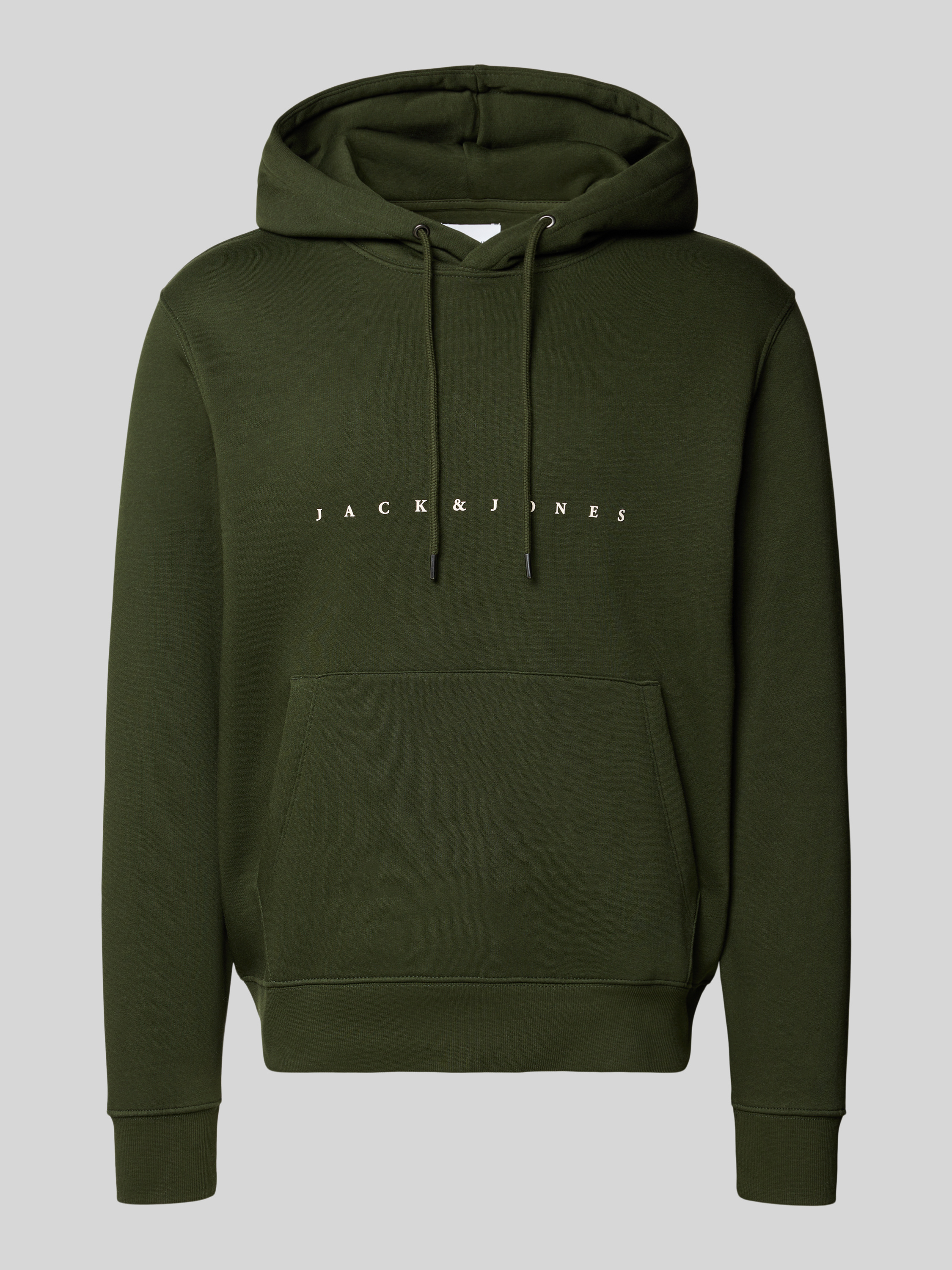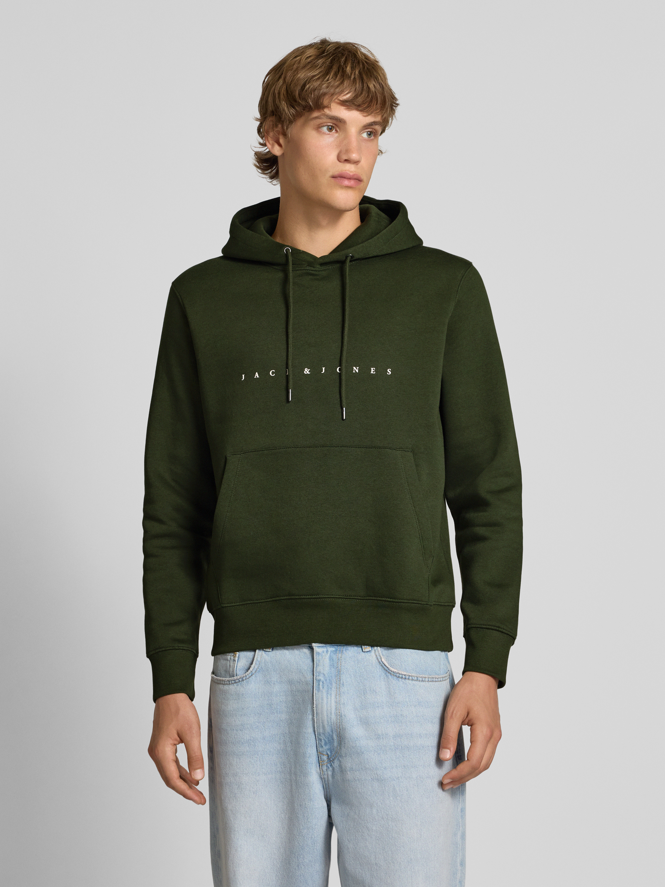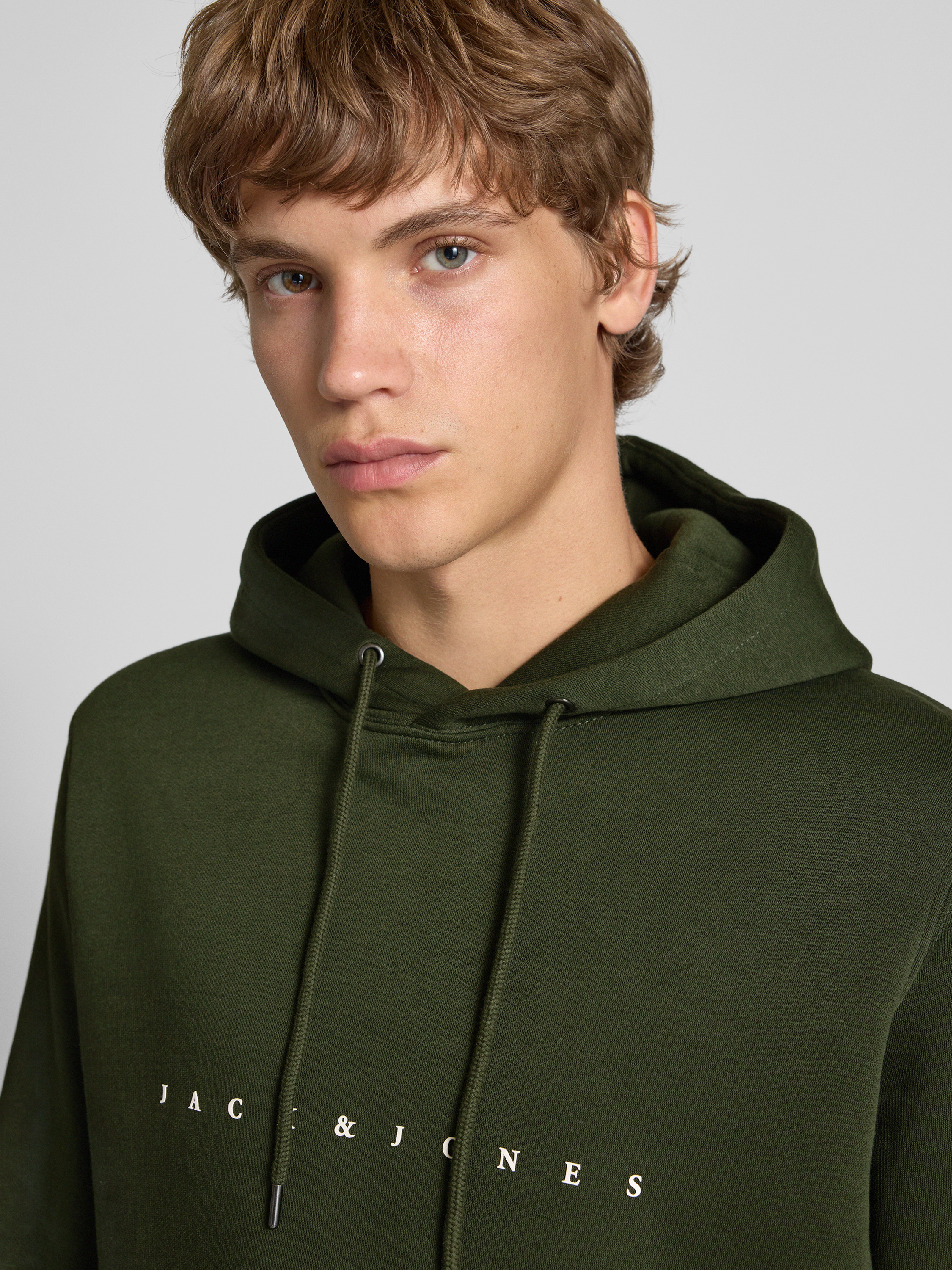 Der Herren Hoodie von Jack & Jones fällt durch seinen lockeren Schnitt angenehm lässig und sorgt mit der Kapuze samt Tunnelzug für zusätzlichen Komfort. Ein Baumwoll-Mix liegt weich auf der Haut, während die Känguru-Tasche praktisch im Alltag unterstützt. Der markante Label-Print rundet das Design ab.