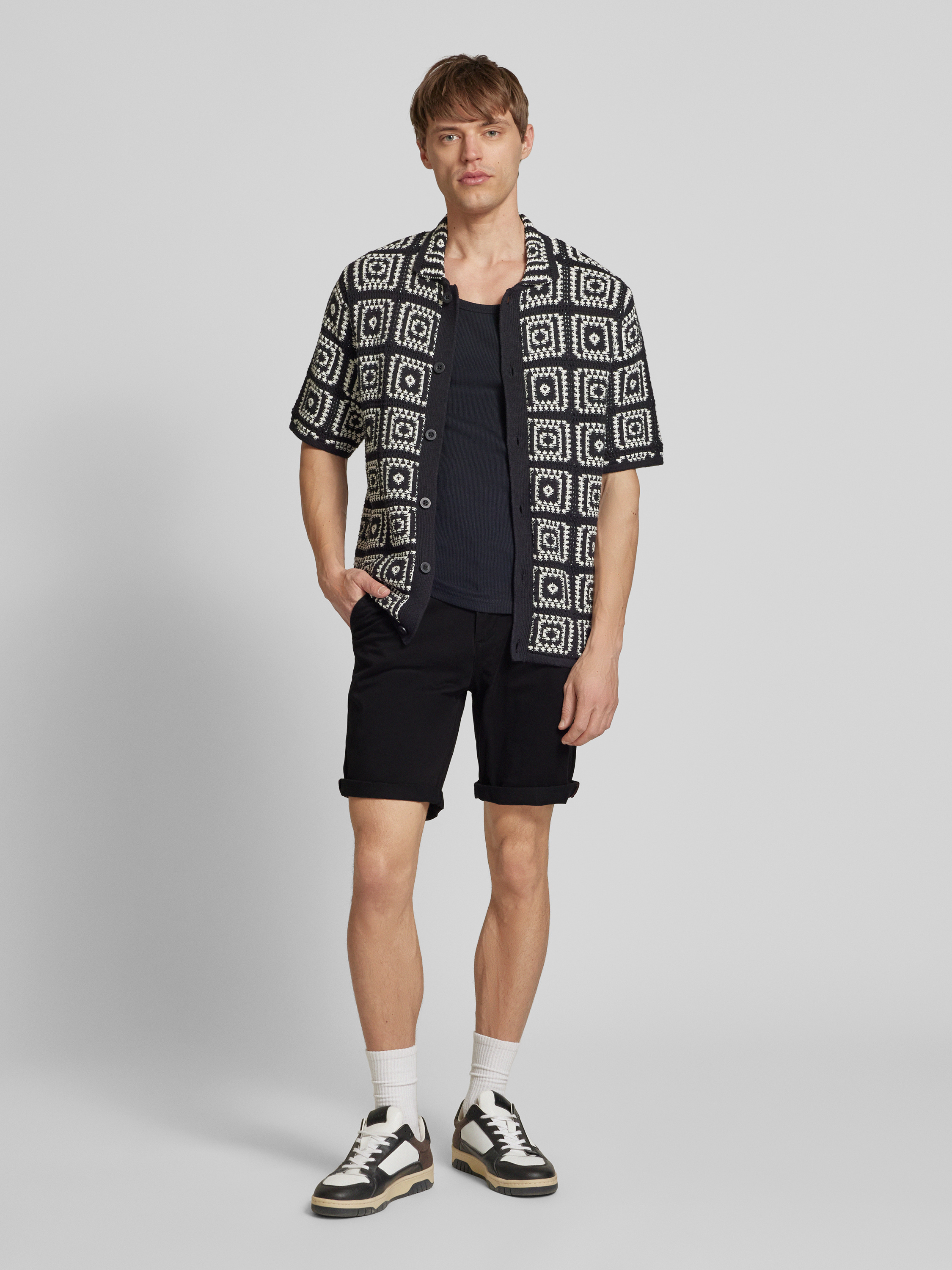 Die Regular Fit Bermudas Modell 'IBOWIE' von JACK & JONES kombinieren die Bequemlichkeit eines Baumwoll-Elasthan-Mixes mit einem zeitgemäßen Schnitt. Durch die Eingrifftaschen entsteht ein praktischer Stauraum, während der Regular Fit für eine angenehme Passform sorgt. Ideal für entspannte Tage in der Sonne.