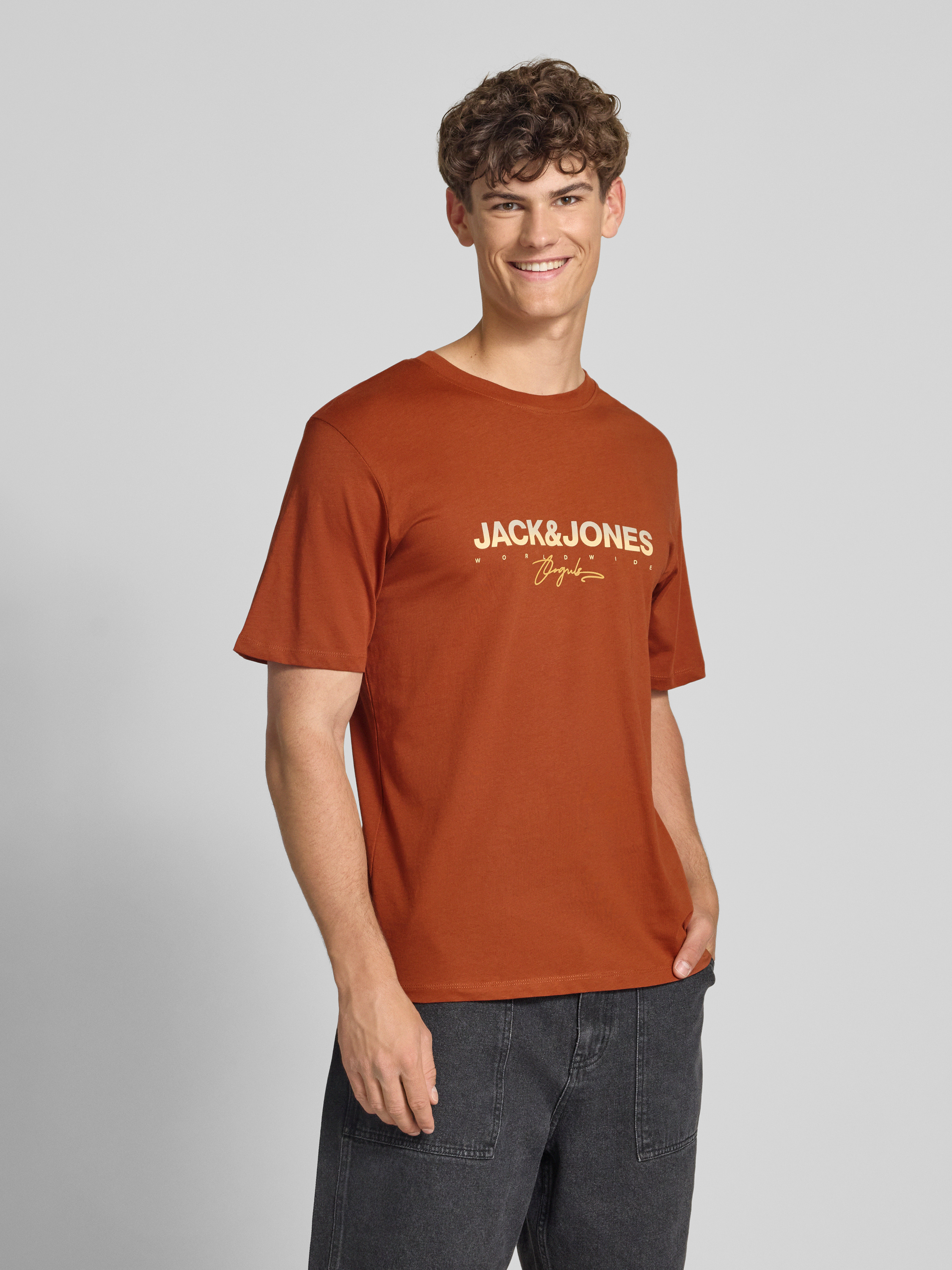 Das Herren T-Shirt von Jack & Jones aus reiner Baumwolle fühlt sich angenehm auf der Haut an und sorgt für hohen Tragekomfort. Mit seinem geraden Schnitt und dem klassischen Rundhalsausschnitt eignet es sich ideal für einen lässigen Look. Der markante Label-Print verleiht jedem Outfit eine moderne Note.