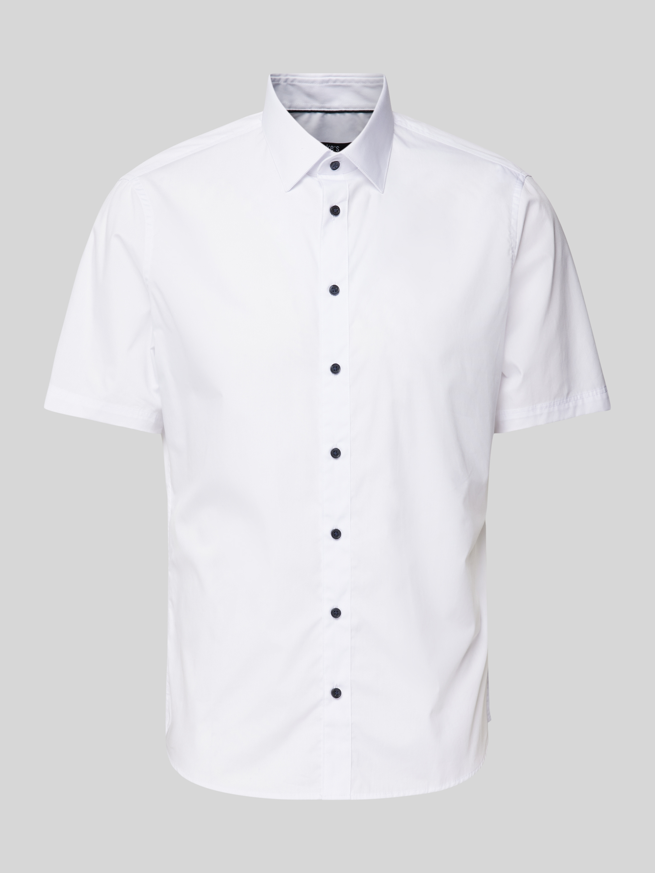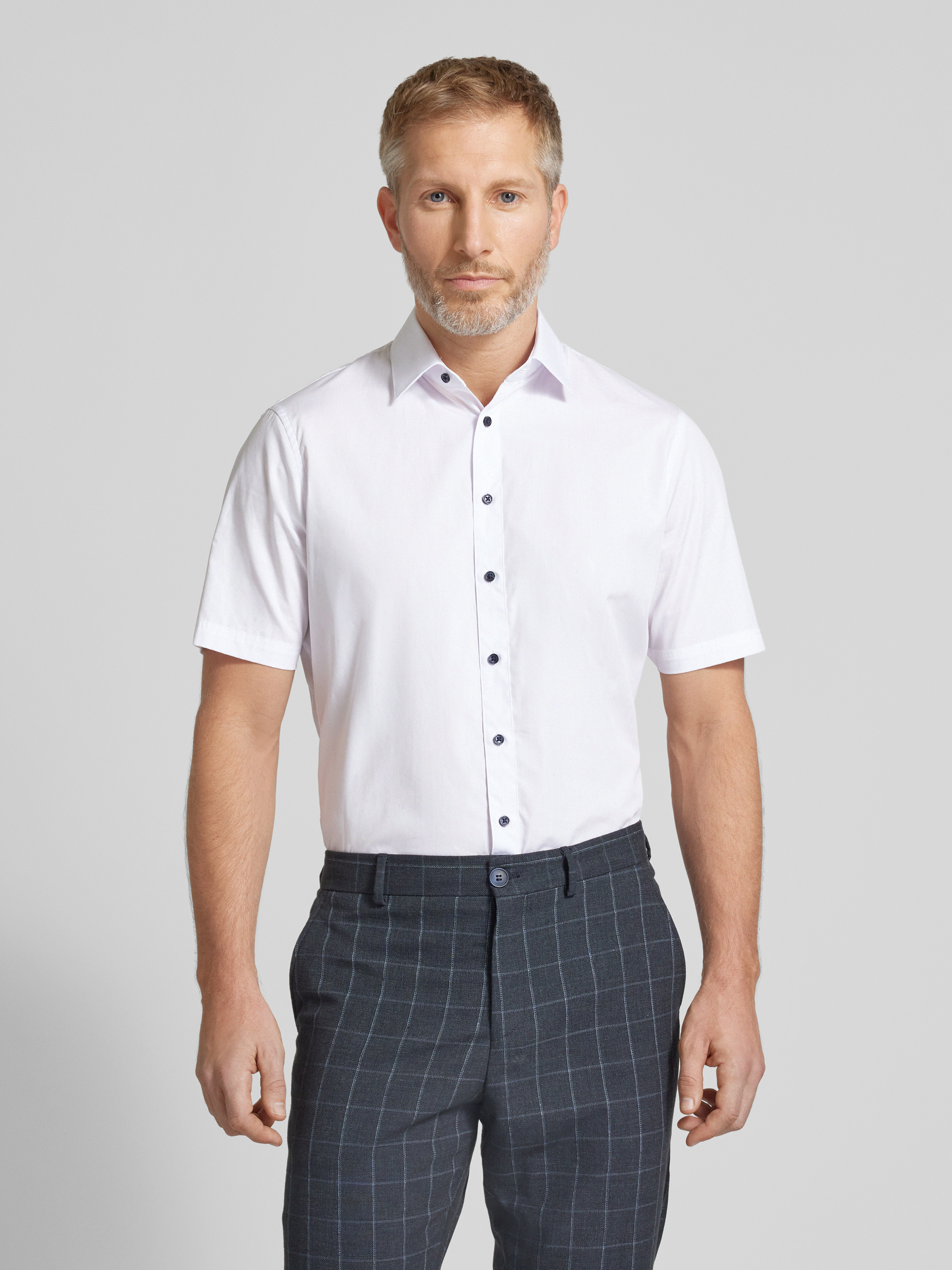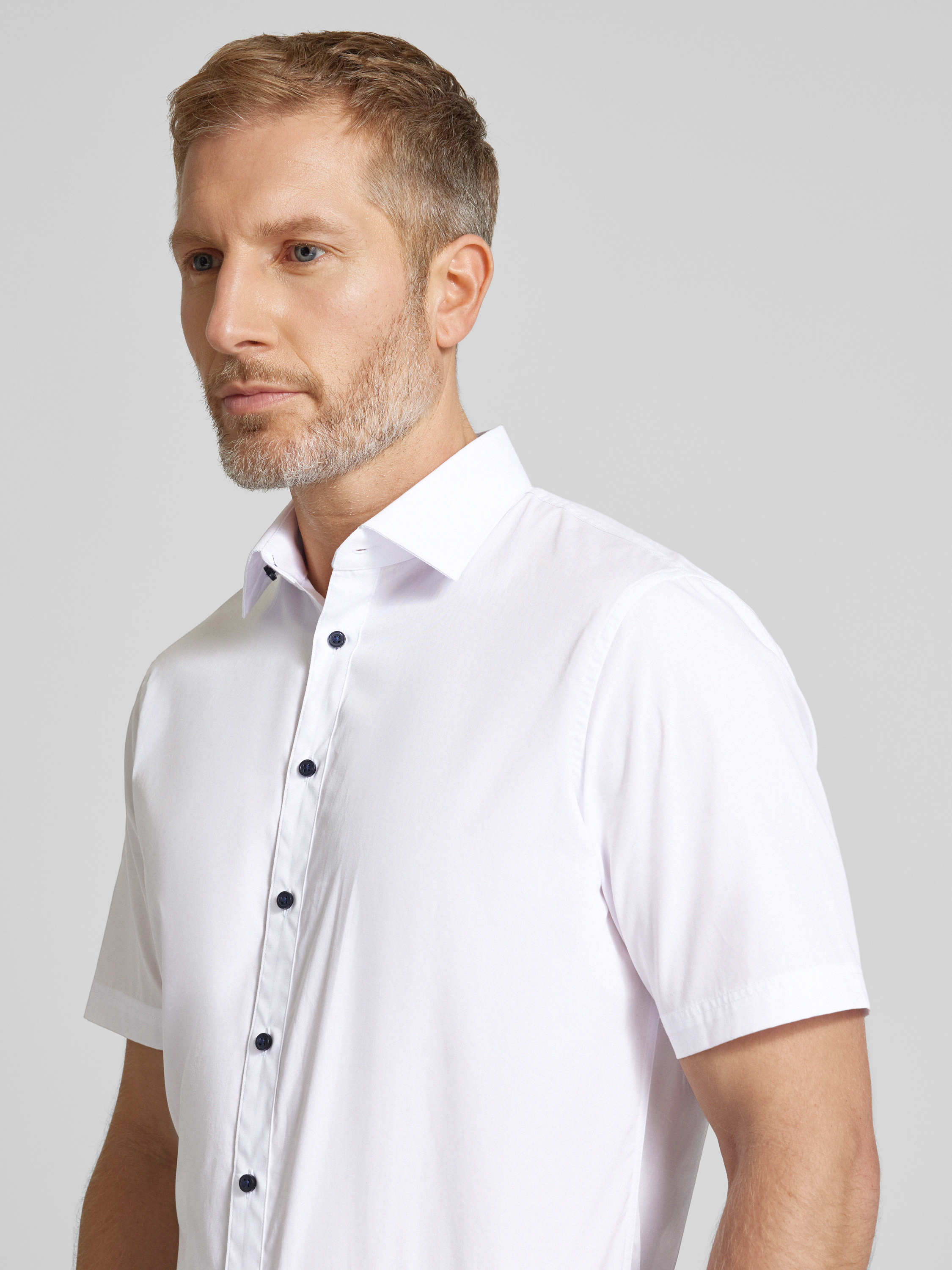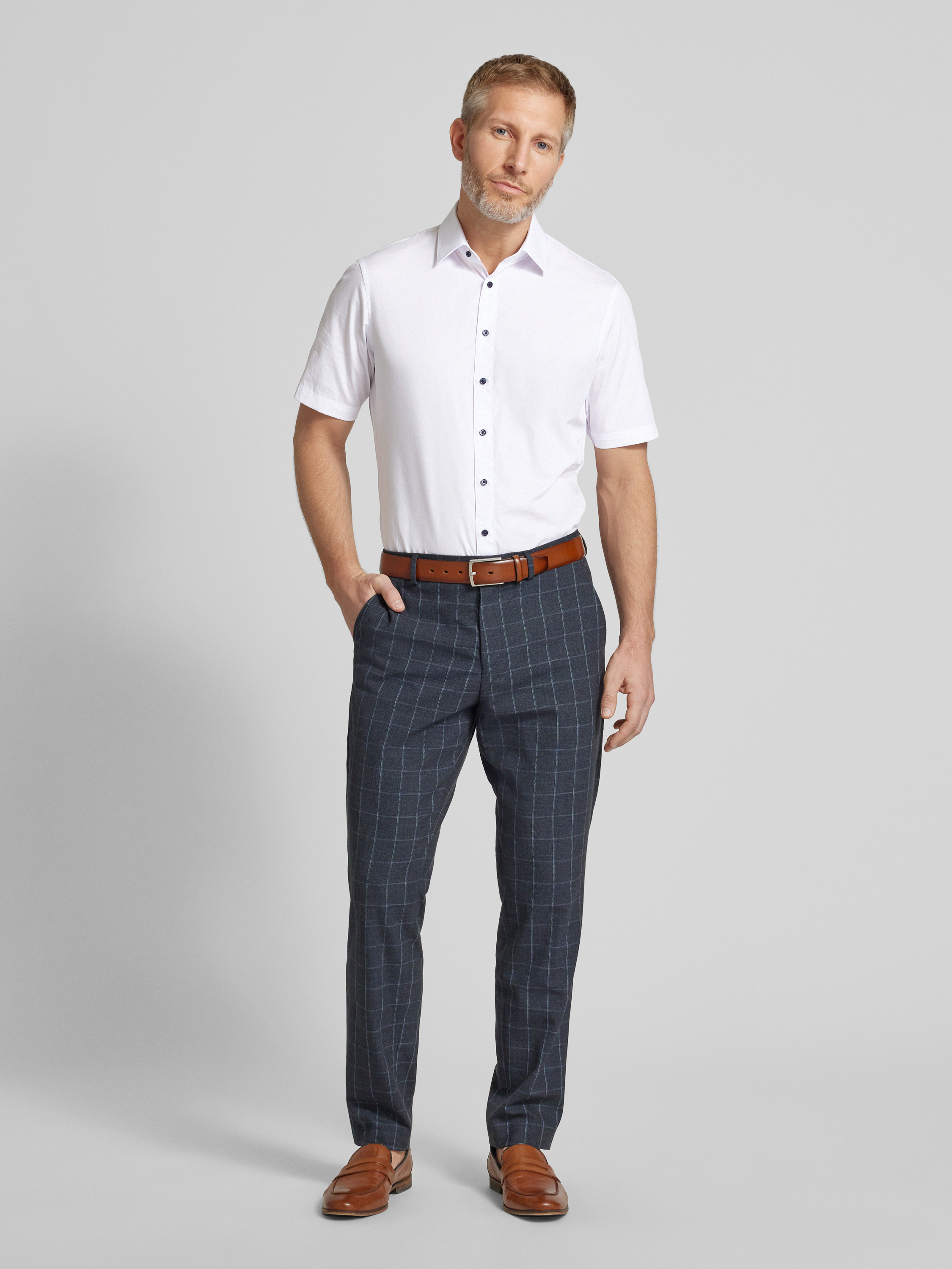 Das Slim Fit Business-Hemd von Jake*s Casual vereint eine schlanke Passform mit einem klassischen Kentkragen und kurzen Ärmeln. Dank der reinen Baumwolle fühlt es sich angenehm leicht auf der Haut an. Unifarbene Optik und Seitenschlitze sorgen für einen stilvollen, modernen Look.