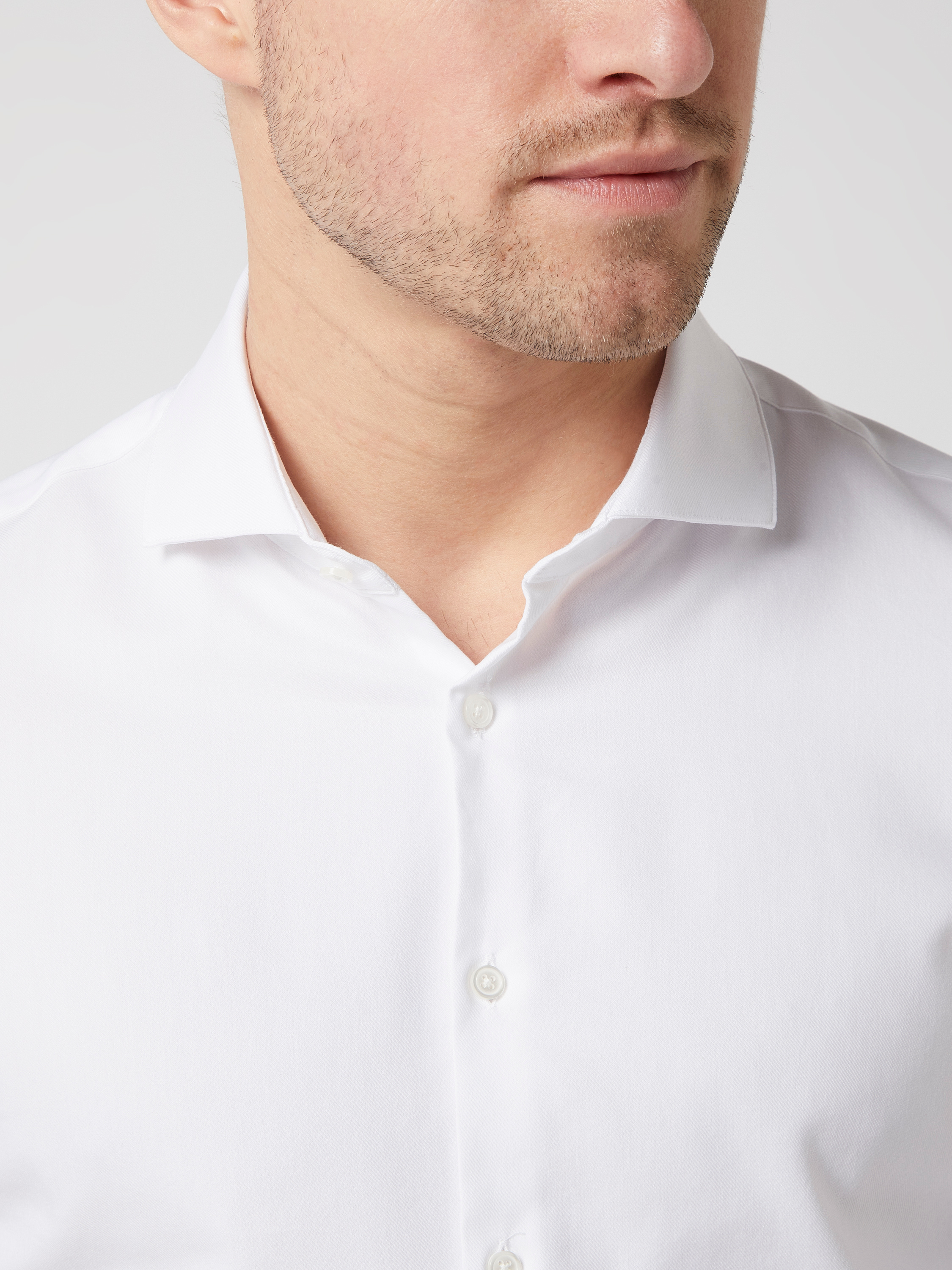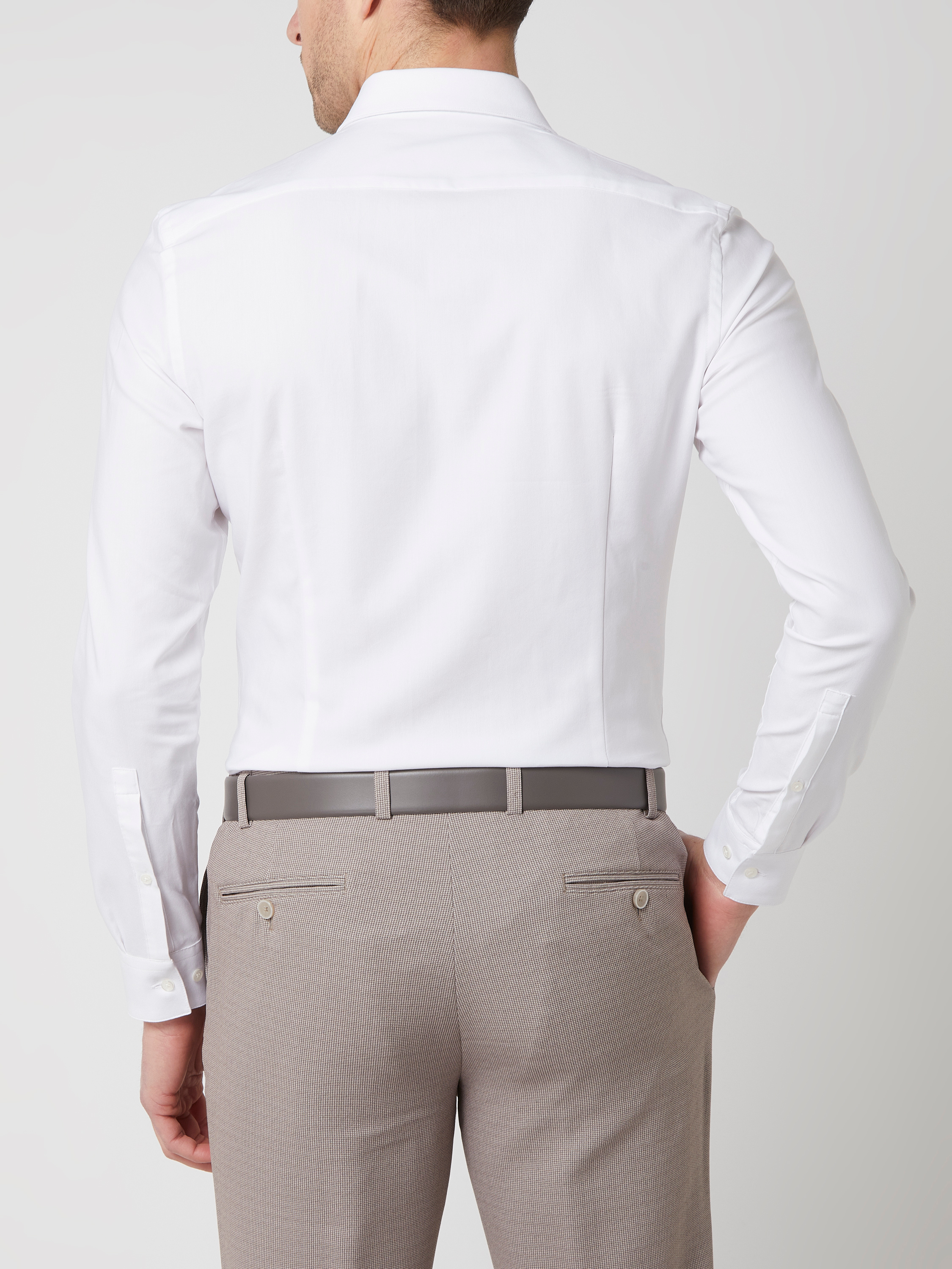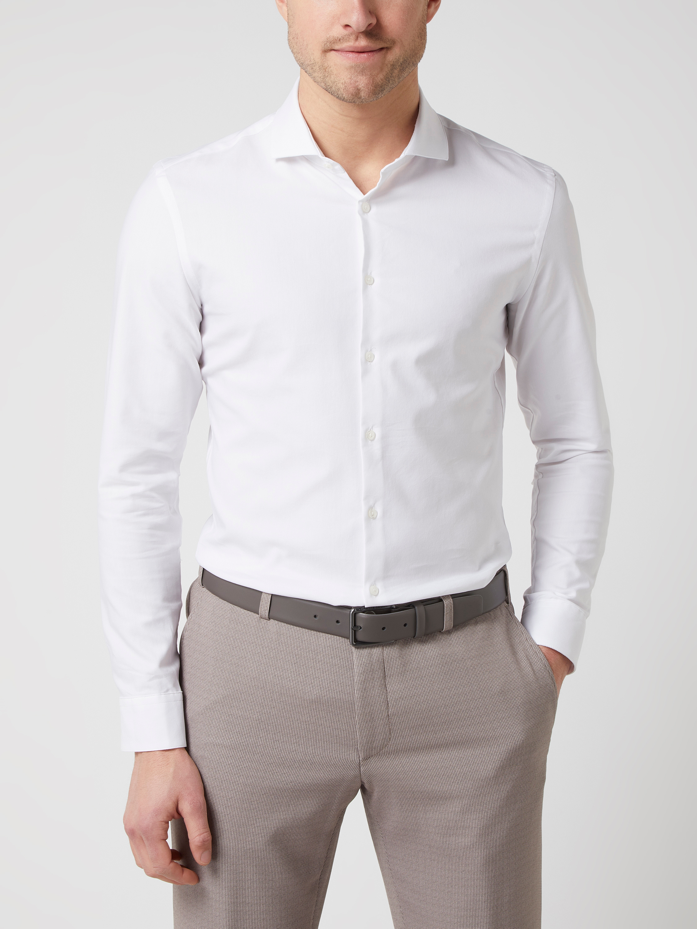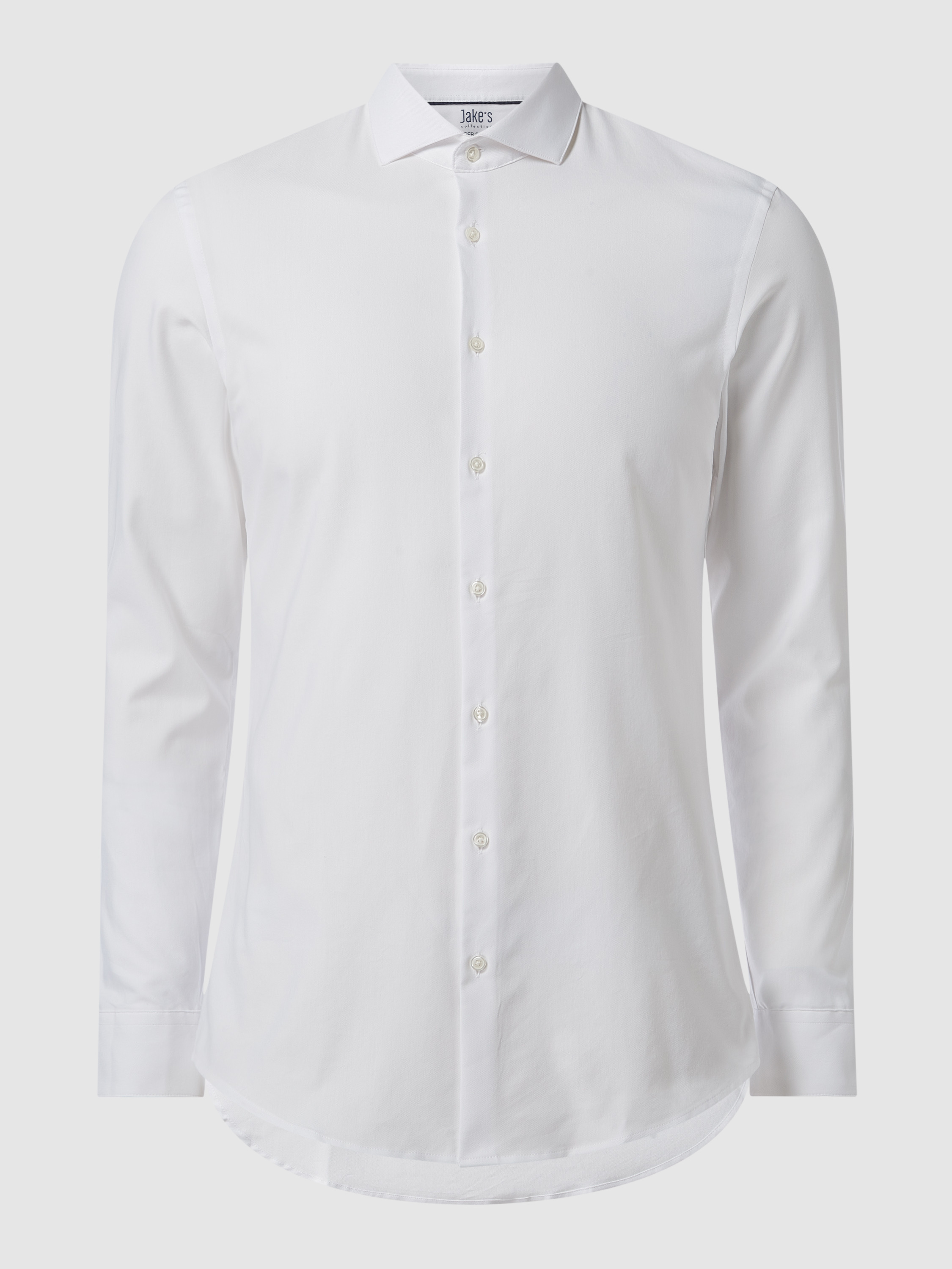 Das Businesshemd von Jake*s überzeugt durch seinen Slim Fit-Schnitt und den eleganten Haifischkragen, was eine moderne, schlanke Silhouette schafft. Der atmungsaktive Baumwoll-Elasthan-Mix sorgt für angenehmen Tragekomfort und erleichtert die Pflege durch schnelles Trocknen. Die feine Webstruktur verleiht dem Hemd eine dezente, stilvolle Note.