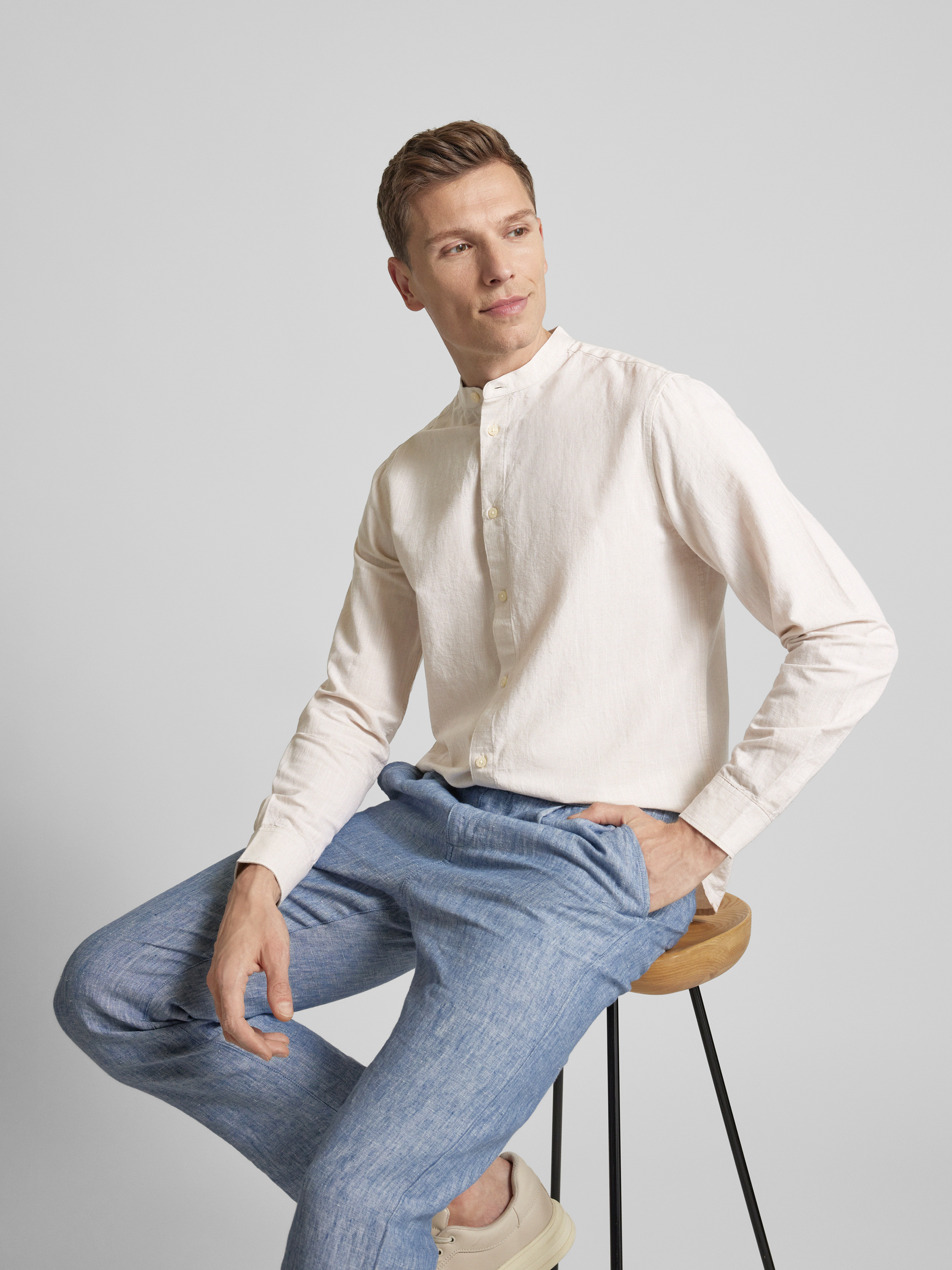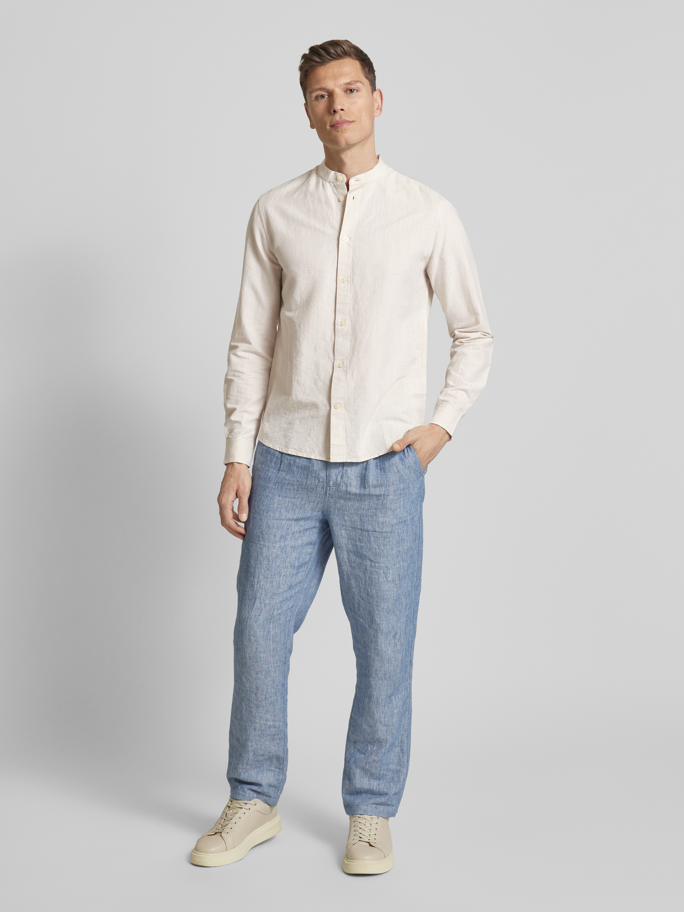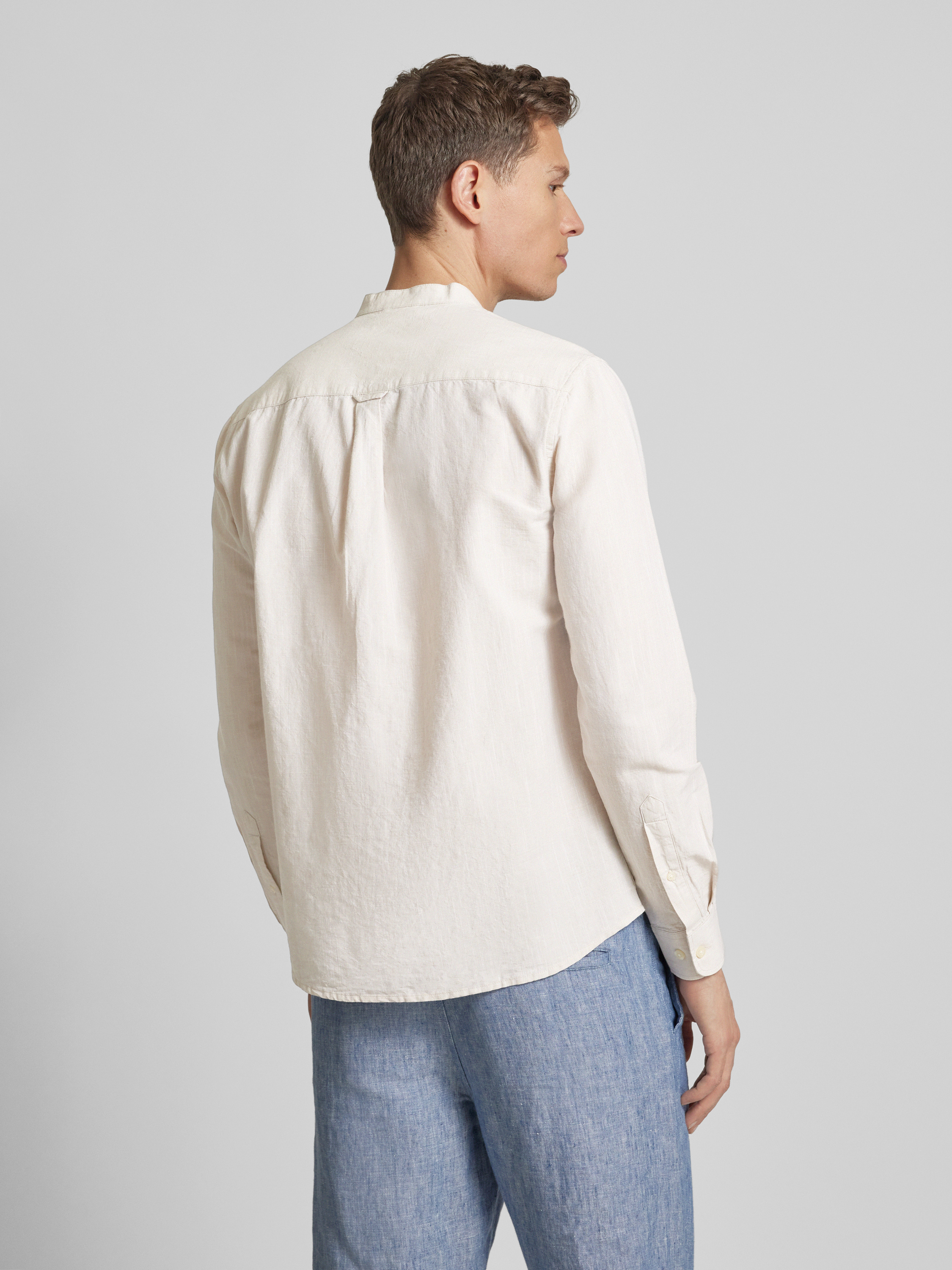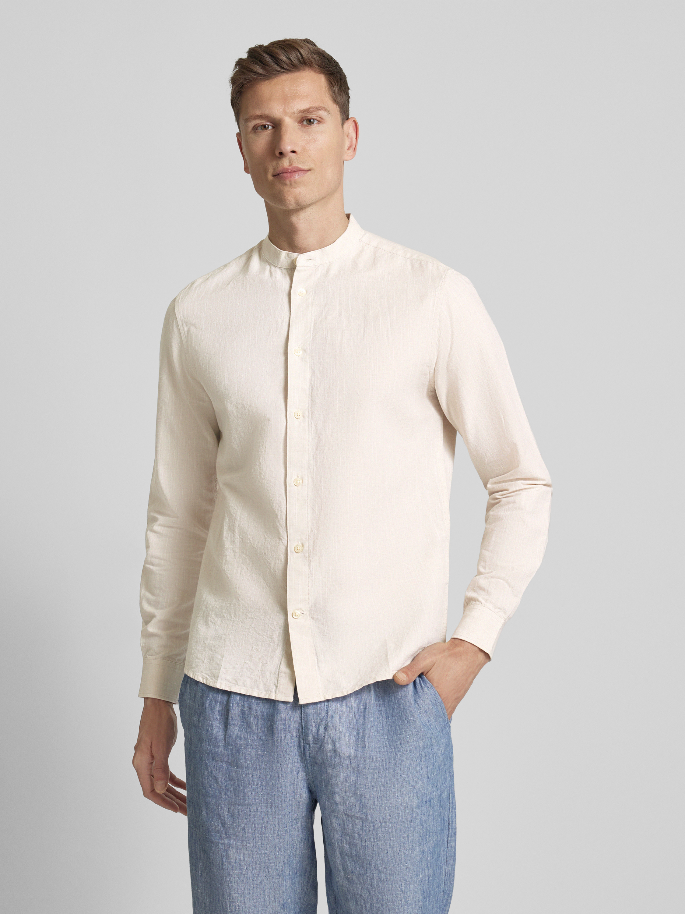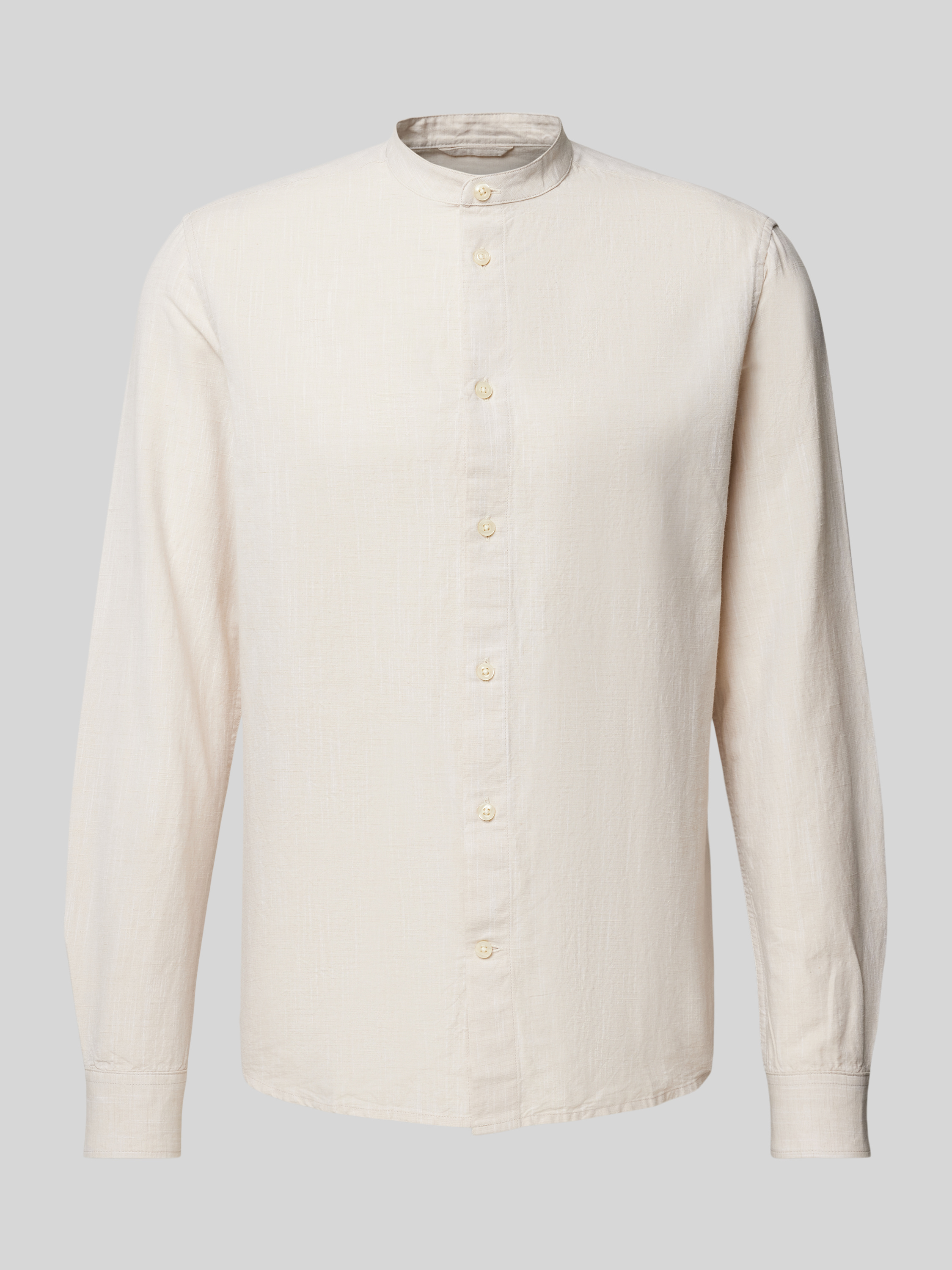 Das Freizeithemd von Knowledge Cotton Apparel kombiniert einen Baumwoll-Leinen-Mix mit einem Regular Fit für angenehmen Tragekomfort. Ein Maokragen verleiht dem langärmeligen Design einen modernen Touch. Das Material sorgt für Atmungsaktivität und macht es vielseitig einsetzbar.