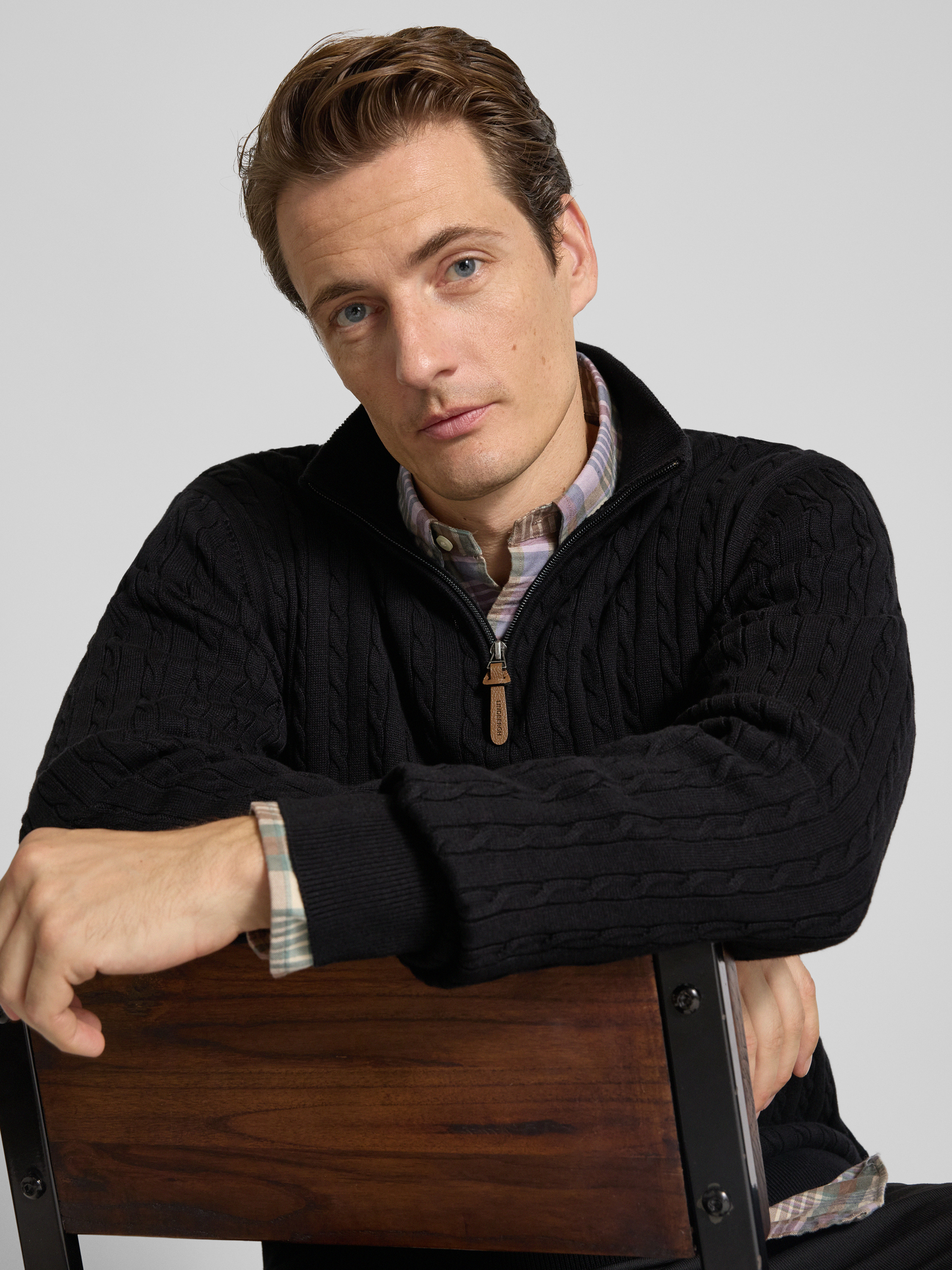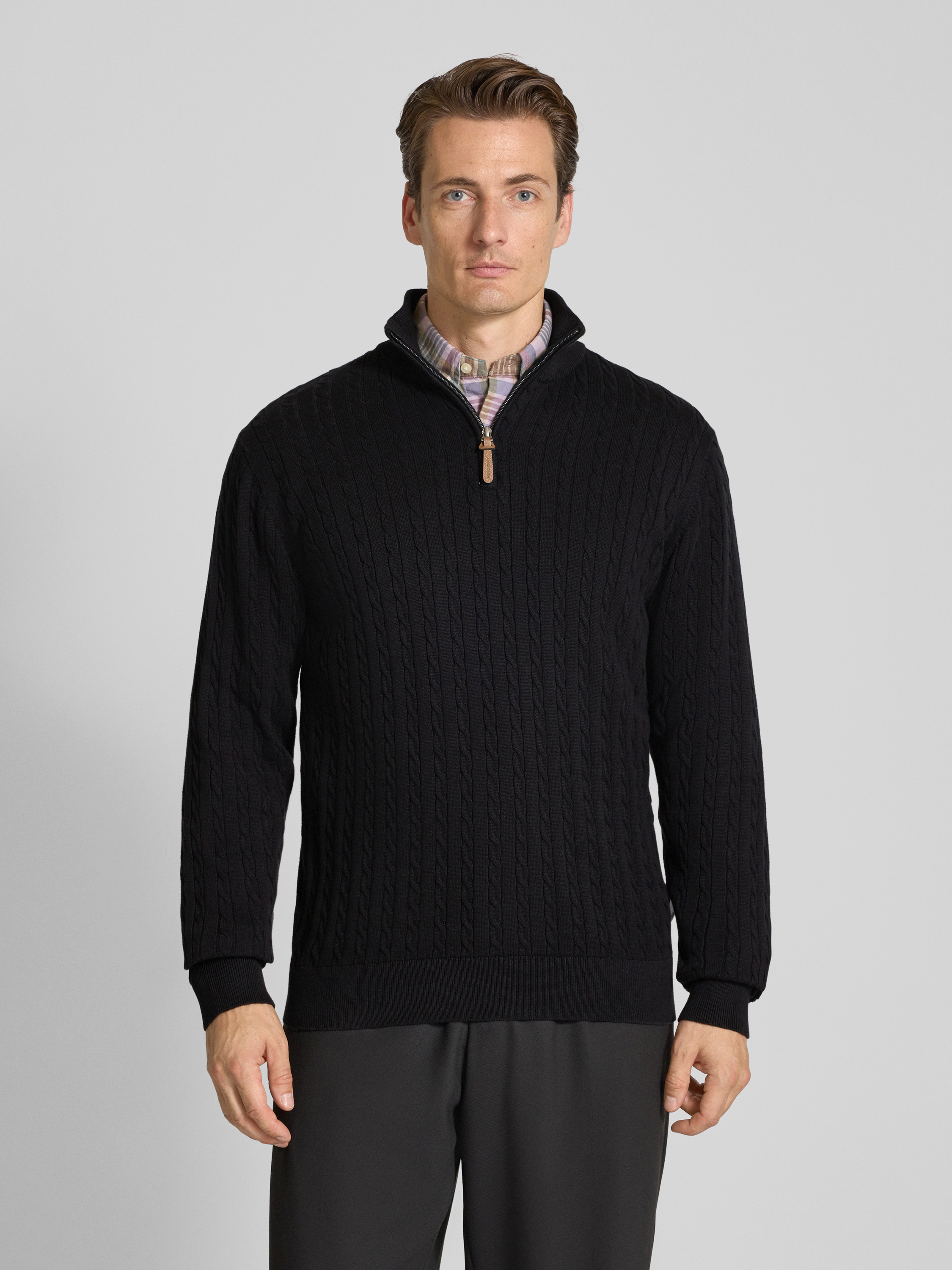 Der Herren Troyer von Lindbergh aus reiner Baumwolle zeigt sich in geradem Schnitt und mit markantem Zopfmuster. Durch den klassischen Troyer-Kragen und das dezente Label-Detail entsteht eine vielseitige Optik, die sich unkompliziert kombinieren lässt. So eignet sich das Modell für entspannte wie gepflegte Anlässe.