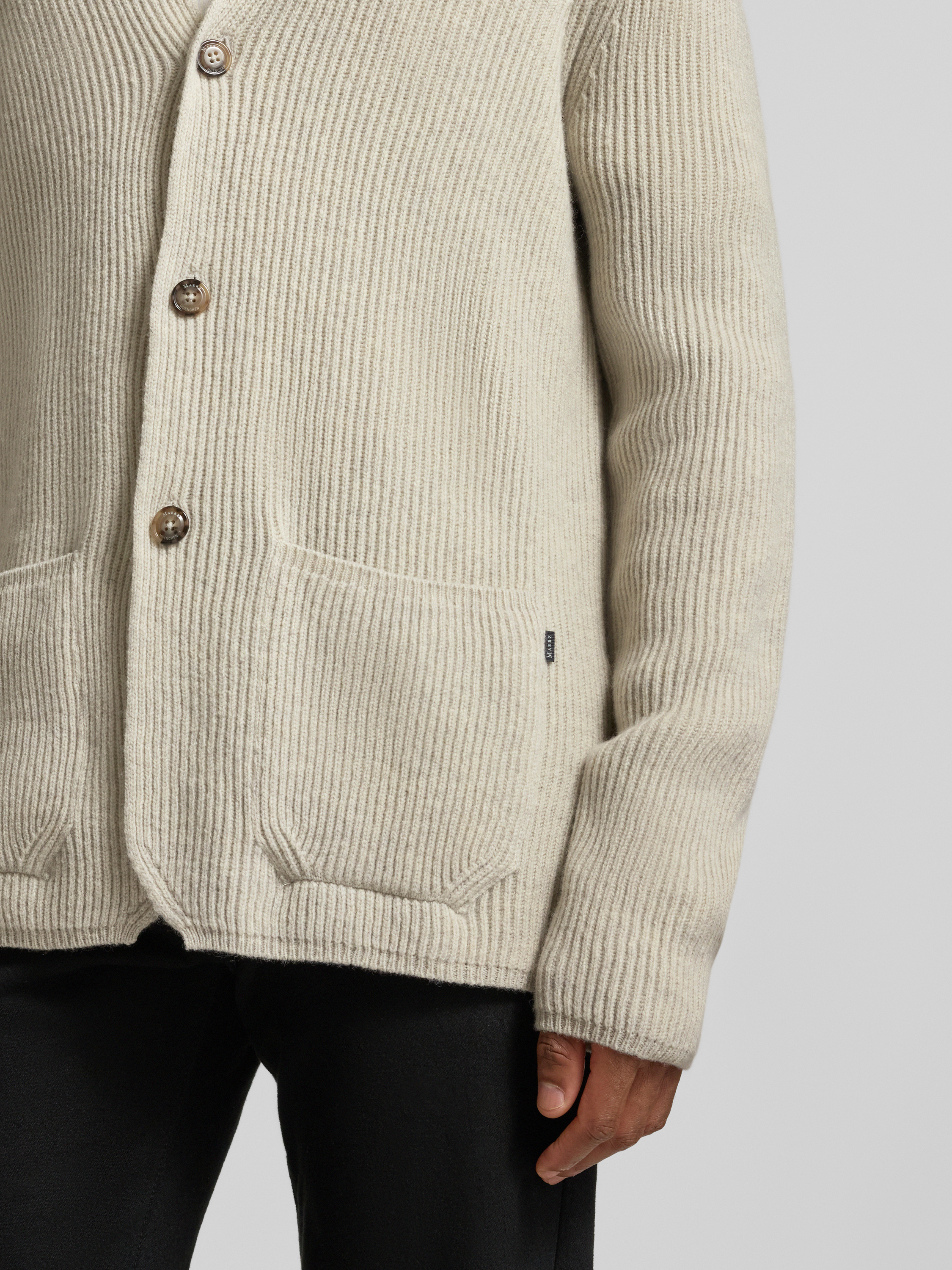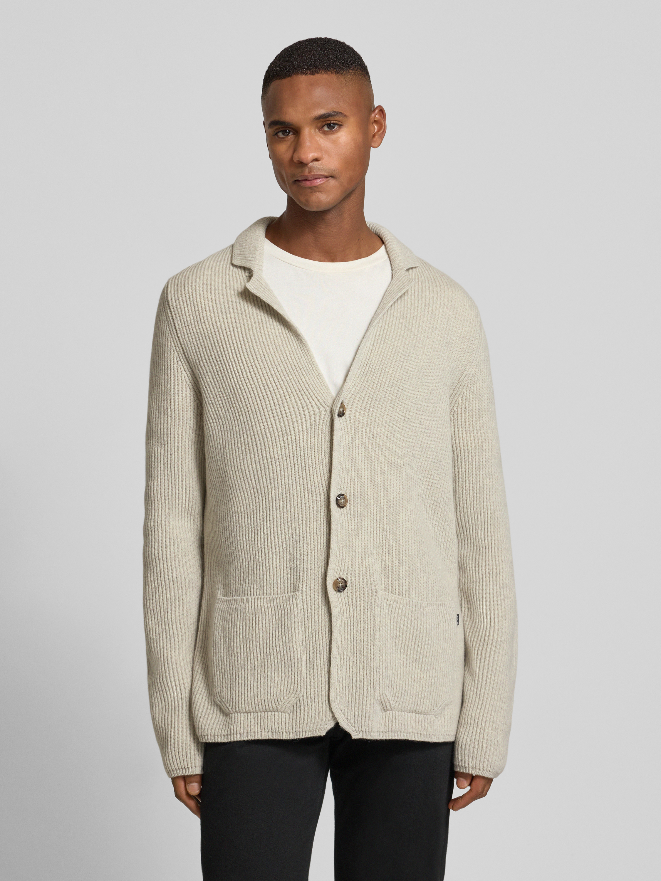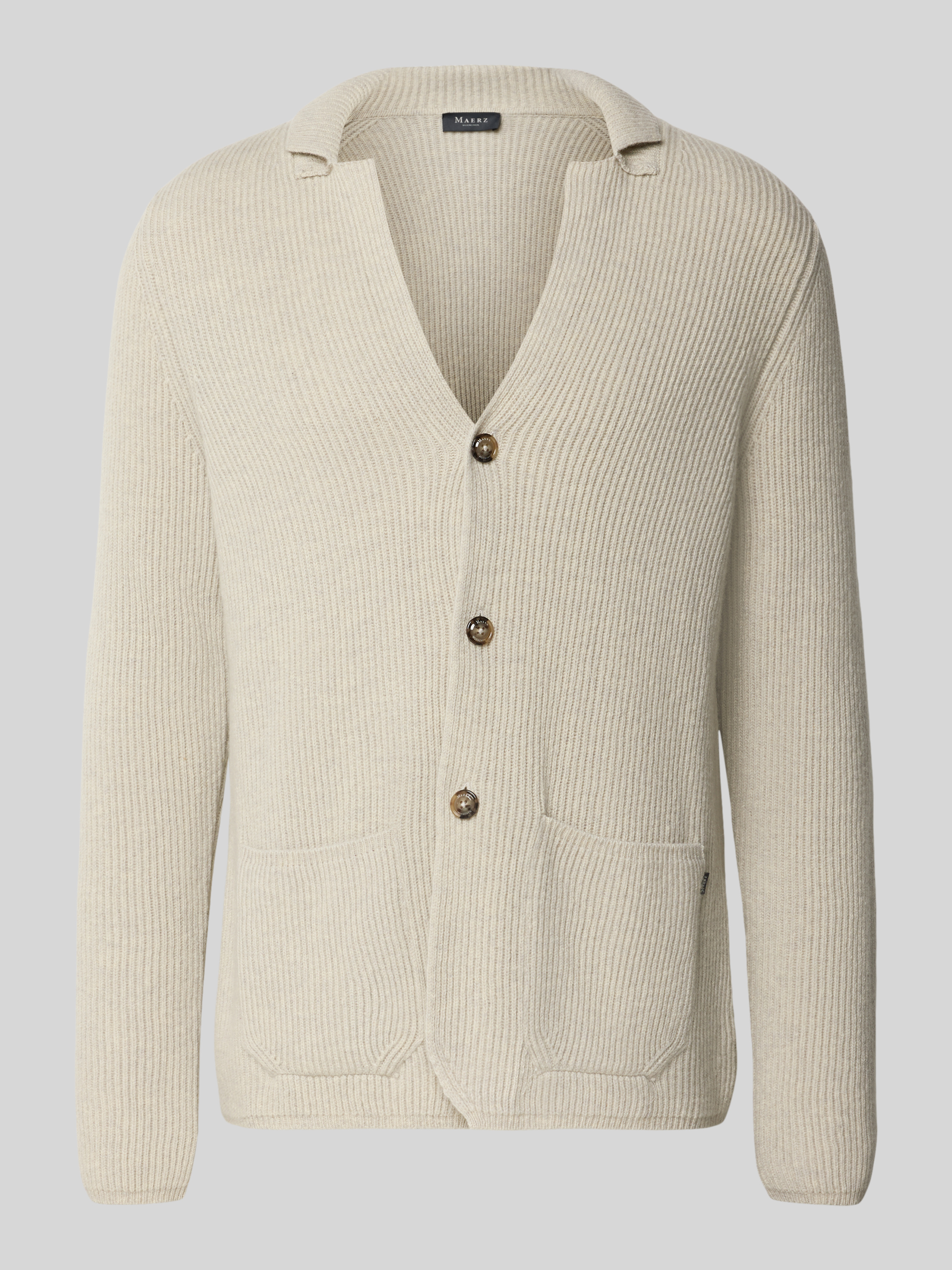 Die Herren Strickjacke von Maerz mit lockerer Passform und Resort-Kragen schafft eine entspannte Silhouette, die Bewegungsfreiheit im Alltag ermöglicht. Dank reiner Schurwolle fühlt sich das Material angenehm an und wärmt auf natürliche Weise. Eingrifftaschen und eine klassische Knopfleiste unterstreichen den funktionalen Charakter.