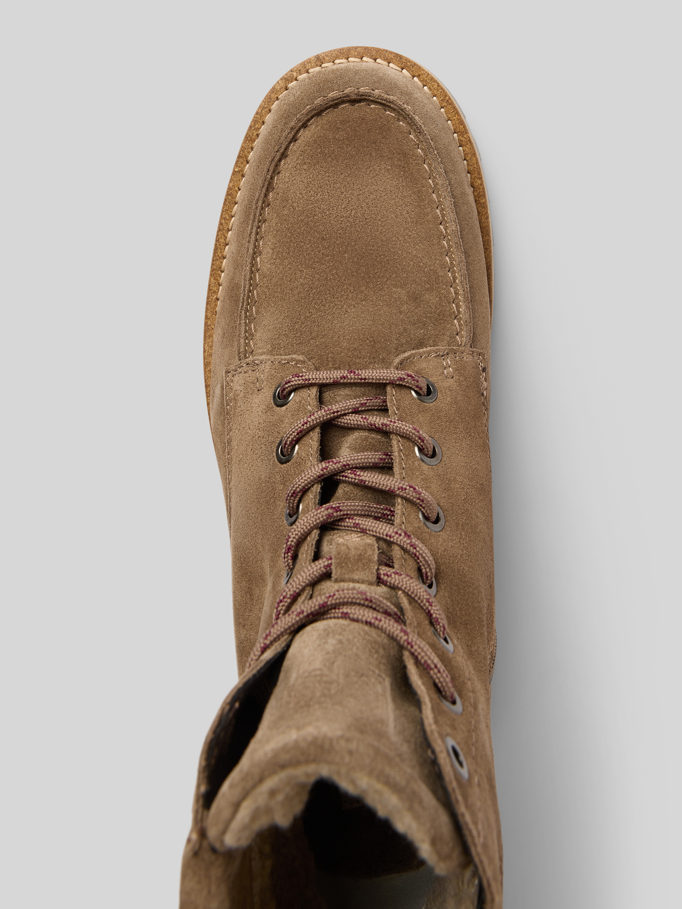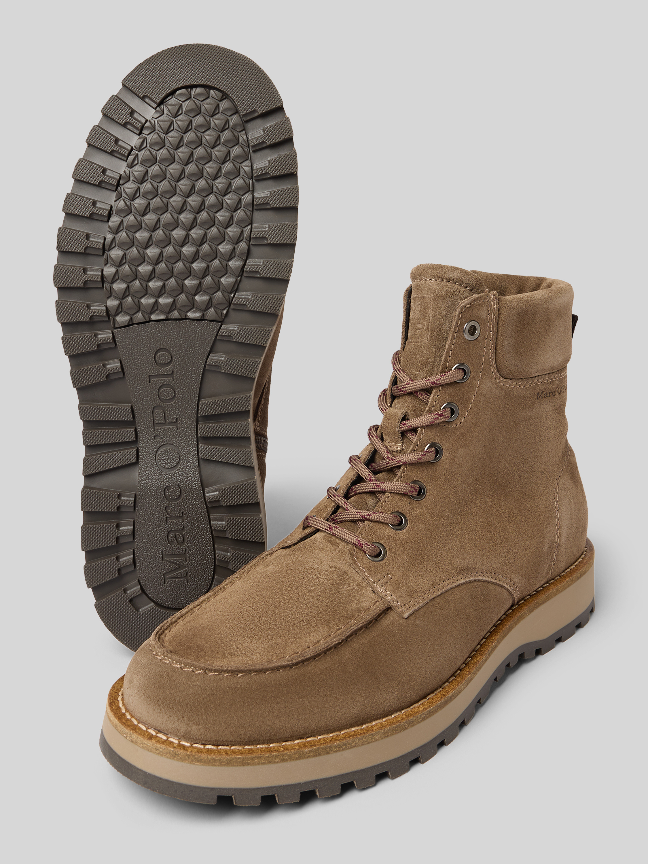 Der Herren Schnürstiefel von Marc O'Polo präsentiert sich in unifarbener Optik und abgerundeter Schuhspitze, wodurch er vielseitig kombinierbar bleibt. Gefertigt aus echtem Veloursleder, fühlt sich das Material angenehm weich an und sorgt für einen hochwertigen Gesamteindruck. Mit flacher Absatzform und dezenter Label-Prägung erhält man einen Schuh, der Alltagstauglichkeit und Komfort verbindet.