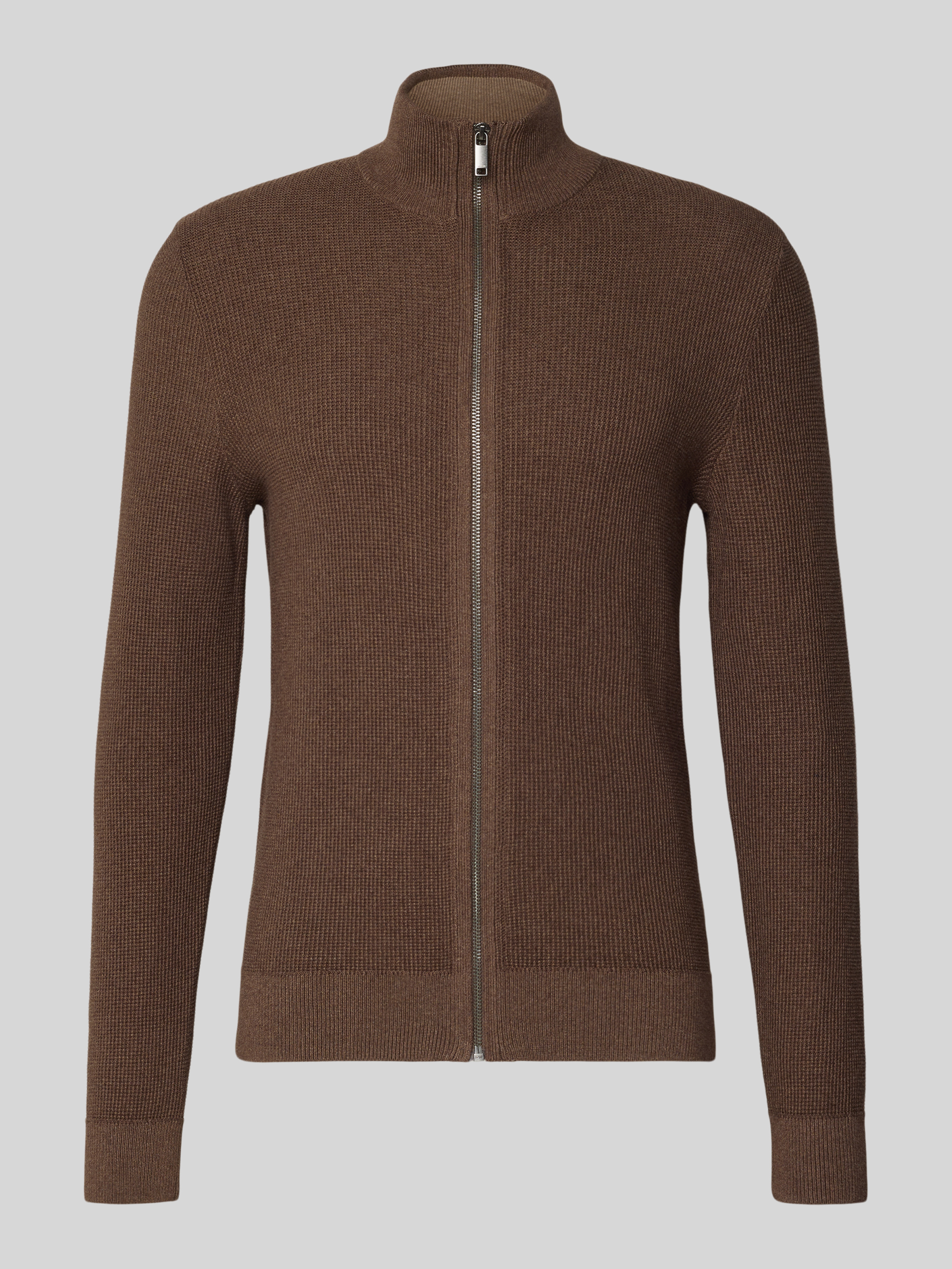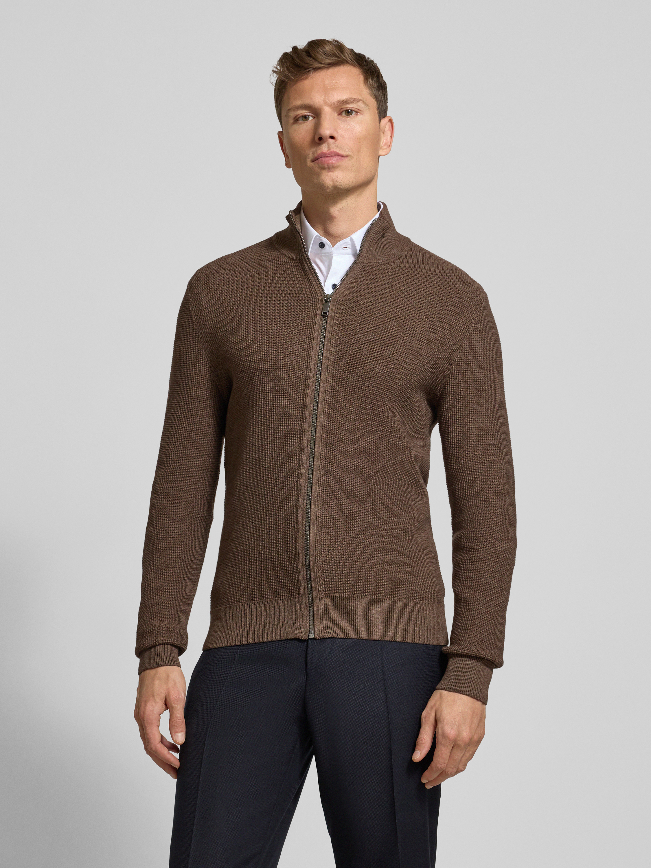 Die Herren Strickjacke von MCNEAL aus reiner Baumwolle liegt angenehm auf der Haut und schmiegt sich durch den Slim Fit an die Silhouette an. Ein Stehkragen sorgt für eine klare Linienführung, während gerippte Abschlüsse dezent Struktur verleihen. So eignet sich das Modell, um unkompliziert verschiedene Outfits zu ergänzen.