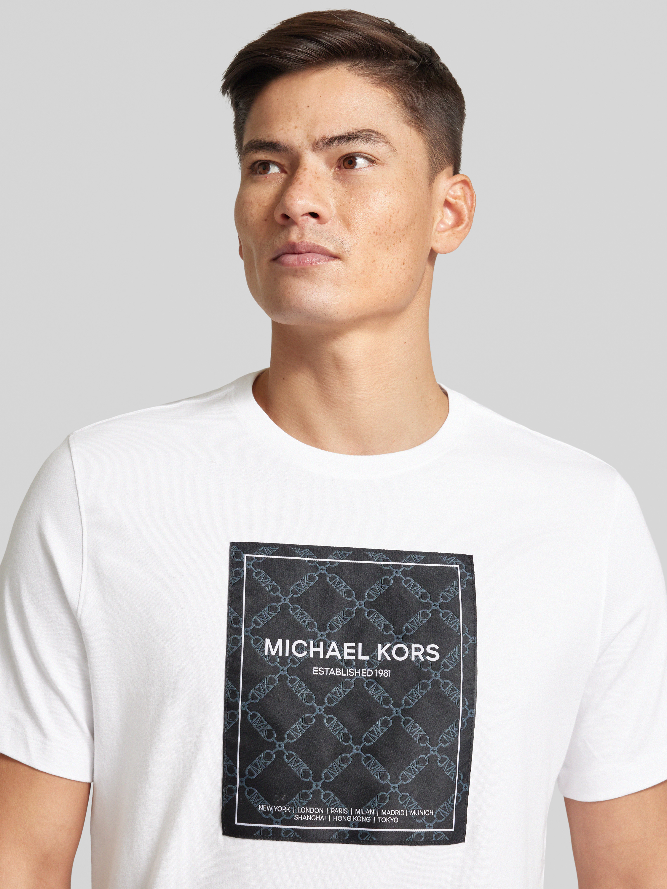 Das Herren T-Shirt von Michael Kors, Modell 'EMPIRE FLAGSHIP', aus reiner Baumwolle, bietet mit seinem geraden Schnitt und dem klassischen Rundhalsausschnitt hohen Tragekomfort. Der dezente Label-Print verleiht dem Shirt eine stilvolle Note. Perfekt für einen entspannten, aber dennoch modischen Auftritt.