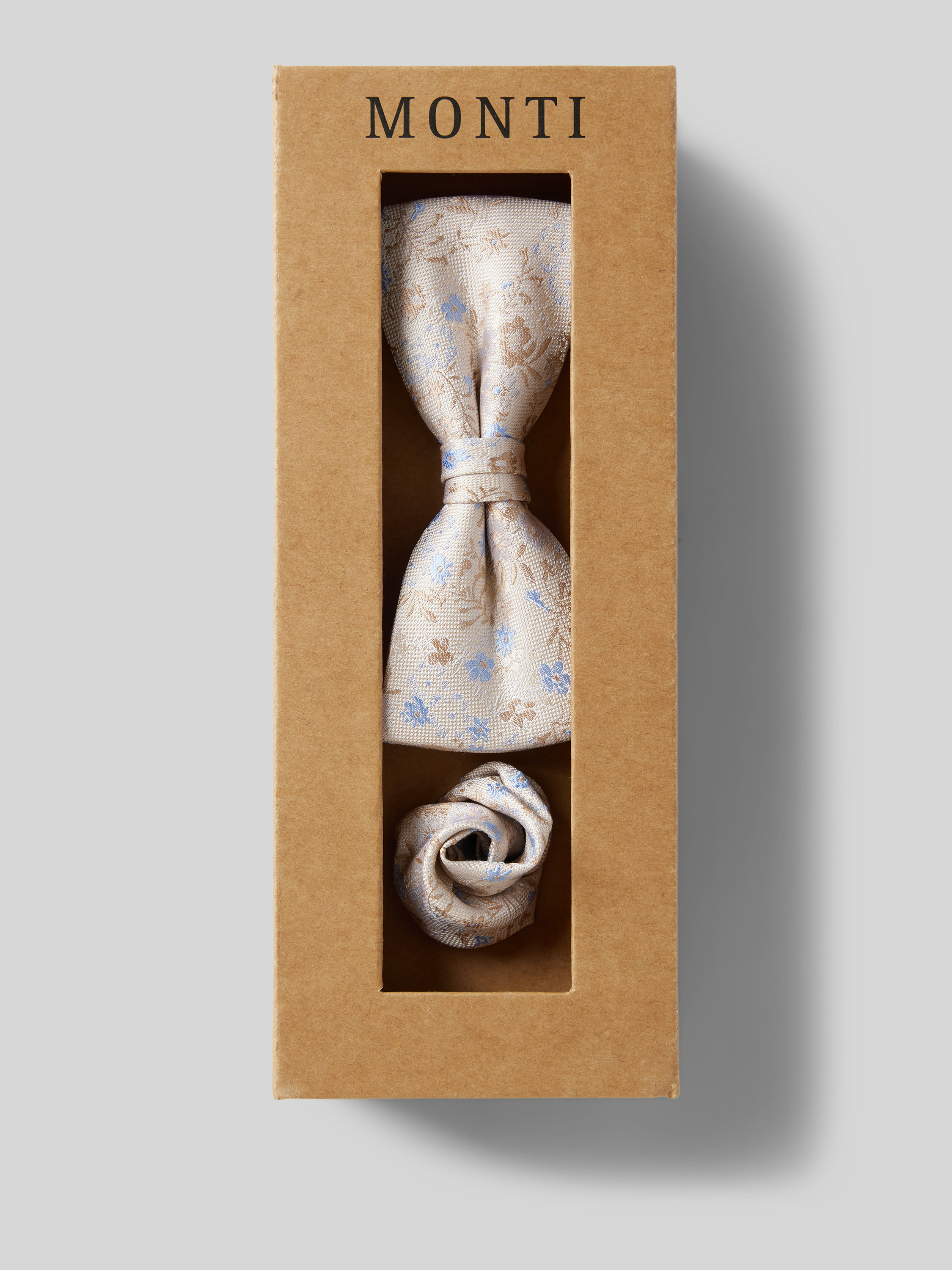 Der Herr trägt mit der Seidenfliege von MONTI eine fein strukturierte Variante, die durch ihr vorgebundenes Design unkompliziert anliegt. Reine Seide sorgt für einen angenehmen Griff, während das passende Einstecktuch samt dezenter Stickerei das Outfit geschmackvoll ergänzt.