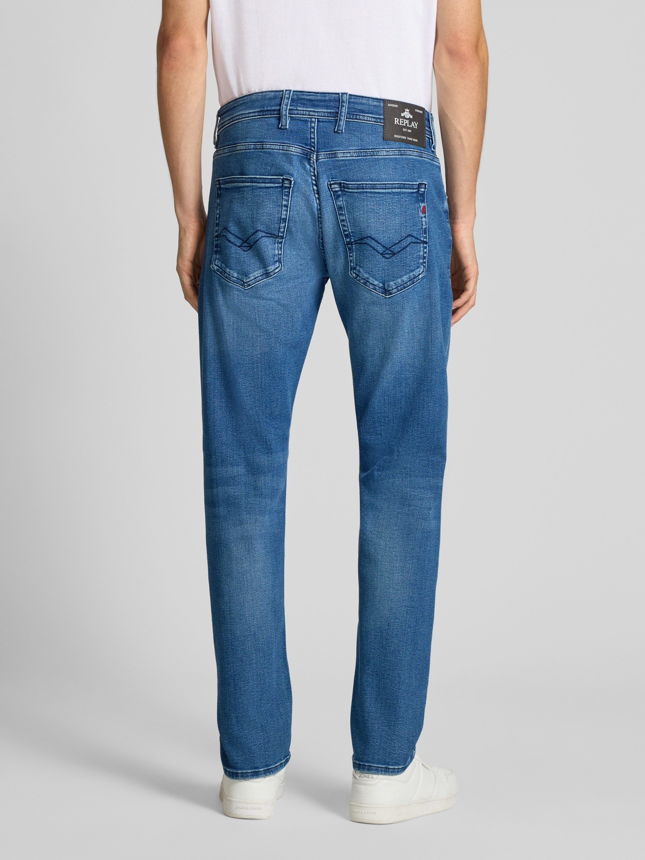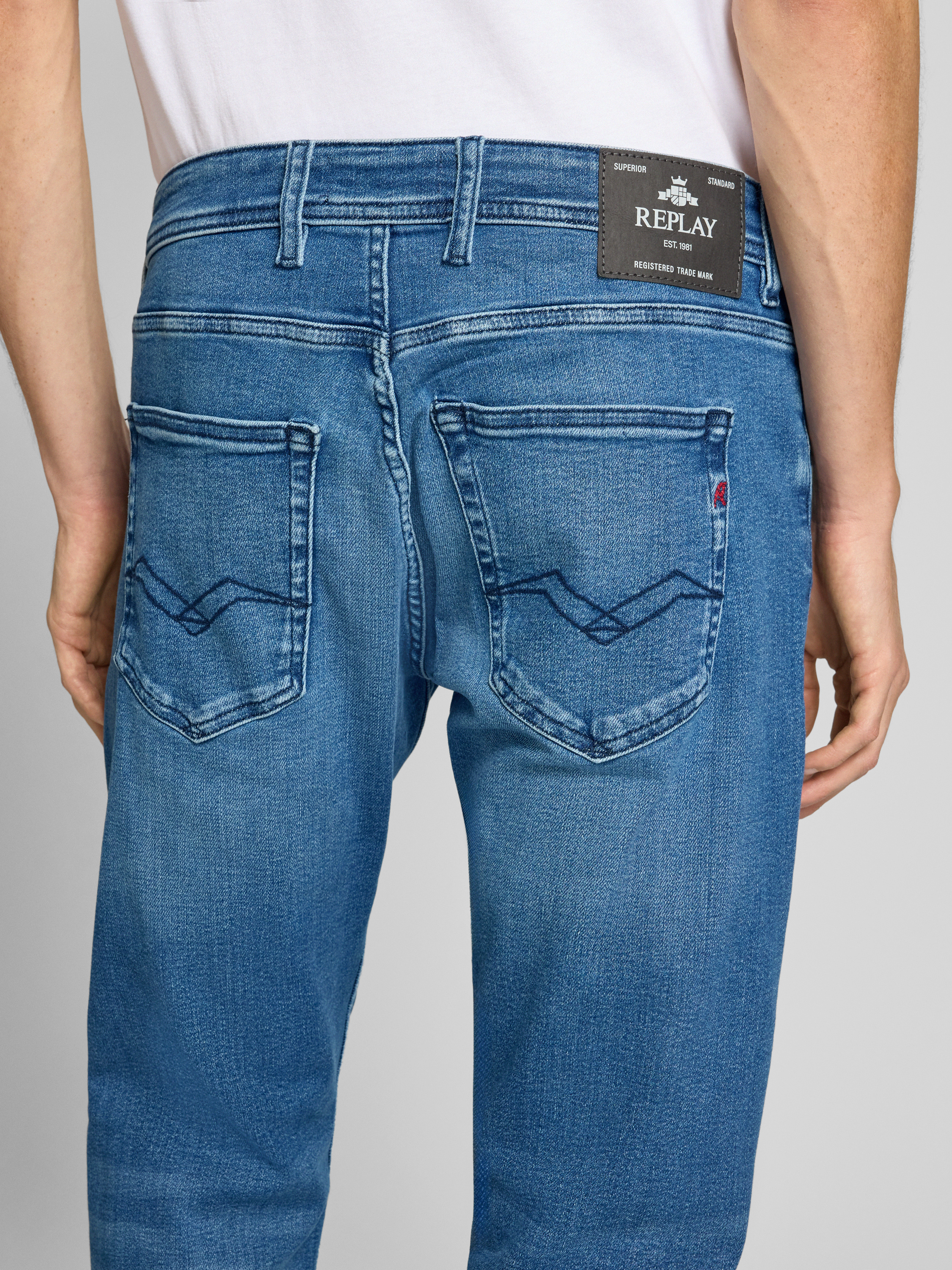 Die Herrenjeans von Replay, Modell GROVER, fällt durch ihren geraden Schnitt angenehm auf und sorgt für eine bequeme Passform im Alltag. Dank des Baumwoll-Mix mit Stretch-Anteil bleibt die Bewegungsfreiheit erhalten. Das klassische 5-Pocket-Design eignet sich für vielseitige Kombinationen.