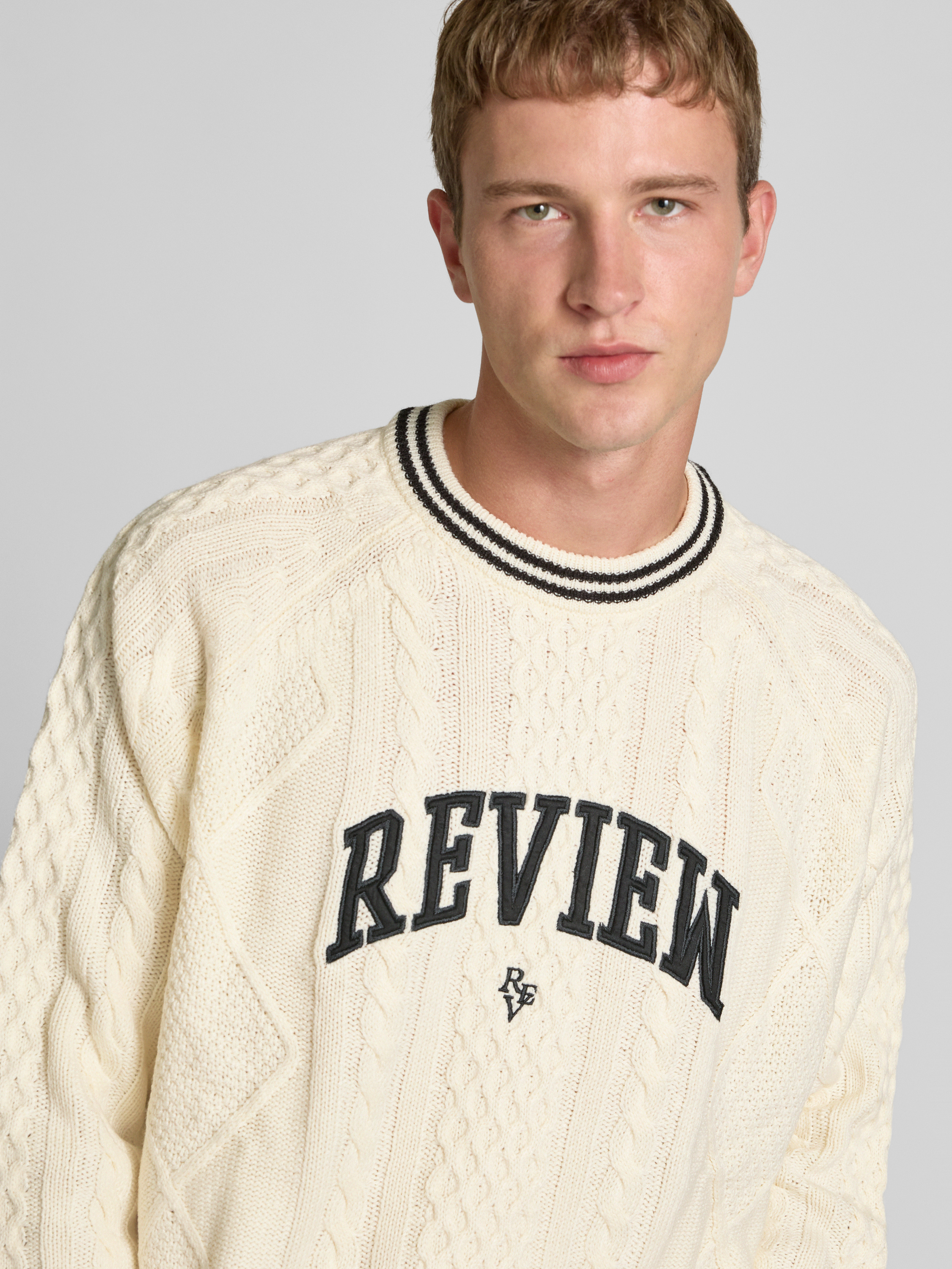 Der Herren-Strickpullover von REVIEW präsentiert sich in lockerem Schnitt und lässt durch das klassische Zopfmuster dezente Struktur erkennen. Mit Rundhalsausschnitt und markantem Label-Stitching am Saum eignet sich das Modell für entspannte Kombinationen. So entsteht ein vielseitiger Look, der Komfort und Lässigkeit verbindet.