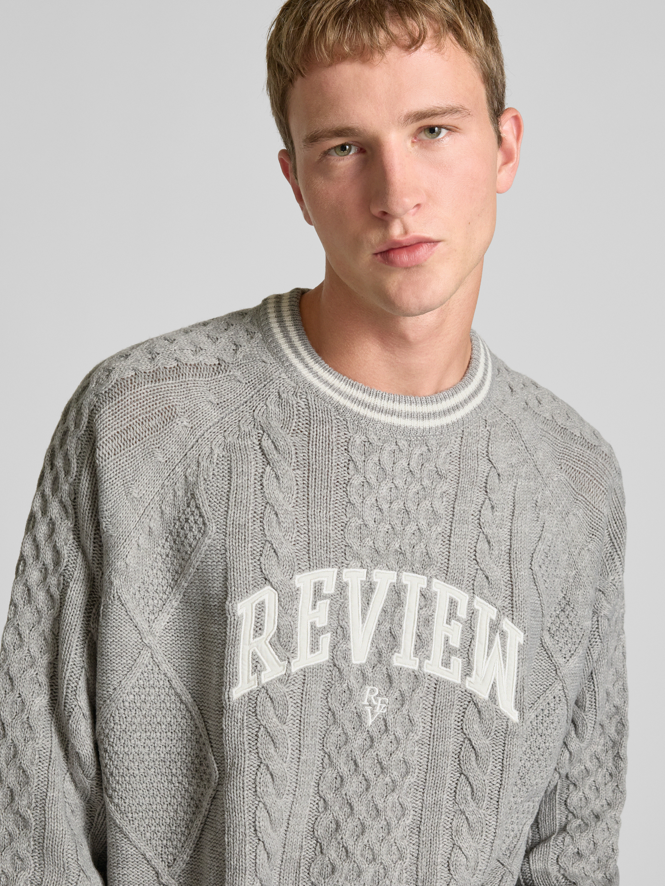Der Herren-Strickpullover von REVIEW präsentiert sich in lockerem Schnitt und lässt durch das klassische Zopfmuster dezente Struktur erkennen. Mit Rundhalsausschnitt und markantem Label-Stitching am Saum eignet sich das Modell für entspannte Kombinationen. So entsteht ein vielseitiger Look, der Komfort und Lässigkeit verbindet.