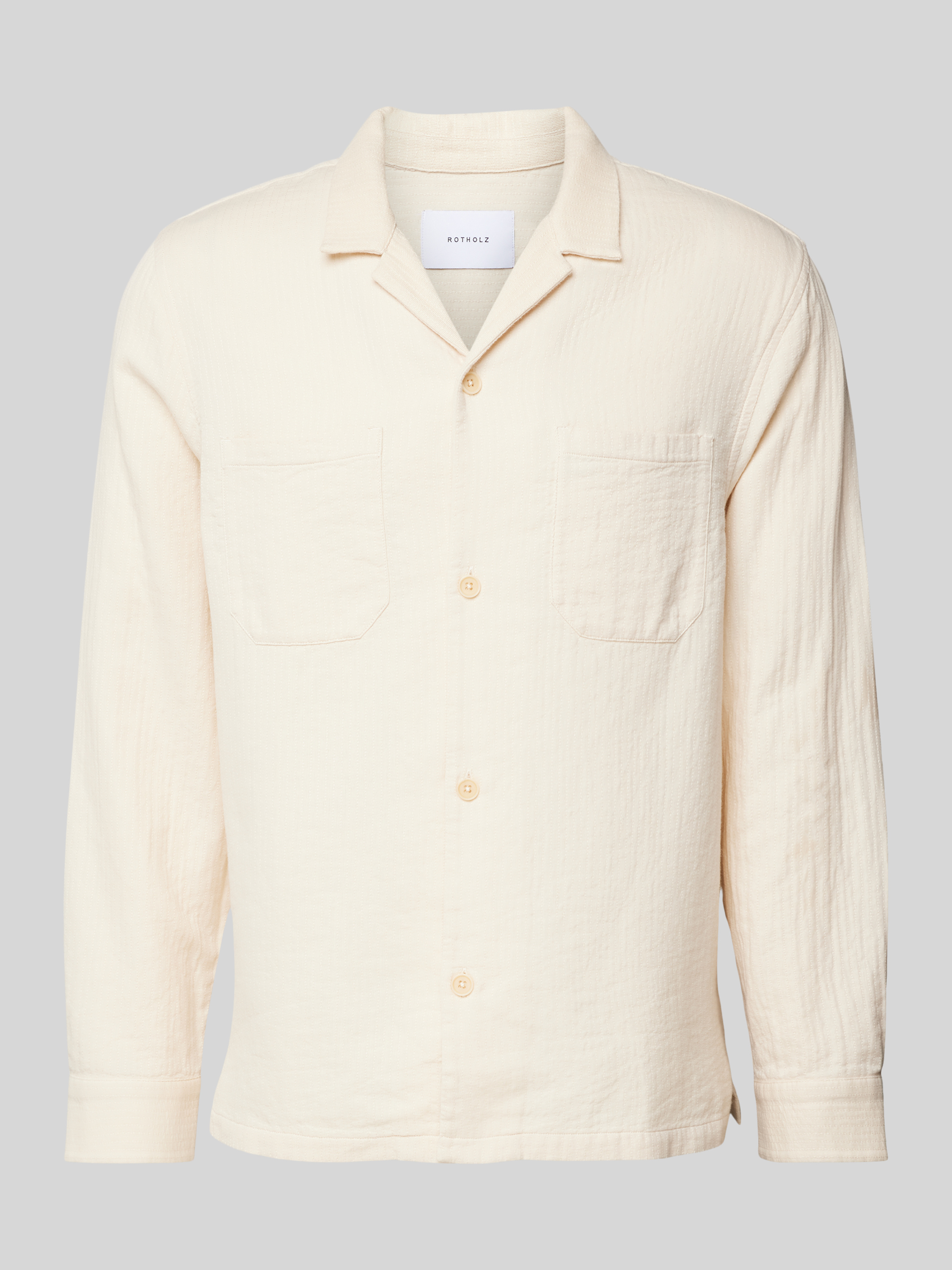 Das Regular Fit Freizeithemd 'Leisure' von ROTHOLZ aus reiner Bio-Baumwolle besticht durch sein dezentes Strukturmuster und einen lässigen Reverskragen. Es vereint Komfort und Stil und eignet sich hervorragend für entspannte Tage. Praktische Brusttaschen bieten zusätzlichen Nutzen.