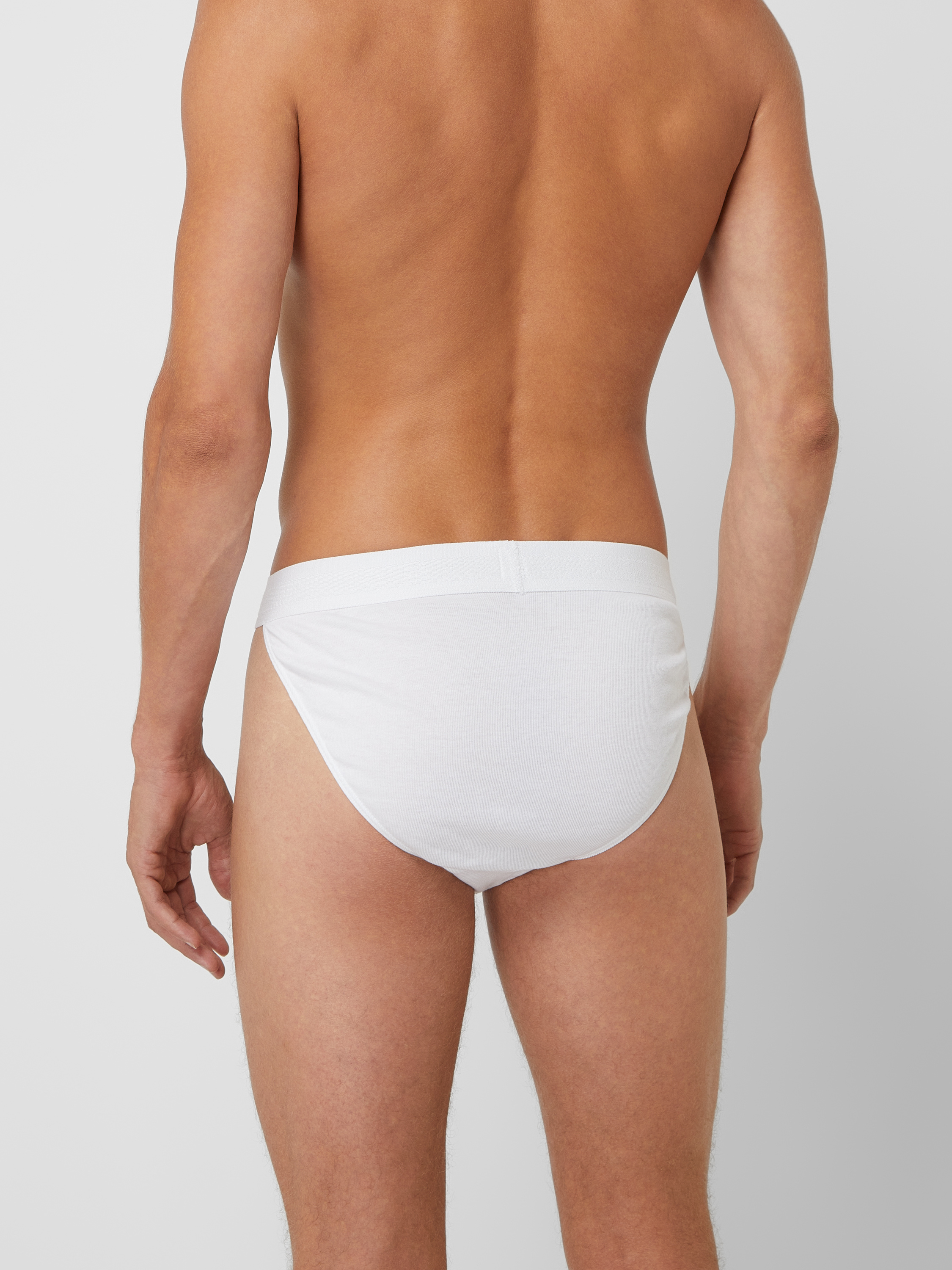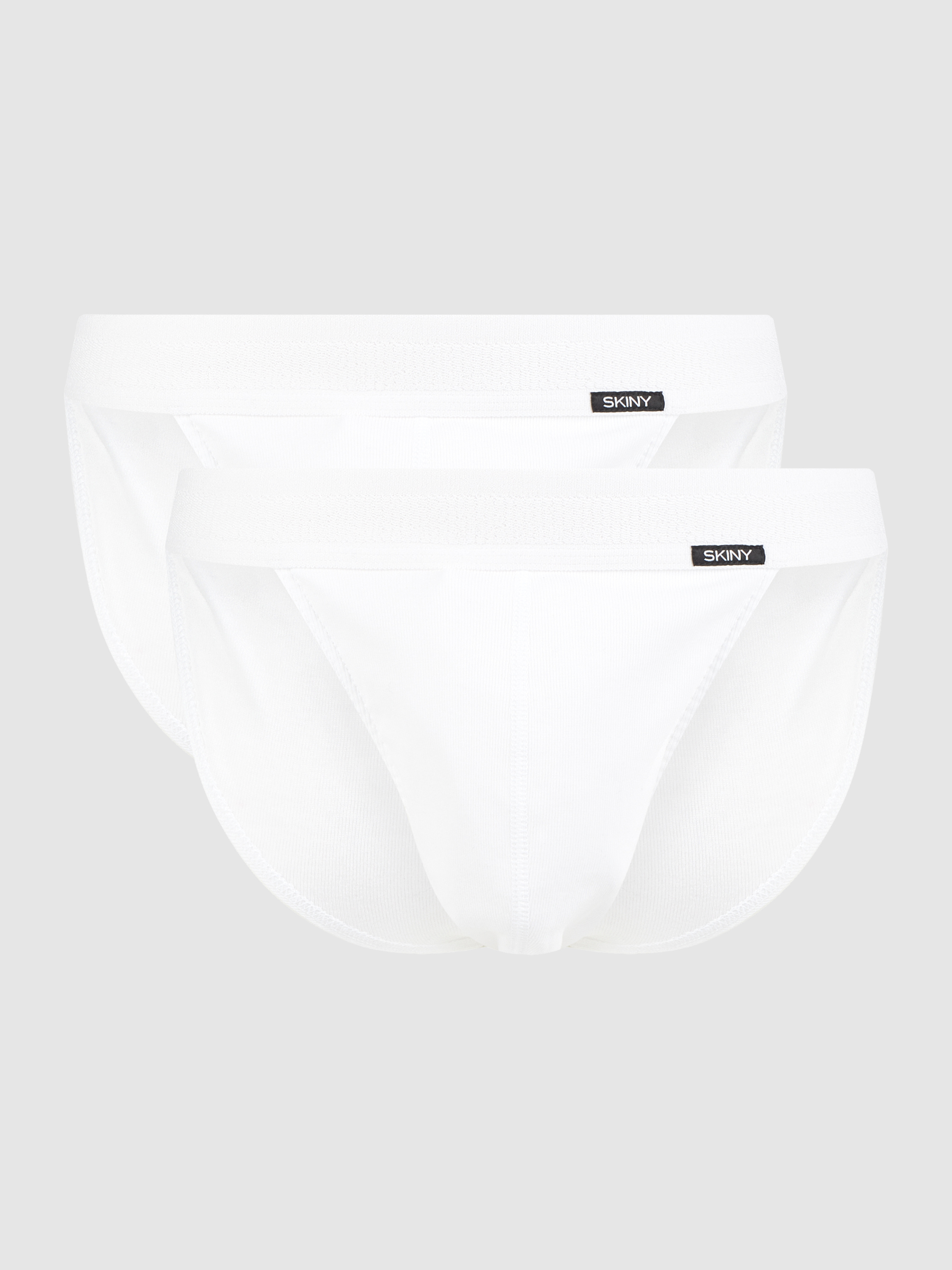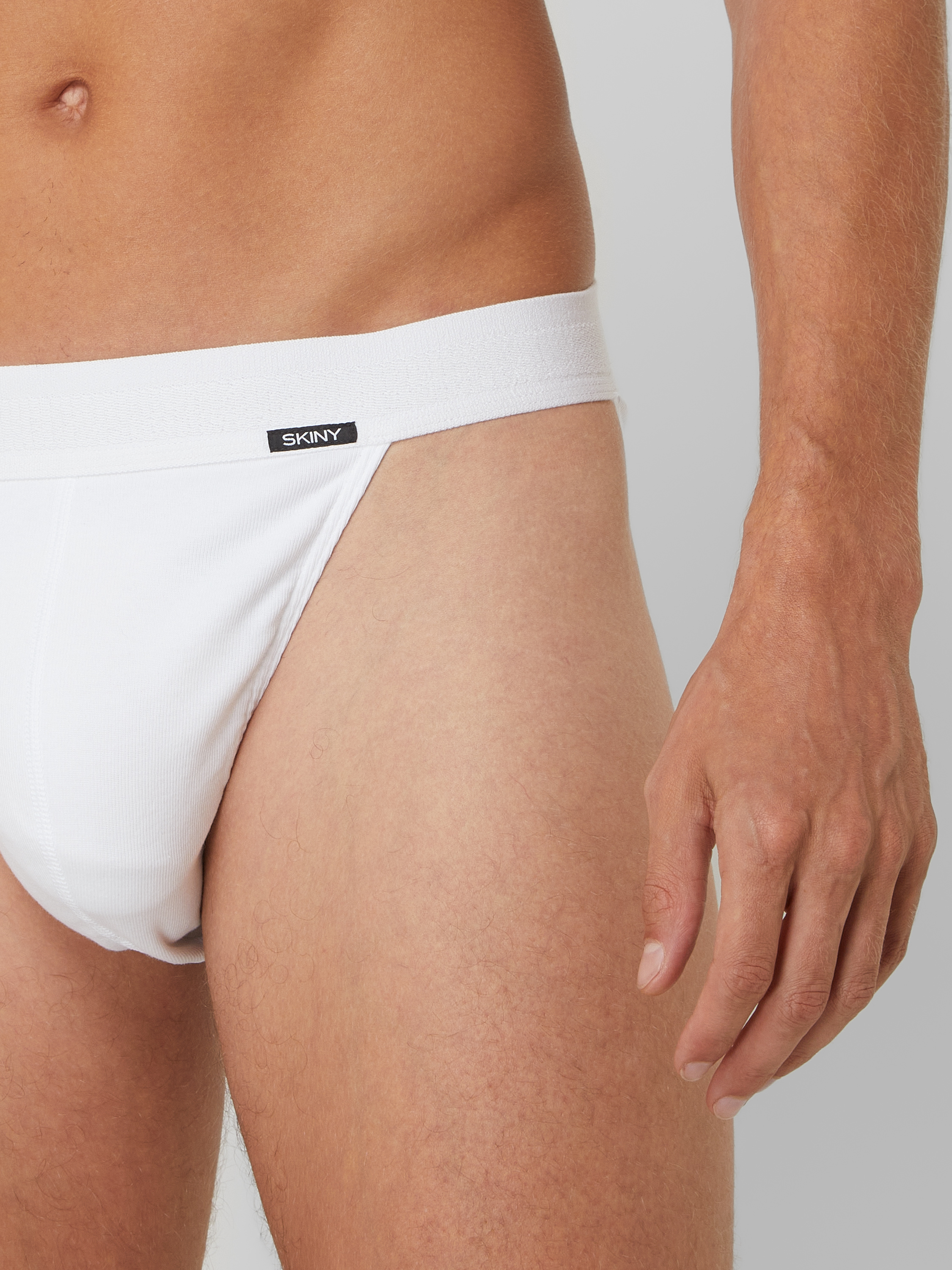 Der Tangaslip von Skiny ist aus reiner Baumwolle gefertigt und bedeckt nicht das Gesäß. Er kommt im 2er-Pack mit elastischem Bund.