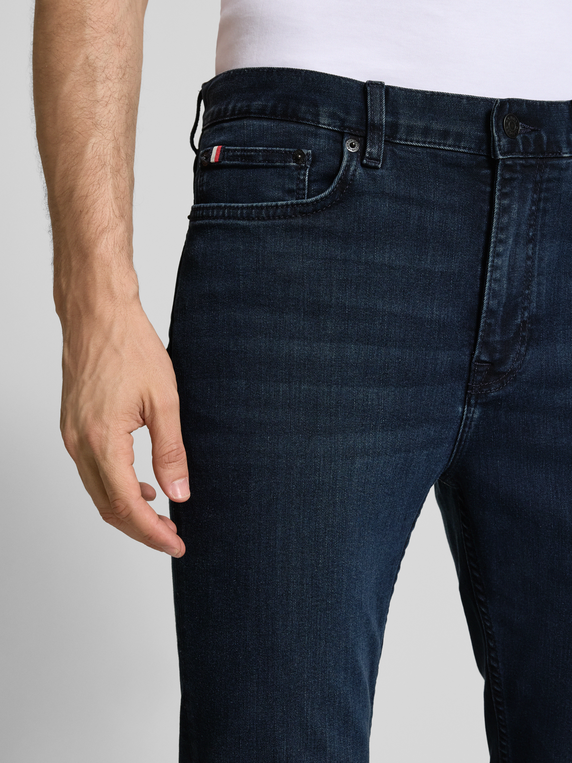 Die Slim Fit Jeans von Tommy Hilfiger verbindet eine moderne Melange-Optik mit einem komfortablen Mid Waist-Sitz. Der hochwertige Baumwoll-Mix sorgt für ein angenehmes Tragegefühl, während das klassische 5-Pocket-Design und die praktischen Gürtelschlaufen vielseitige Einsatzmöglichkeiten im Alltag bieten.