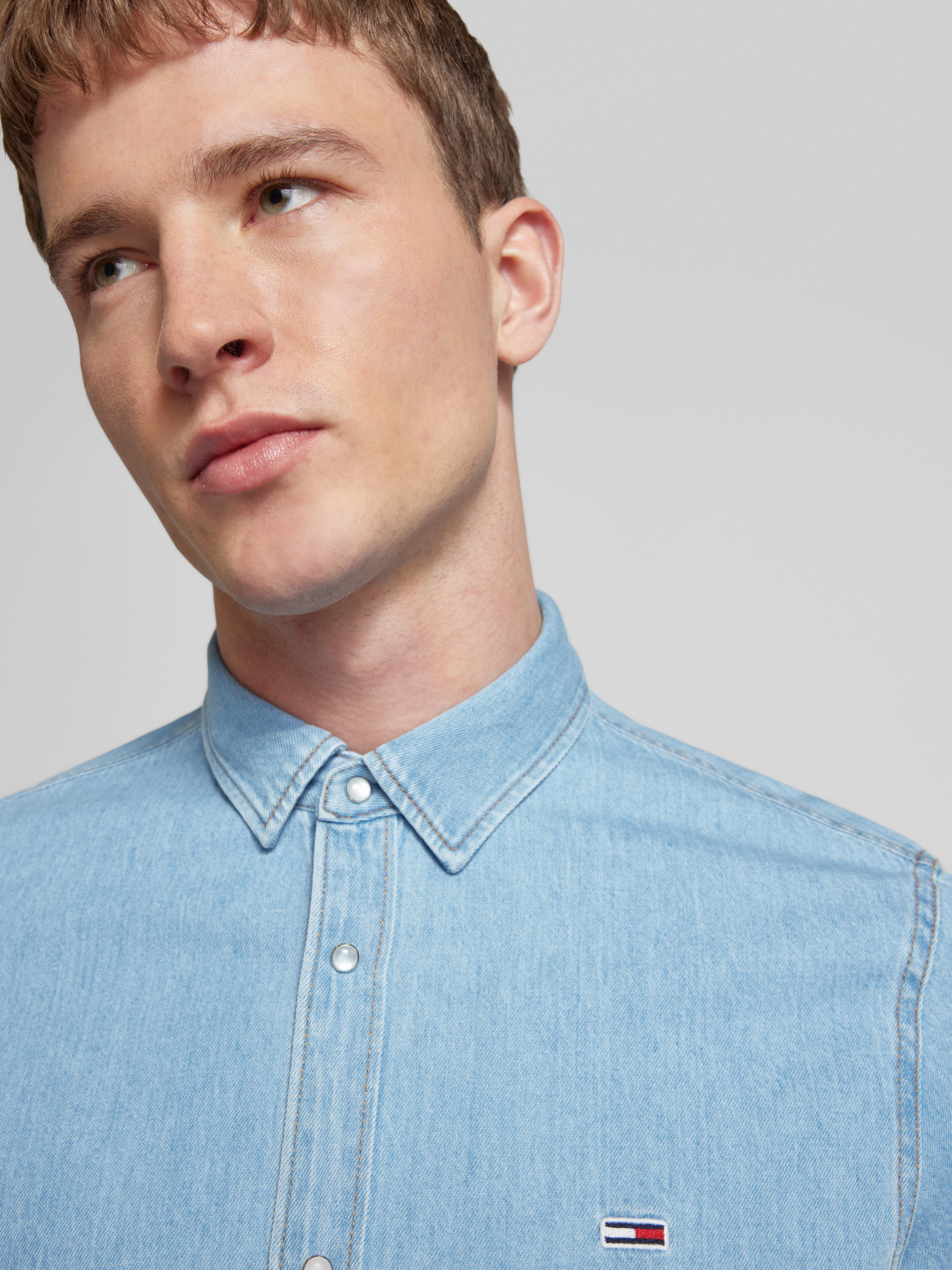Das Herren Jeanshemd von Tommy Jeans, gefertigt aus reiner Baumwolle, bietet mit seinem Regular Fit eine angenehme Passform für den Alltag. Das dezente Logo-Stitching verleiht dem Hemd einen modernen Akzent. Durch die durchgehende Druckknopfleiste entsteht ein praktischer und stilvoller Look.